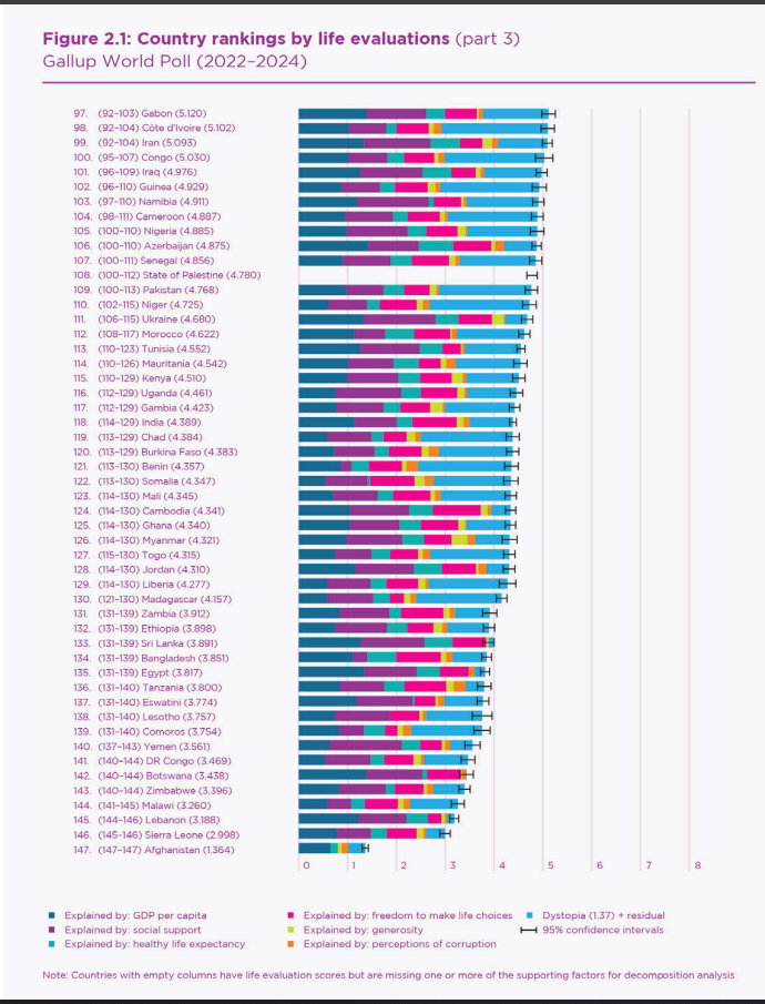 សាស្ត្រាចារ្យផ្នែកសេដ្ឋកិច្ចនៅសាកលវិទ្យាល័យ Oxford និងជានិពន្ធនាយកនៃរបាយការណ៍សុភមង្គលពិភពលោក លោក Jan-Emmanuel De Neve បាននិយាយថា កត្តាសំខាន់ៗដែលរួមចំណែកដល់សុខុមាលភាពរបស់មនុស្សរួមមាន GDP ក្នុងមនុស្សម្នាក់ ការចែកចាយទ្រព្យសម្បត្តិ ស្ថានភាពសុខុមាលភាពដែលផ្តល់នូវស្ថេរភាពផ្លូវចិត្ត និងអាយុសង្ឃឹមរស់ដែលមានសុខភាពល្អ។ លោកបានឱ្យដឹងទៀតថា របាយការណ៍ឆ្នាំនេះក៏បានបង្ហាញផងដែរនូវការកើនឡើងជាទូទៅនៃបញ្ហាថប់បារម្ភ ការព្រួយបារម្ភ និងភាពតានតឹងជុំវិញពិភពលោក។