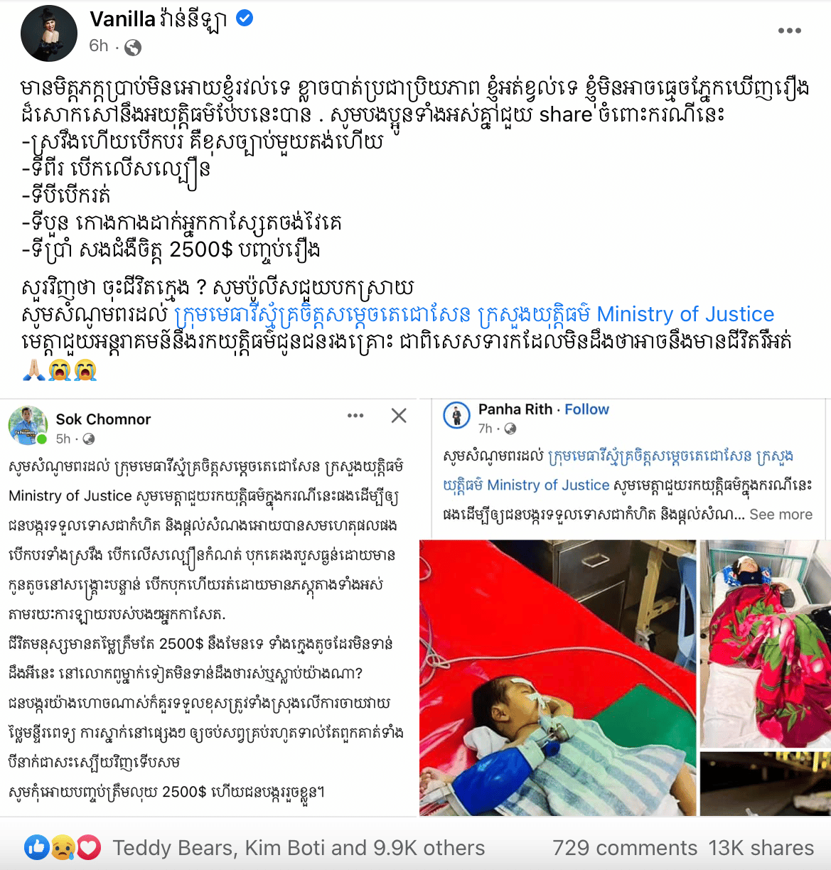 ក្រឡេកទៅមើលបុគ្គលសិល្បៈល្បីៗវិញនោះ ក៏មិនបានសំងំស្ងៀមដែរ ដោយគេឃើញមានតារាល្បីៗជាច្រើនរូប បាននាំគ្នាចេញមុខអំពាវនាវដល់ ក្រុមមេធាវីស្ម័គ្រចិត្តសម្តេចតេជោសែន និង ក្រសួងយុត្តិធម៌ Ministry of Justice ដើម្បីរកយុត្តិធម៌ជូនដល់គ្រួសារទារកដែលជួបគ្រោះថ្នាក់ចរាចរណ៍នោះ។ បច្ចុប្បន្ន នារីជាម្តាយទារកបានដឹងខ្លួនហើយ ចំណែកបុរសអ្នកបើកបរម៉ូតូ (មិត្តភ័ក្តនារីជាម្តាយ) ប្រេះលលាដ៏ក្បាល កំពុងស្ថិតក្នុងការសង្រ្គោះរបស់ក្រុមគ្រូពេទ្យ។