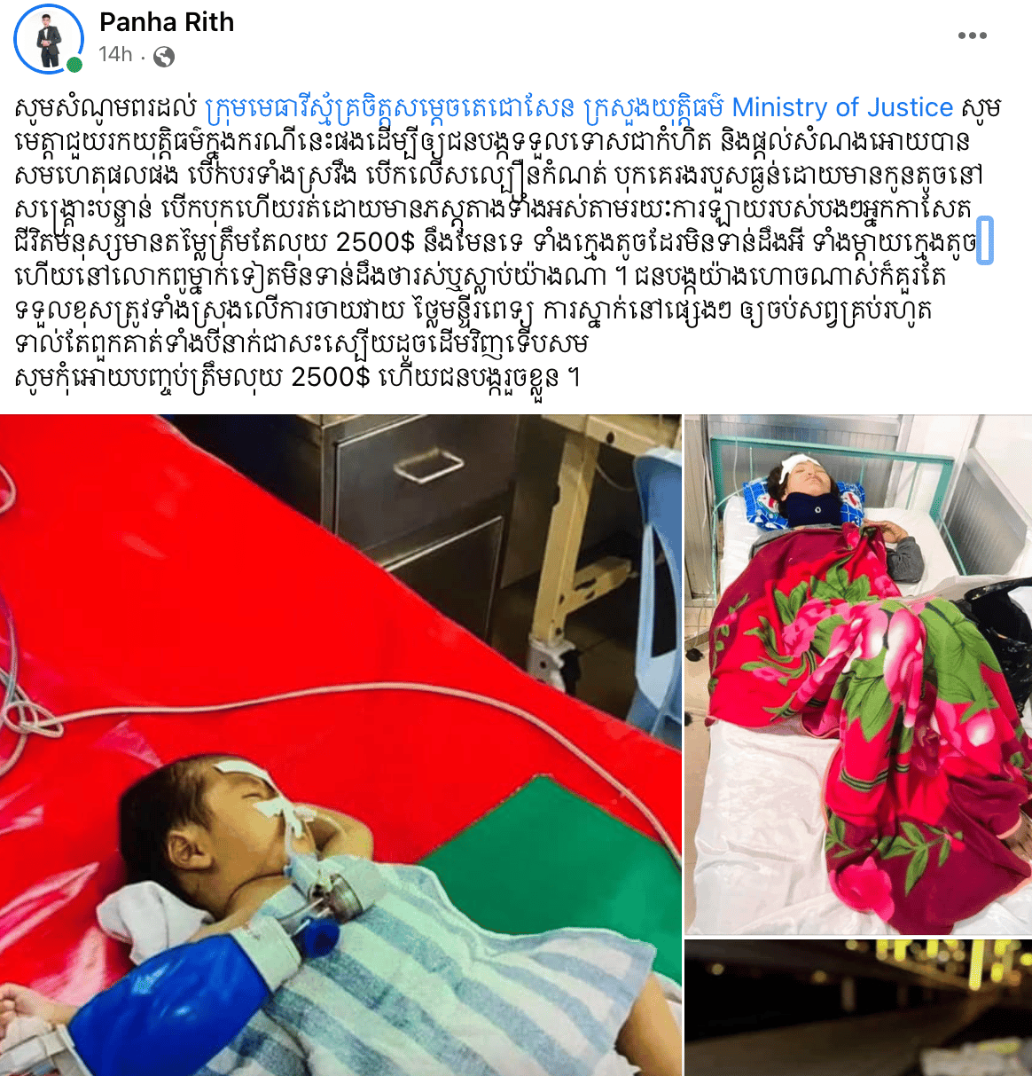 ហេតុការណ៍គ្រោះថ្នាក់ចរាចរណ៍ដ៏រន្ធត់ដែលបានកើតឡើងលើស្ពានជ្រោយចង្វាបណ្តាលឱ្យបុរស-ស្រ្តី ២ នាក់ និងទារកម្នាក់ រងរបួសយ៉ាងធ្ងន់ធ្ងរ កាលពីវេលាម៉ោង២រំលងអាធ្រាតឈានចូលថ្ងៃទី៥ ខែធ្នូ ឆ្នាំ ២០២២ បានកំពុងក្លាយជារឿងដ៏រសើបលើបណ្តាញសង្គមហ្វេសប៊ុក បន្ទាប់ពីភាគីបង្កហេតុសម្រេចសងសំណងទៅជនរងគ្រោះចំនួន ២ ៥០០ដុល្លារ។