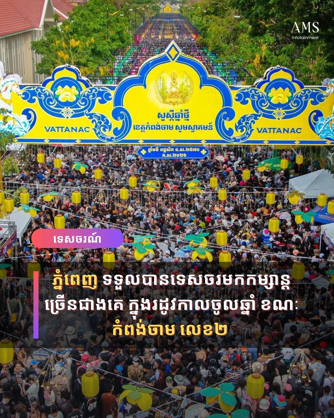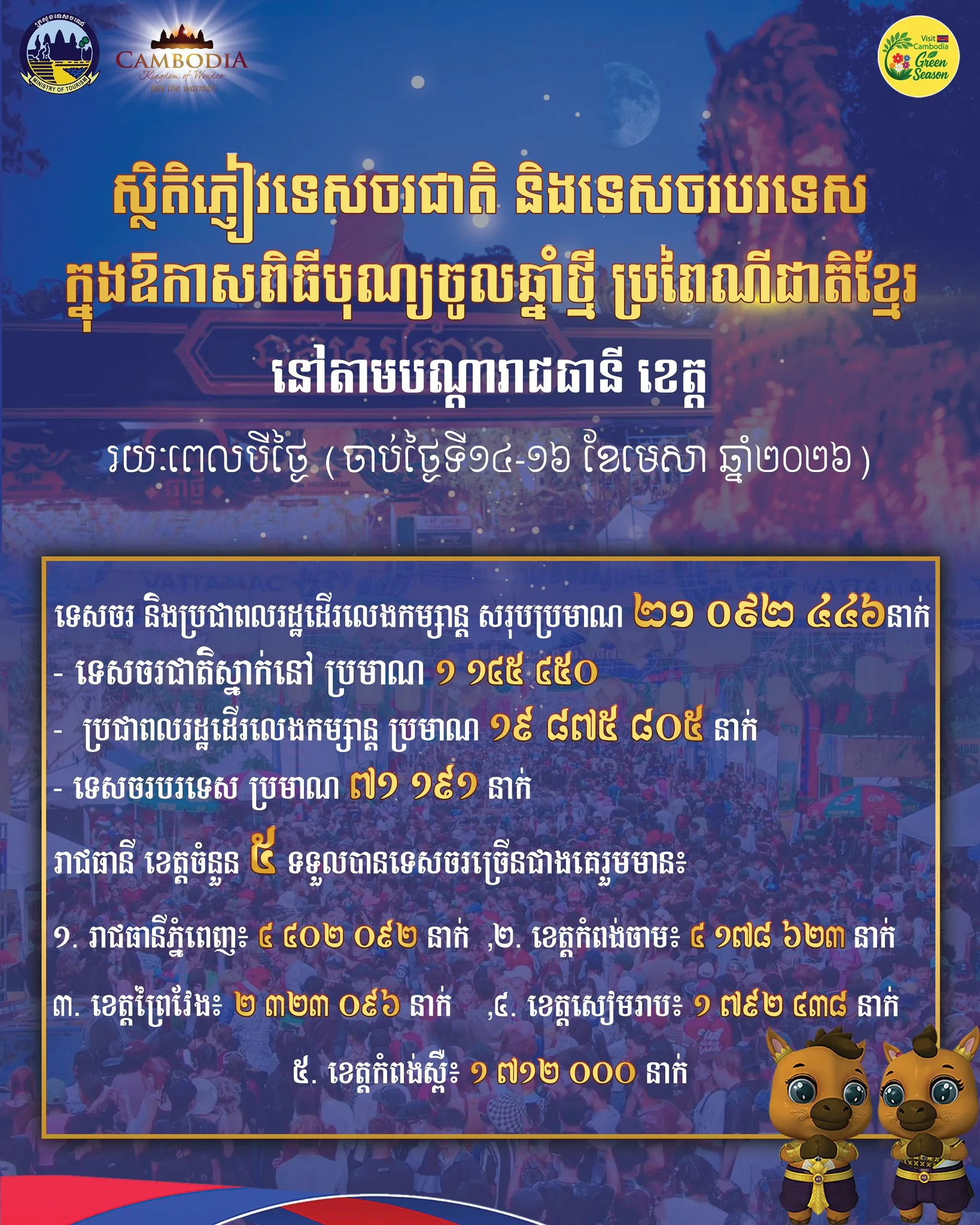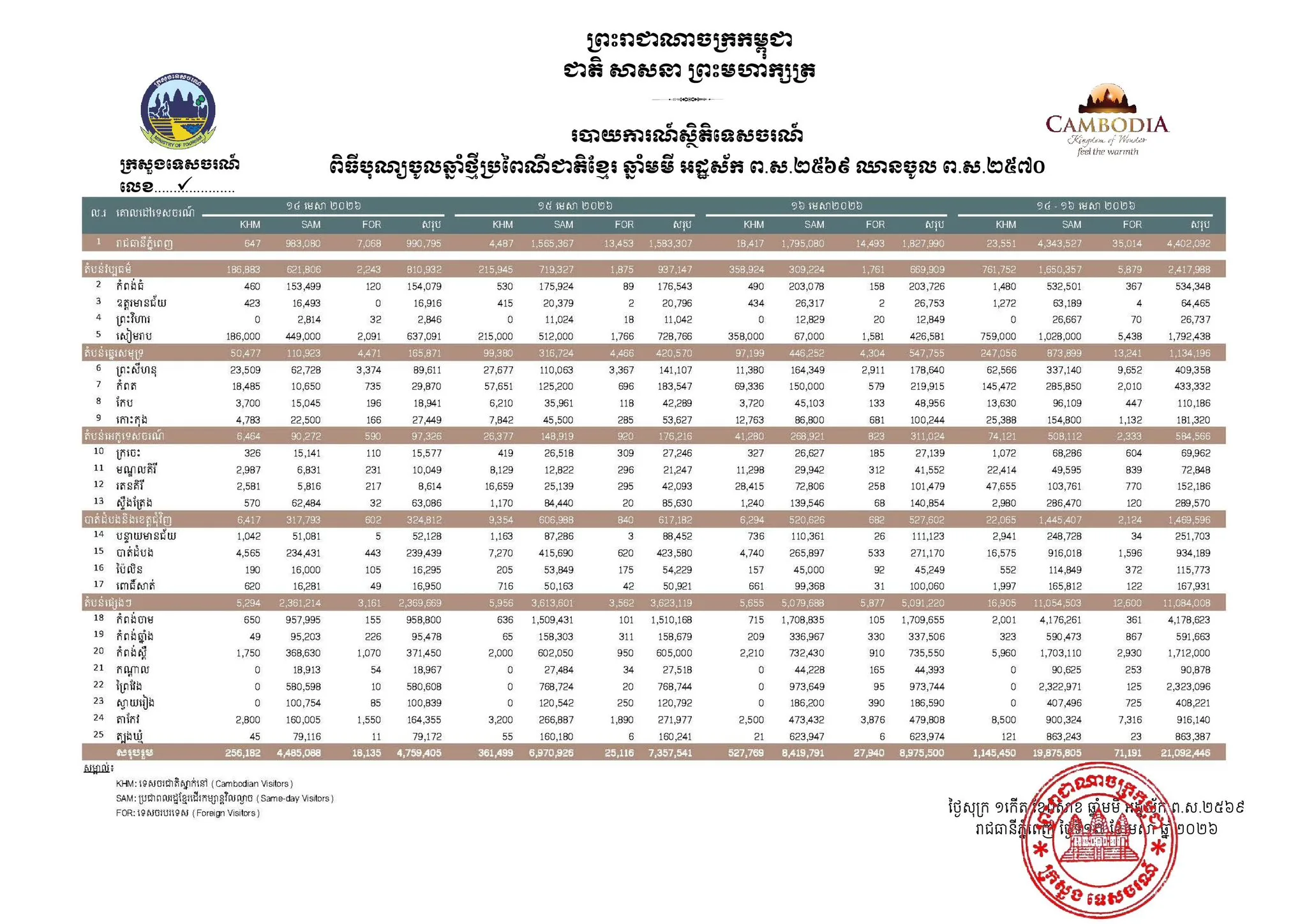 ក្នុងរយៈពេល ៣ ថ្ងៃនៃពិធីបុណ្យចូលឆ្នាំថ្មីប្រពៃណីជាតិខ្មែរ គិតចាប់ពីថ្ងៃទី ១៤ ដល់ ១៦ ខែ មេសា ឆ្នាំ ២០២៦ កម្ពុជាទទួលបានទេសចរជាតិ-អន្តរជាតិ មកលេងកម្សាន្តសរុប គិតជាតួលេខ ២១ ០៩២ ៤៤៦ នាក់។ នេះបើតាមការប្រកាសជូនដំណឹងនៅលើផេកផ្លូវការក្រសួងទេសចរណ៍កាលពីថ្ងៃទី ១៧ ខែ មេសា ឆ្នាំ ២០២៦។ ក្នុងនោះ ១ ១៦៥ ៤៥០ នាក់ជាទេសចរស្នាក់ , ១៩ ៨៧៥ ៨០៥ នាក់ជាពលរដ្ឋដើរលេងកម្សាន្ត និង ៧១ ១៩១ នាក់ជាទេសចរបរទេស។