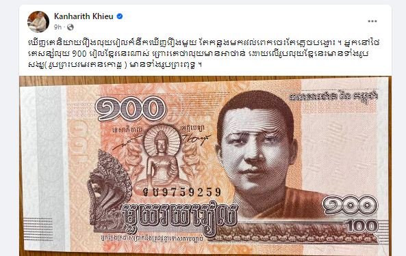 បើតាមការបង្ហោះលើទំព័រហ្វេសប៊ុករបស់ឯកឧត្ដម ខៀវ កញារីទ្ធ អតីតរដ្ឋមន្ត្រីក្រសួងព័ត៌មានបានសរសេរថា អ្នកនៅប្រទេសថៃ បានសន្សំលុយរៀលខ្មែរ ក្រដាស ១០០រៀលព្រោះគេជឿថាលុយមានអាថាន់ ដោយលើរូបលុយខ្មែនេះ មានទាំងរូបសង្ឃ( រូបព្រះបរមរតនកោដ្ឋ ) មានទាំងរូបព្រះពុទ្ធ។