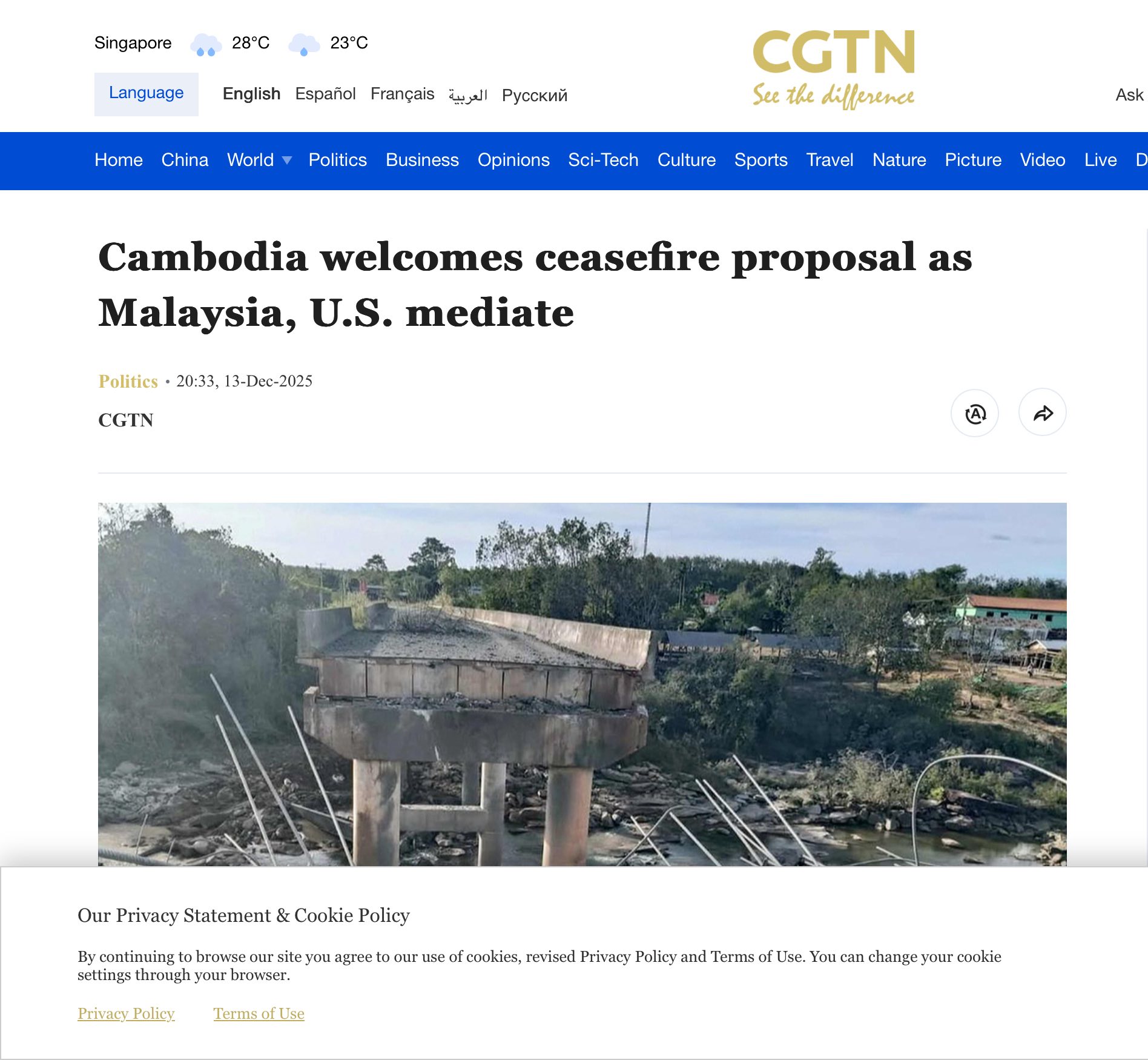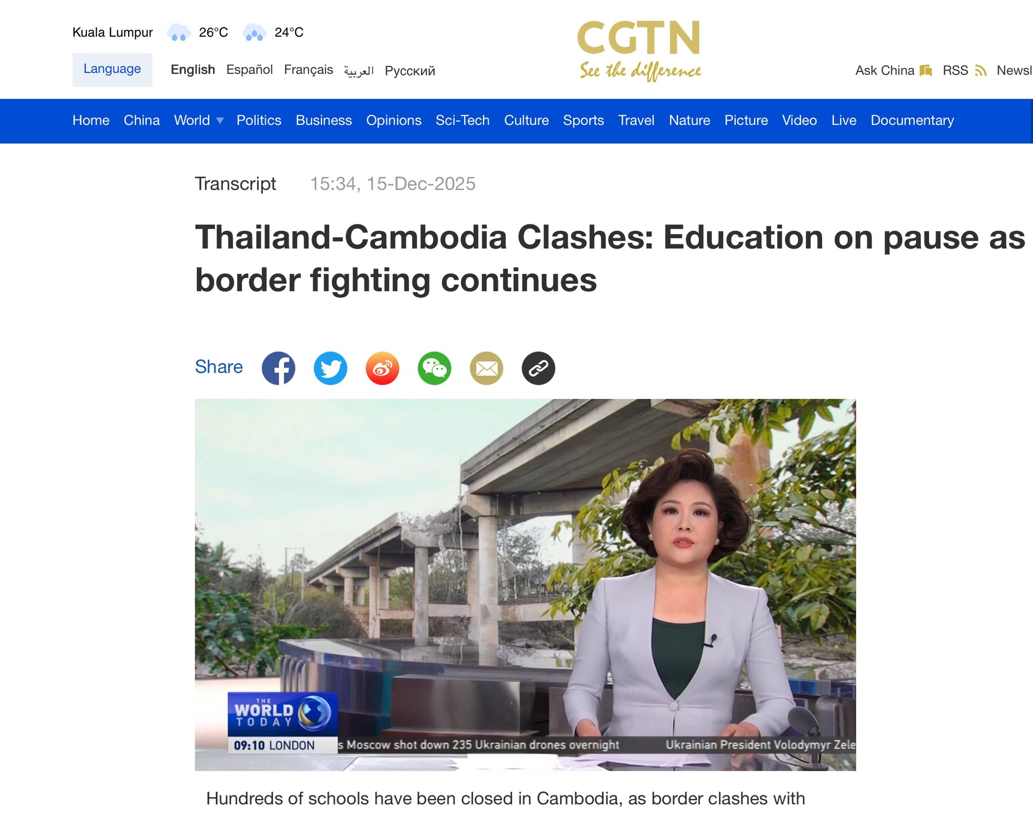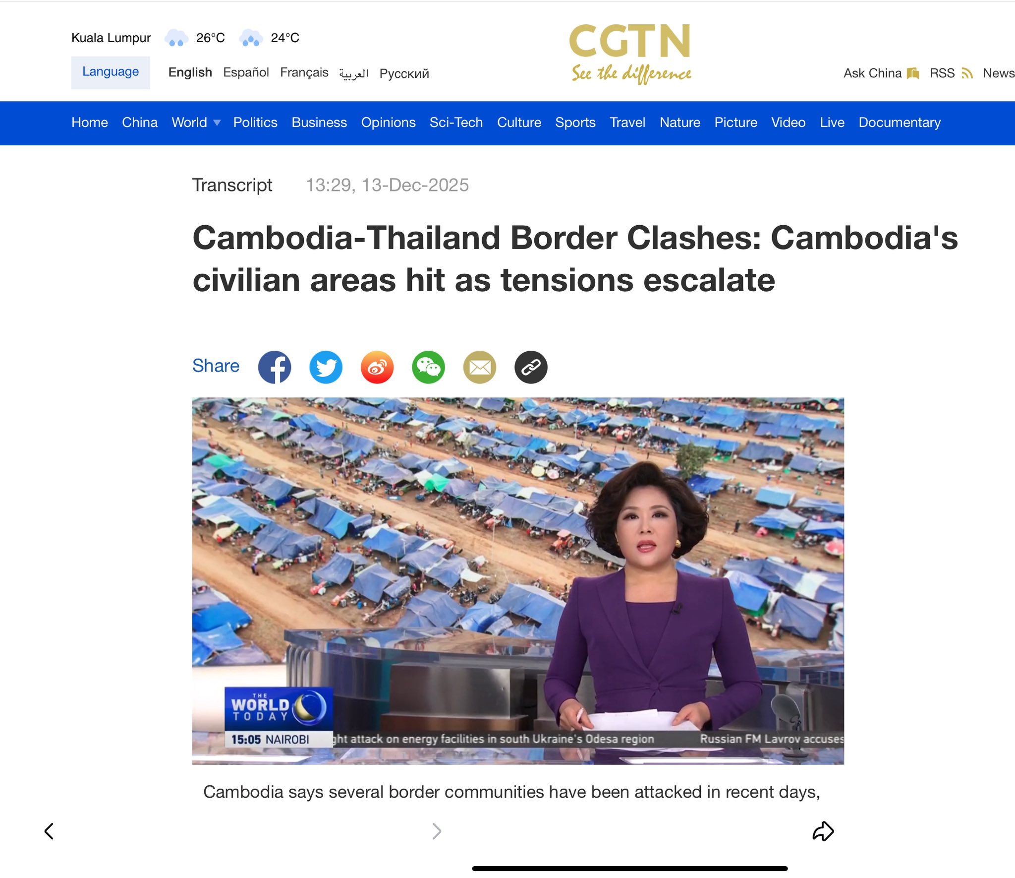 គួរ​ឱ្យ​ដឹង​ថា ក្រុម​ការងារ​នៃ​អង្គភាព​សារព័ត៌មាន CGTN បាន​ចុះ​​មក​ដល់​ប្រទេស​កម្ពុជា​ដើម្បី​ផ្ដិត​យក​ស្ថានភាព​ពិត​ប្រាកដ​នៃ​ការ​រង​គ្រោះ​របស់​កម្ពុជា ក៏​ដូច​ជា​ប្រជាជន​ផ្ទាល់​ក្នុង​តំបន់​ភៀស​សឹក​រាប់​ម៉ឺន​គ្រួសារ​ដែល​កំពុង​ជួប​ការ​លំបាក​ក្នុង​ភ្លើង​សង្គ្រាម​ដែល​បង្ក​ឡើង​ដោយ​ទាហាន​សៀម៕