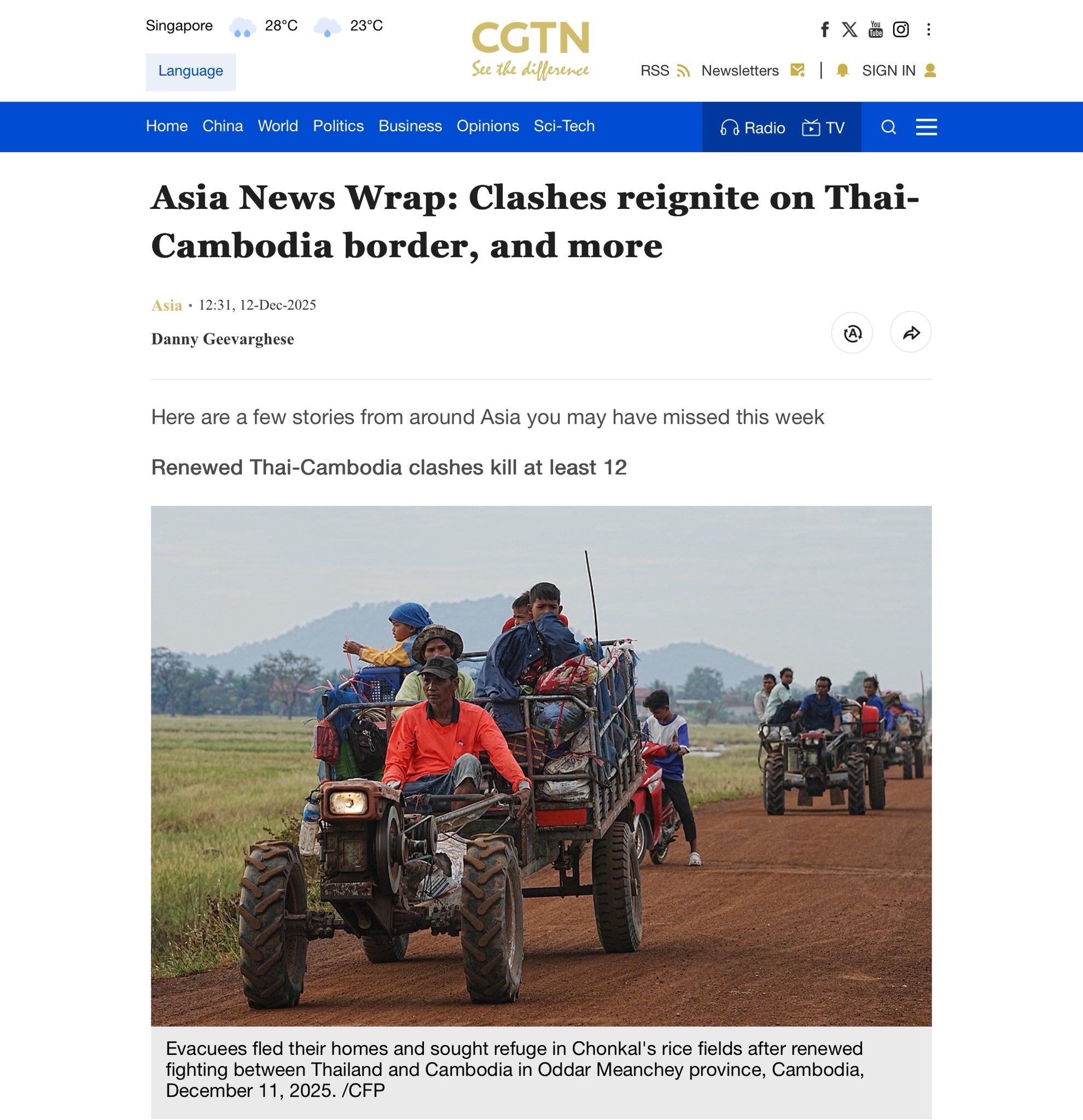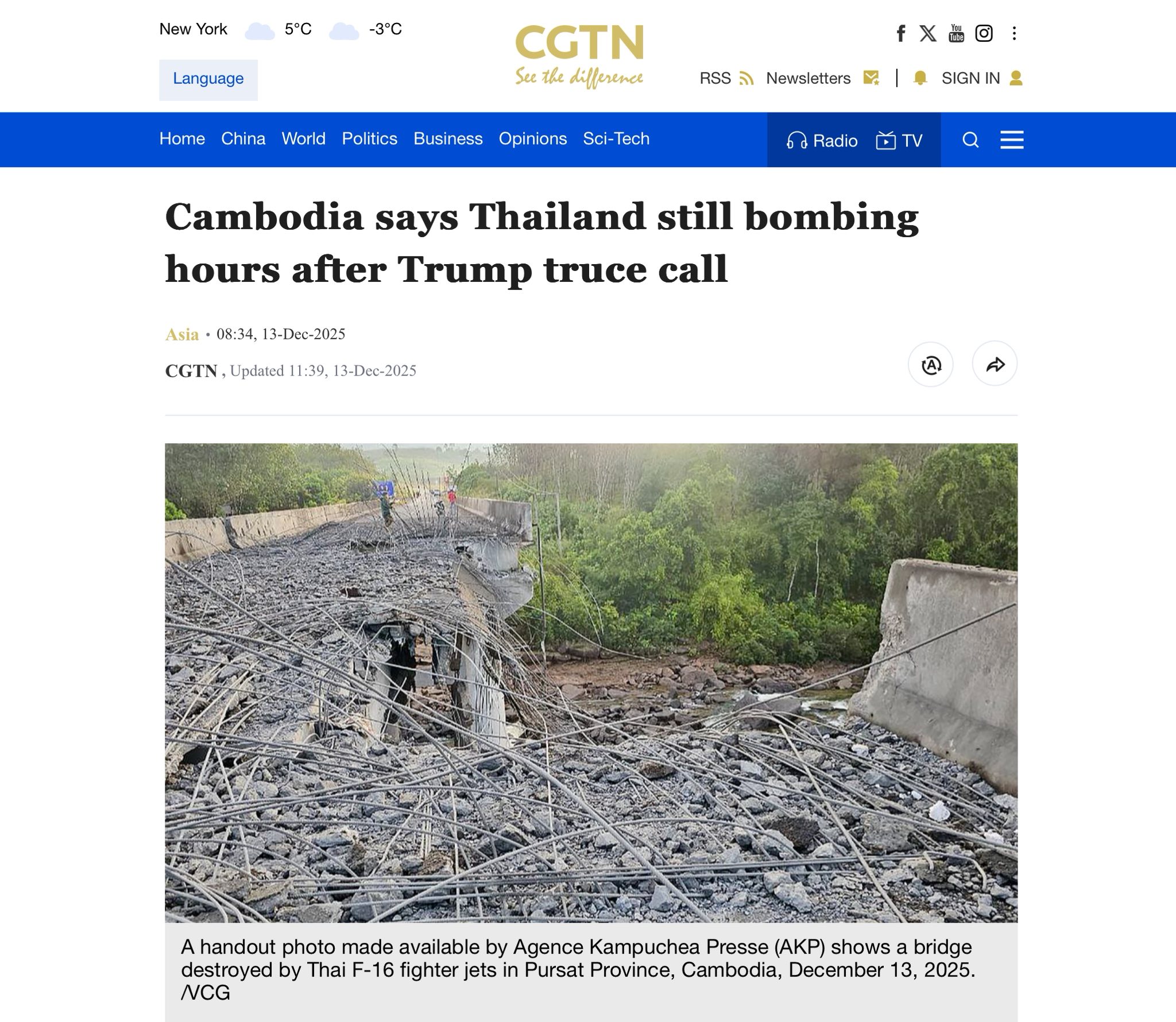 សារព័ត៌មាន CGTN (China Global Television Network) ដែល​ជា​អង្គភាពផ្សព្វផ្សាយអន្តរជាតិចិន និង​ជាចំ​នែកមួយនៃ China Media Group (CMG) បាន​ចុះ​ផ្សាយ​អំពី​ផល​ប៉ះពាល់​របស់​កម្ពុជា​ដែល​បង្ក​ឡើង​ដោយ​សង្គ្រាម​ឈ្លាន​ពាន​ទឹក​ដី​ន​កង​ទ័ព​សៀម។ ចំណង​ជើង​ធំៗ ជា​ភាសា​អង់គ្លេស​ដែល CGTN បាន​ដាក់​មាន​ដូច​ជា «កម្ពុជាស្វាគមន៍សំណើបទឈប់បាញ់ដែលសម្របសម្រួលដោយម៉ាឡេស៊ី និងសហរដ្ឋអាម៉េរិក, កម្ពុជាថាថៃនៅបន្តទម្លាក់គ្រាប់បែកបន្ទាប់ពីមានការអំពាវនាវឱ្យមានបទឈប់បាញ់ពីលោកត្រាំ, ជម្លោះព្រំដែនកម្ពុជា-ថៃ៖ តំបន់ជនស៊ីវិលត្រូវបានប៉ះពាល់ និងការអប់រំត្រូវបានផ្អាកក្រោយពីការប្រយុទ្ធនៅតែបន្ត…ជាដើម»។