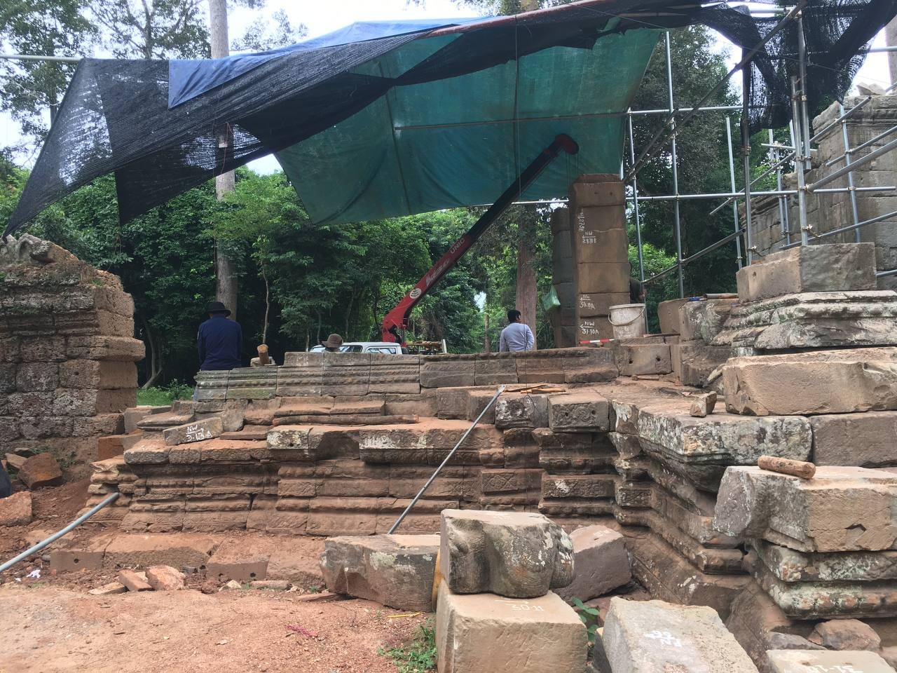 លោកស្រី នេត ស៊ីមន ឱ្យដឹងទៀតថា កាលពីឆ្នាំ២០២២ ក្រុមការងារធ្លាប់បានសិក្សាគ្រឹះ និងបានរកថ្មដែលរលុះធ្លាក់ ហើយការជួសជុលខ្លោងទ្វារប្រៀបធៀបដូចជារៀបប្រាសាទពីរនៅជិតគ្នា ហើយបញ្ចូលគ្នាតែមួយ ដោយធ្នឹមភ្ជាប់គ្នារួចទើបរៀបថ្មមានមុខ ៤ ដាក់ពីលើ។ ការងាររបៀបនេះ បានធ្វើឱ្យក្រុមការងារជួបការលំបាកមួយចំនួនដែរ។
