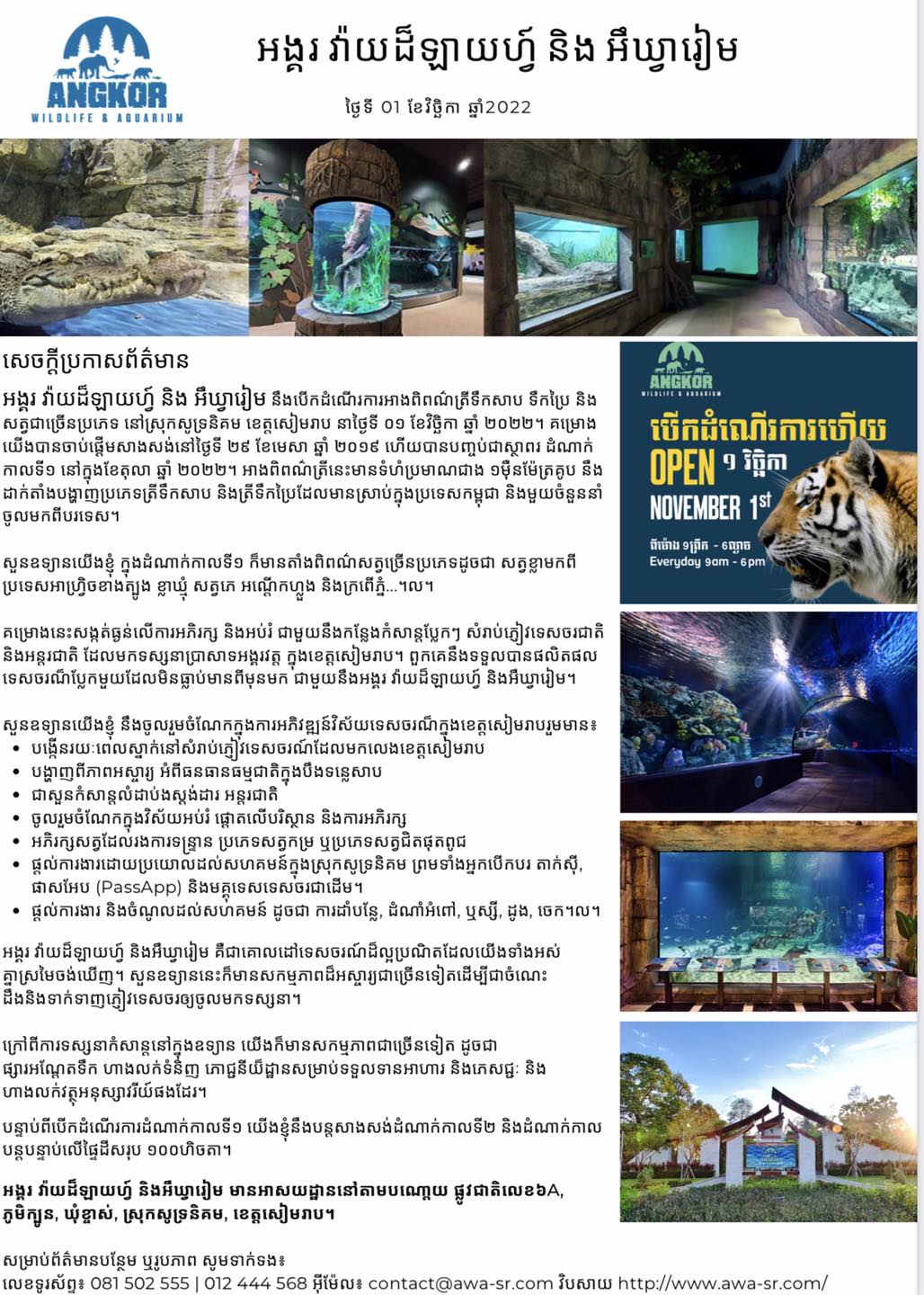អាង​ពិព័រណ៍​ត្រី​ទឹកសាប ទឹកប្រៃ និង សត្វជាច្រើនប្រភេទ របស់ក្រុមហ៊ុន Angkor Wildlife and Aquarium នឹង​បើក​ដំណើរការ​ចាប់ពី​ថ្ងៃ​ទី ០១ ខែ​វិច្ឆិកា ឆ្នាំ ២០២២ នេះ​តទៅ។