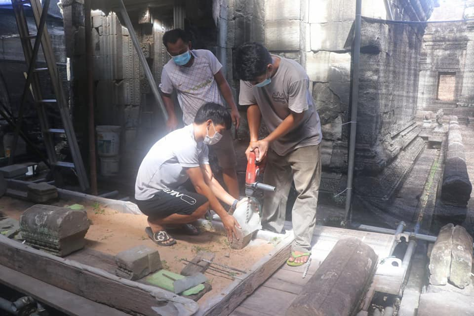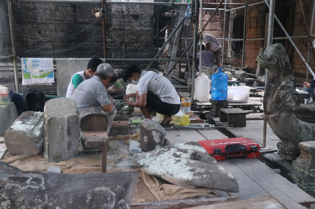 លោក ឡុង ណារី បន្តទៀតថា ការជួសជុលថ្ម ព្យាបាលថ្ម តភ្ជាប់បំណែកថ្មឡើងវិញនោះ គឺប្រើប្រាស់ការស្វានដាក់ស្នួលតភ្ជាប់បំណែកដងខ្លួននាគ។ ការជួសជុលនេះ ផ្តោតសំខាន់ទៅលើការដាប់ជើងទម្រចាស់ៗជាច្រើនបំណែក និងដងខ្លួននាគដែលបានប្រេះបែកទាំងស្រុងចេញពីគ្នាប្រឈមការរលំបាក់។ បន្ទាប់មក ក្រុមការងារបានពង្រឹងផ្ទៃថ្មដែលពុកផុយ ឱ្យរឹងមាំឡើងវិញ ចាក់បំពេញបាយអចូលក្នុងប្រហោង និងតំណបិទភ្ជិតរន្ធតូចឆ្មារស្នាមប្រេះ និងប្រហោងតូចៗនៅលើផ្ទៃថ្មចម្លាក់ សម្អាតស្លែ និងបន្សាបយកជាតិអំបិលចេញពីផ្ទៃថ្ម ដាប់យកចេញដែកទាមចាស់ៗ និងស៊ីម៉ងត៍អស់គុណភាព រៀបដំឡើងបង្កាន់ដៃនាគឡើងវិញស្របតាមទីតាំងដើម។