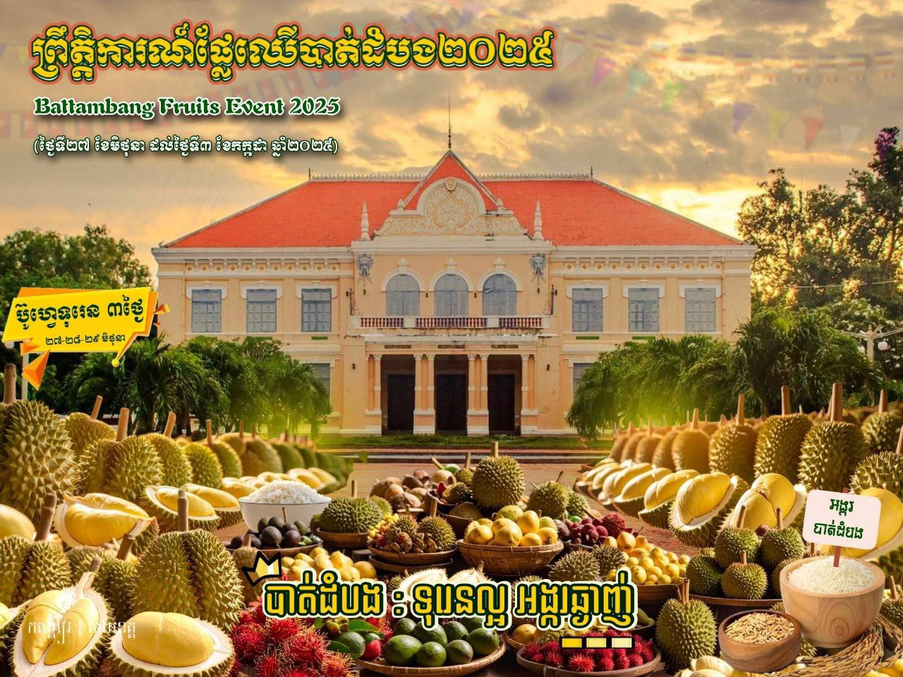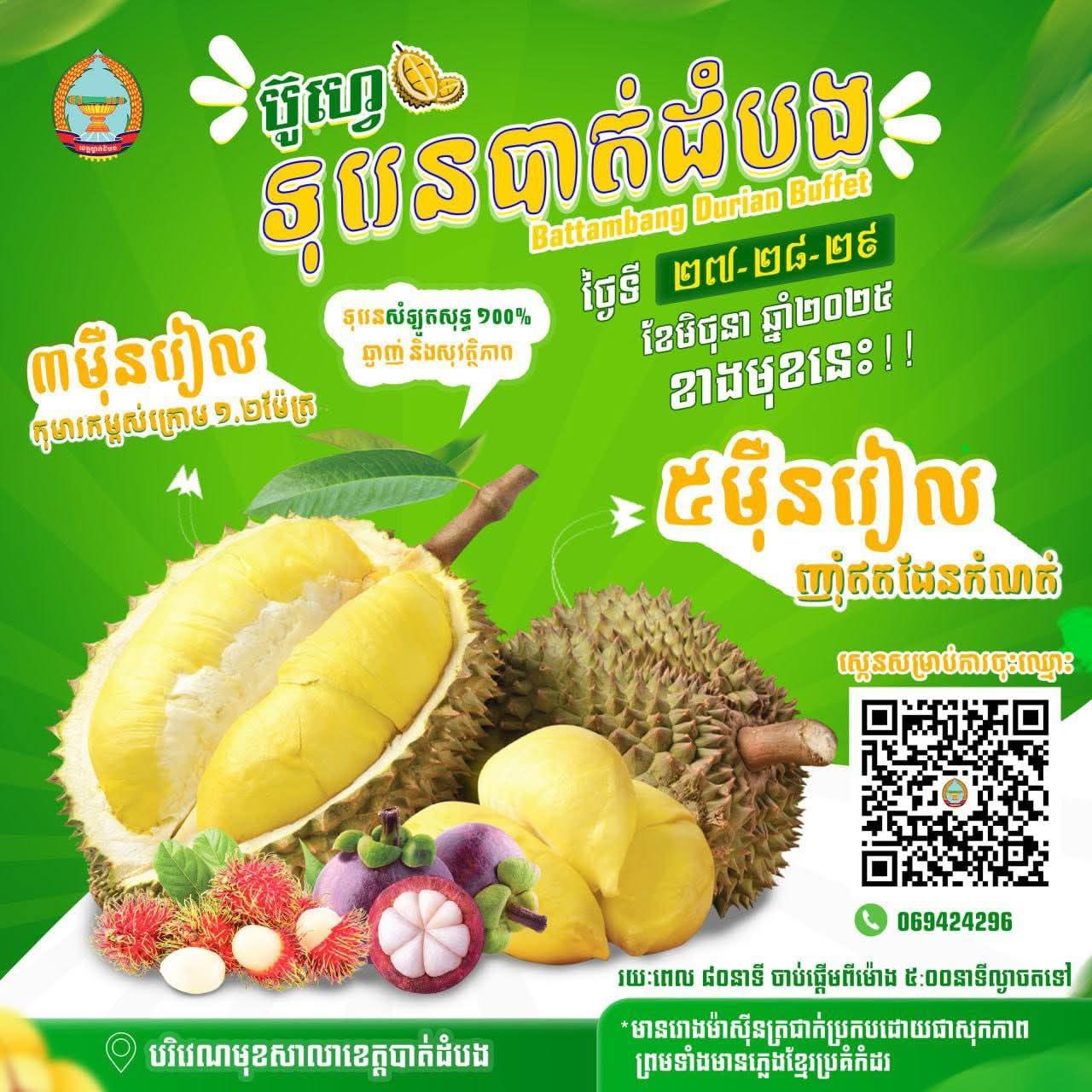 ត្រៀមៗខេត្តបាត់ដំបងរៀបចំកម្មវិធីប៊ូហ្វេទុរេន កណ្ដាលក្រុងរយៈពេល ៣ ថ្ងៃជាប់គ្នា ដើម្បីអបអរព្រឹត្តិការណ៍ផ្លែឈើបាត់ដំបង ២០២៥ ដោយអ្នកចូលរួមអាចពិសាទុរេនដោយសេរីឥតដែនកំណត់ និងត្រូវចុះឈ្មោះជាមុន។