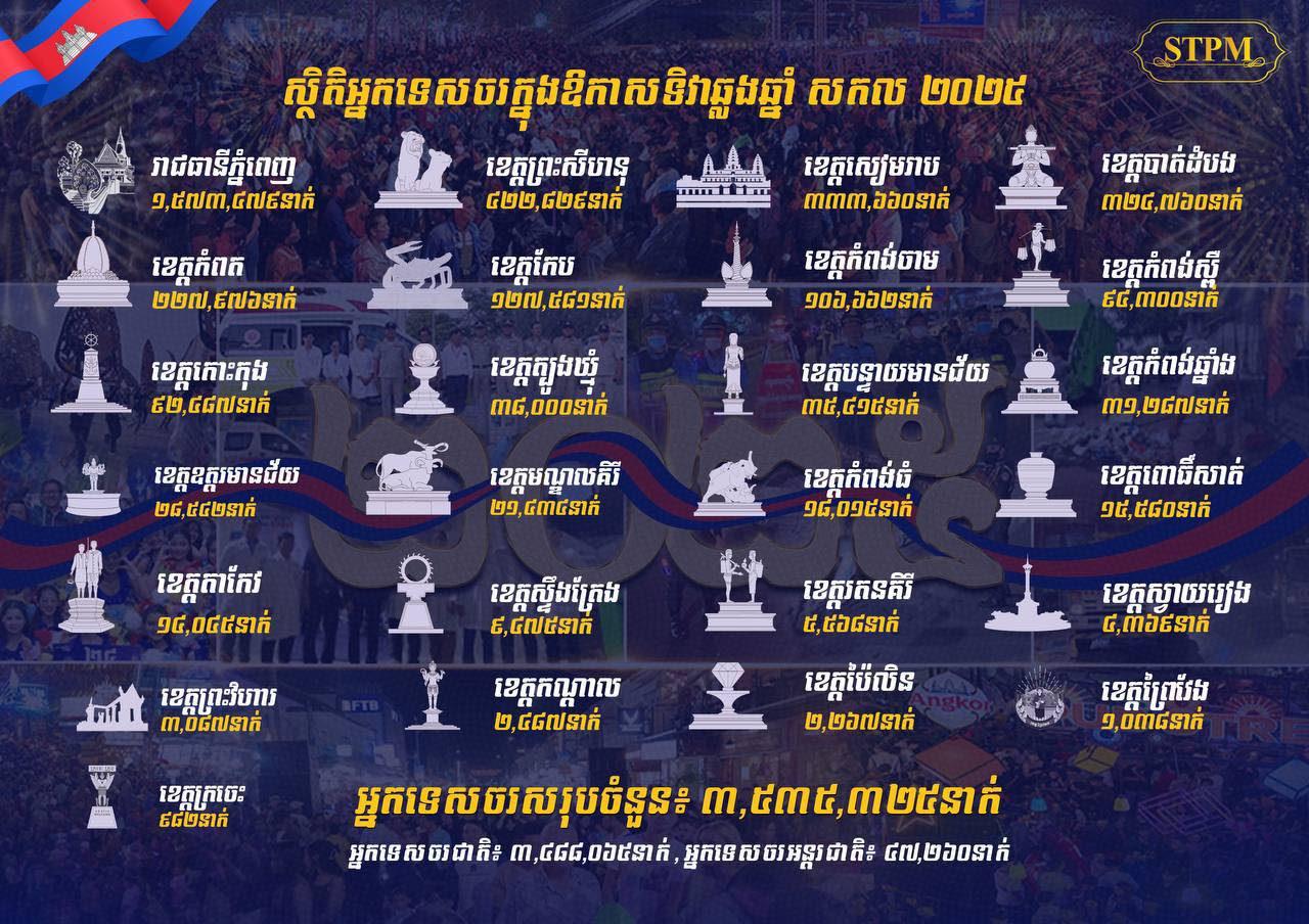 យោងតាមស្ថិតិដែលបានបង្ហាញជូនដោយក្រសួងទេសចរណ៍នាថ្ងៃទី១ ខែមករា ឆ្នាំ ២០២៥ បានឱ្យដឹងថាក្នុងឱកាសឆ្លងឆ្នាំសកល ២០២៤ ឈានចូល ២០២៥ កម្ពុជាបានទទួលភ្ញៀវទេសចរសរុបទាំងជាតិ និងអន្តរជាតិប្រមាណ ៣ ៥៣៥ ៣២៥ នាក់ ក្នុងនោះទេសចរជាតិ សរុបប្រមាណ ៣ ៤៨៨ ០៦៥ នាក់ និងទេសចរអន្តរជាតិ សរុបប្រមាណ ៤៧ ២៦០នាក់។ តាមរយៈស្ថិតិខាងលើក៏បានបង្ហាញផងដែរ ថ្ងៃឆ្លងឆ្នាំសកល ២០២៤ – ២០២៤ រាជធានីភ្នំពេញបានឈរនៅលំដាប់ថ្នាក់ទី១ដែលមានចំនួនអ្នកទេសចរទាំងជាតិ និងអន្តរជាតិមកទស្សនា លេងកម្សាន្តប្រមាណជា ១ ៥៧៣ ៤៧៩ ខណៈខេត្តចំនួន ៥ ផ្សេងទៀតស្ថិតនៅលំដាប់លេខរៀងបន្តបន្ទាប់ក្នុងនោះមានដូចជា ខេត្ត ព្រះសីហនុ , សៀមរាប, បាត់ដំបង, កំពត និងកែប។