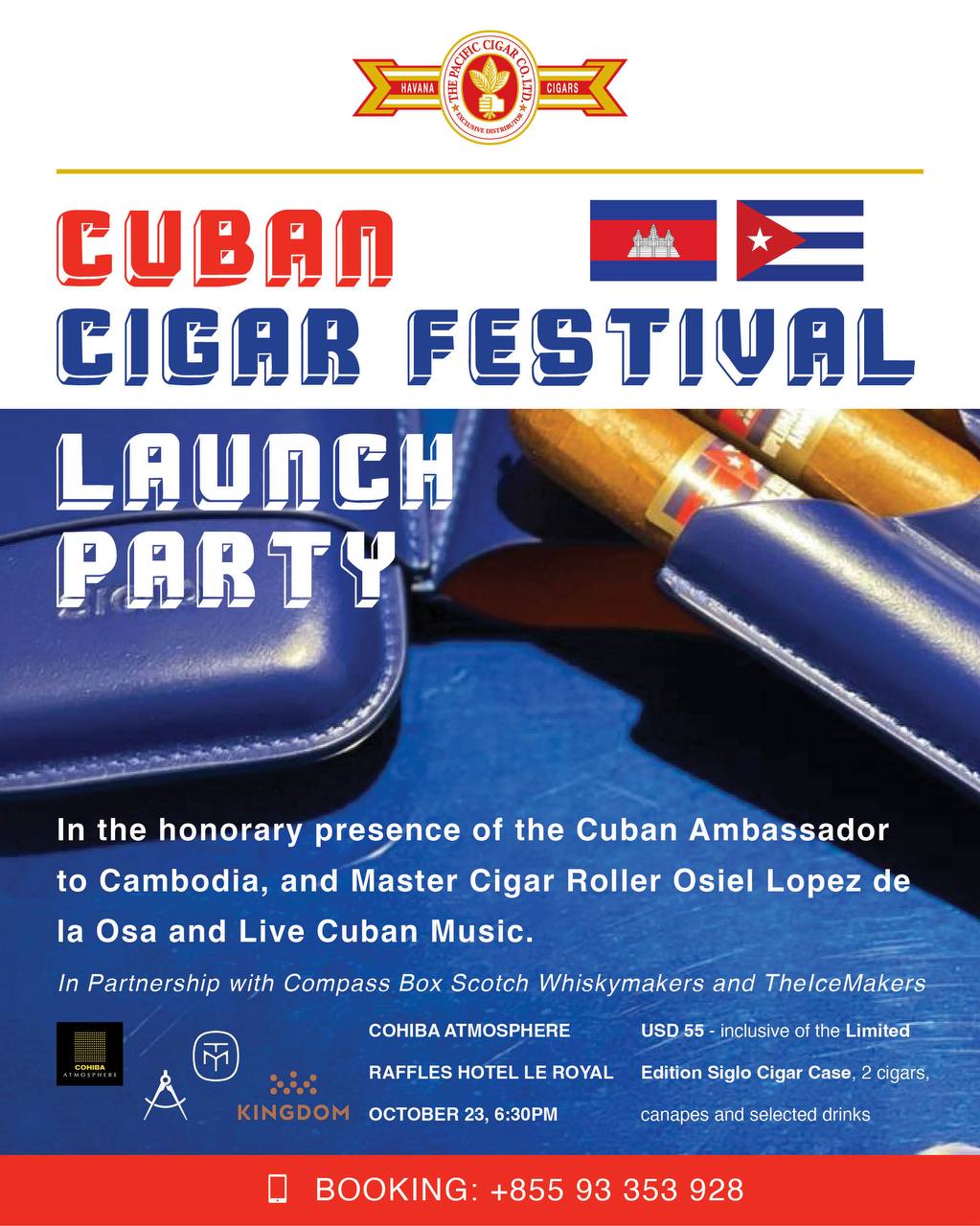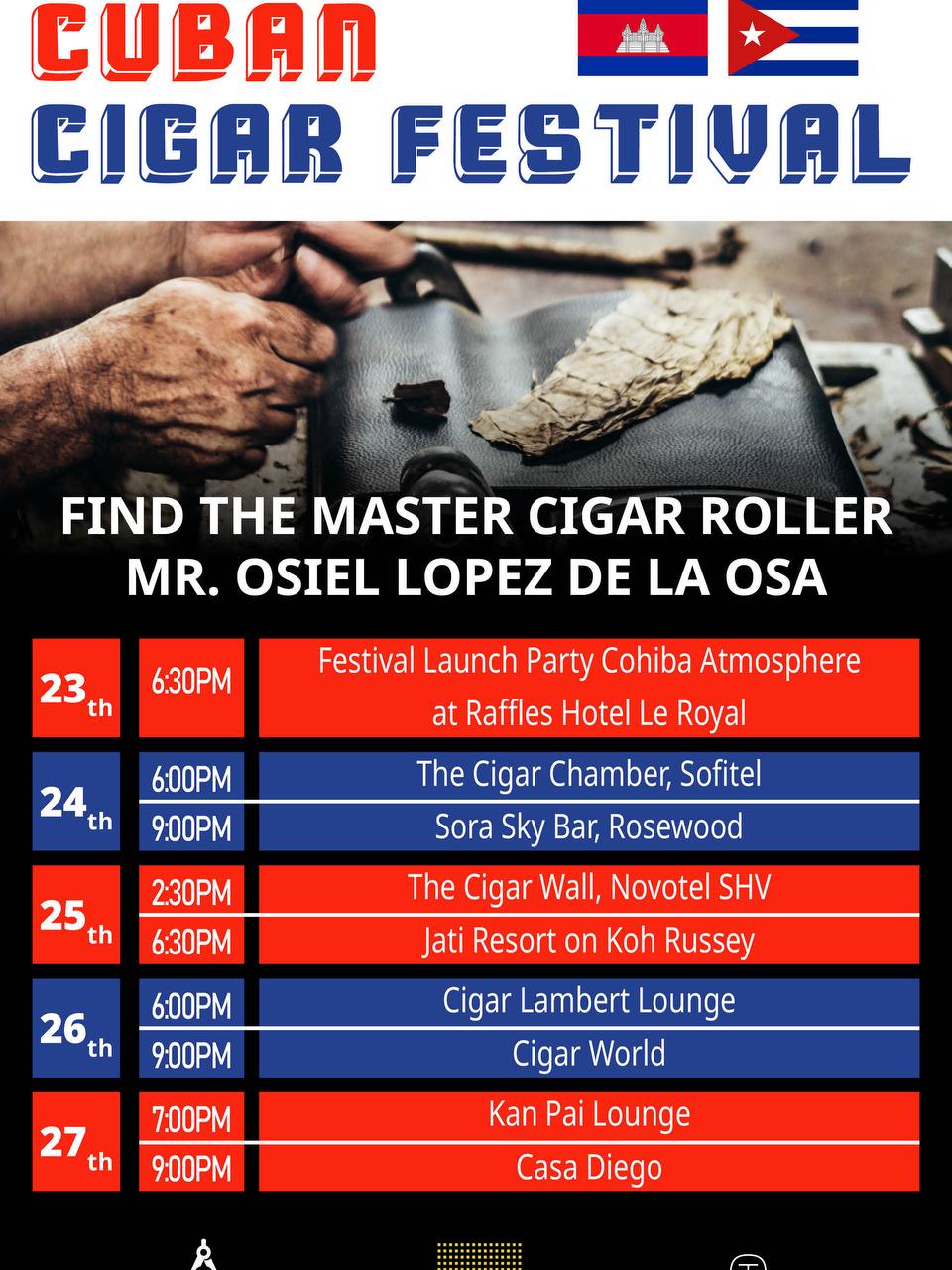 • ថ្ងៃទី២៣ ខែតុលា | ម៉ោង ៦:៣០ ល្ងាច — កម្មវិធីបើកសម្ពោធព្រឹត្តិការណ៍ នៅ Cohiba Atmosphere សណ្ឋាគារ រ៉ាហ្វិល ឡឺ រ៉ូយ៉ាល់ (Raffles Hotel Le Royal)