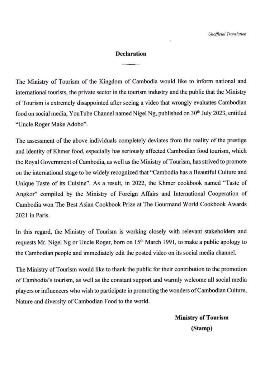 កាលពីថ្ងៃ នៅថ្ងៃទី៧ ខែសីហា ឆ្នាំ២០២៣នេះ ក្រសួងទេសចរណ៍កម្ពុជា បានចេញសេចក្ដីថ្លែងការណ៍ ដែលប្រតិកម្មចំពោះបុគ្គលឈ្មោះ Nigel Ng (Uncle Roger) ដែលបានបង្ហោះពីវីដេអូ វាយតម្លៃមិនល្អមកលើម្ហូបខ្មែរ។