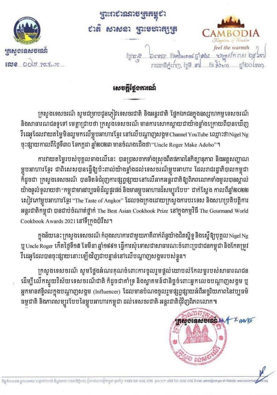 ក្នុងលិខិតរបស់ក្រសួងបានបញ្ជាក់ថា ក្រសួងទេសចរណ៍ កំពុងសហការជាមួយភាគីពាក់ព័ន្ធយ៉ាងជិតស្និទ្ធ និងស្នើឲ្យបុគ្គល Nigel Ng ឬ Uncle Roger ដែលកើតថ្ងៃទី១៥ ខែមីនា ឆ្នាំ ១៩៩១ ធ្វើការសុំទោសជាសាធារណៈ ចំពោះប្រជាជនកម្ពុជា និងកែតម្រូវវីដេអូដែលបានចុះផ្សាយនោះឡើងវិញជាបន្ទាន់ លើបណ្ដាញសង្គមរបស់ខ្លួន។