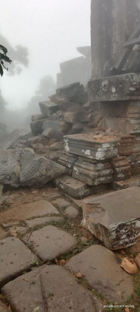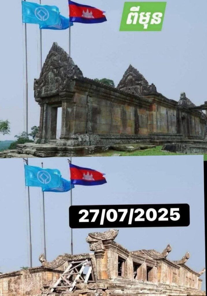 កាលពីថ្ងៃ ២៧ ខែកក្កដា ឆ្នាំ ២០២៥ កន្លងទៅប្រាសាទព្រះវិហារដែលជាបេតិកភណ្ឌពិភពលោក ត្រូវរងការបំផ្លិចបំផ្លាញបន្ថែមទៀតពីសំណាក់កងកម្លាំងប្រដាប់អាវុធថៃ ដែលបានទម្លាក់គ្រាប់បែកពីលើ ធ្វើឲ្យប្រាសាទបាក់បែកខ្ទេចខ្ទីនៅផ្នែកខ្លះ។