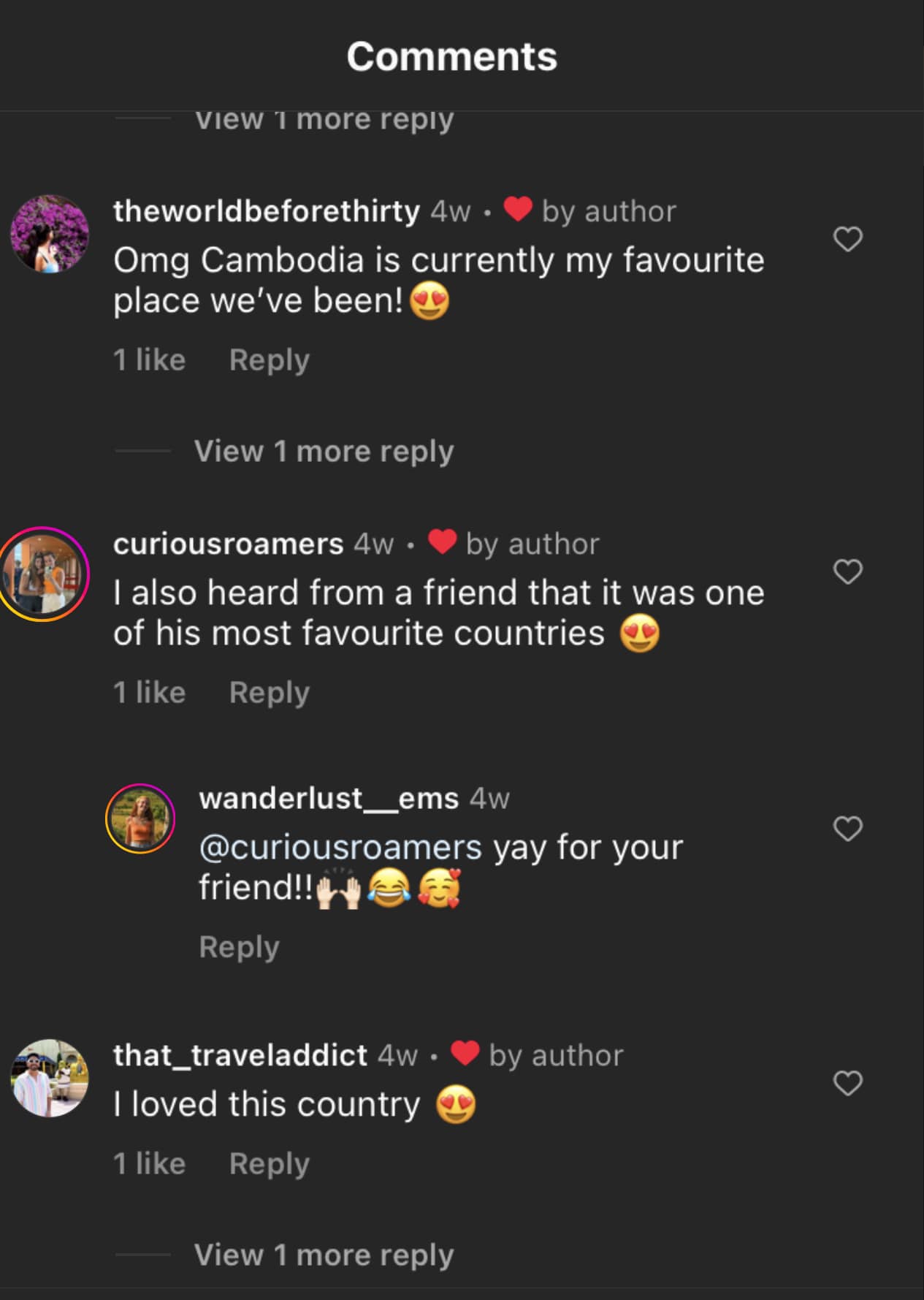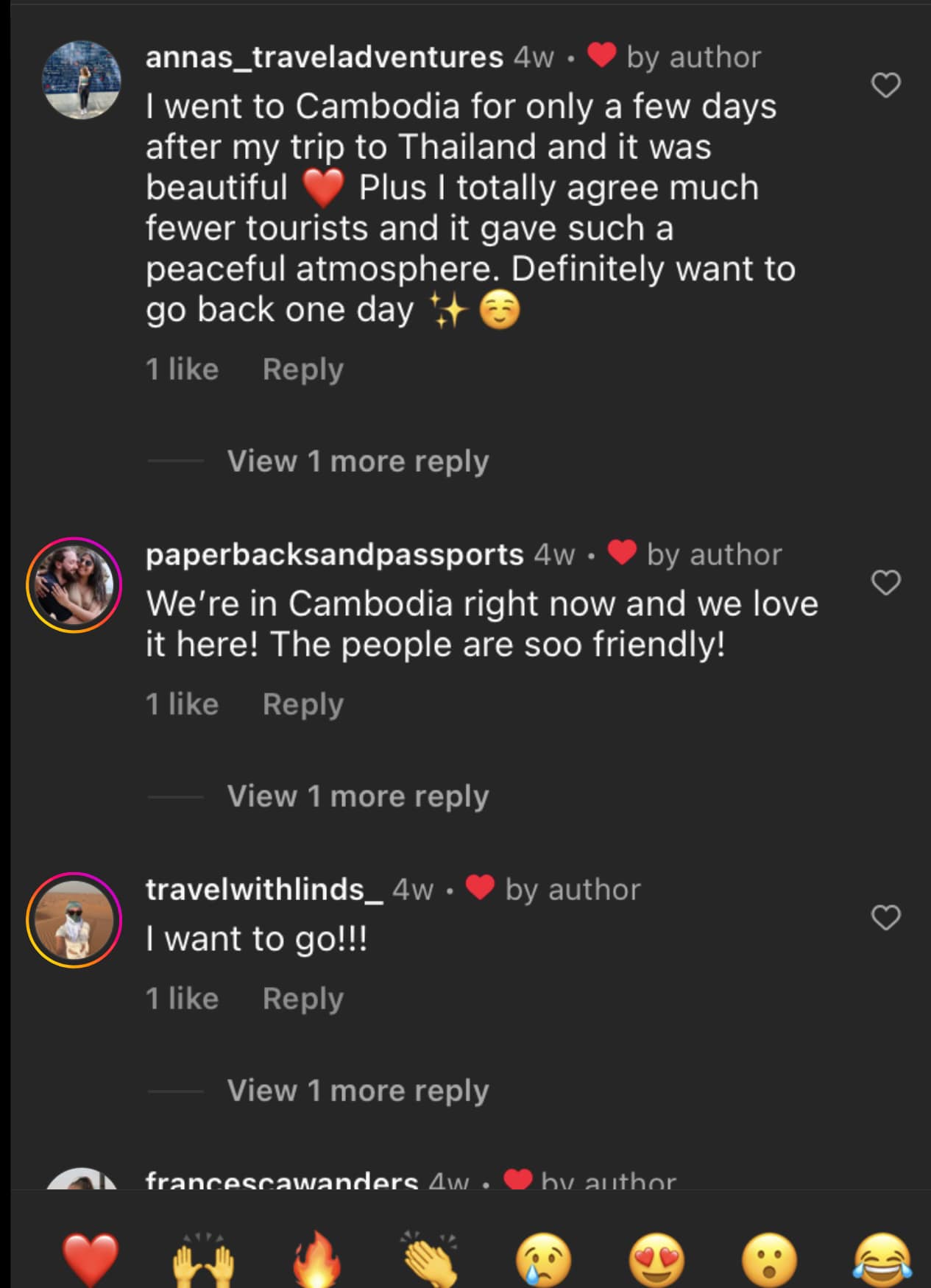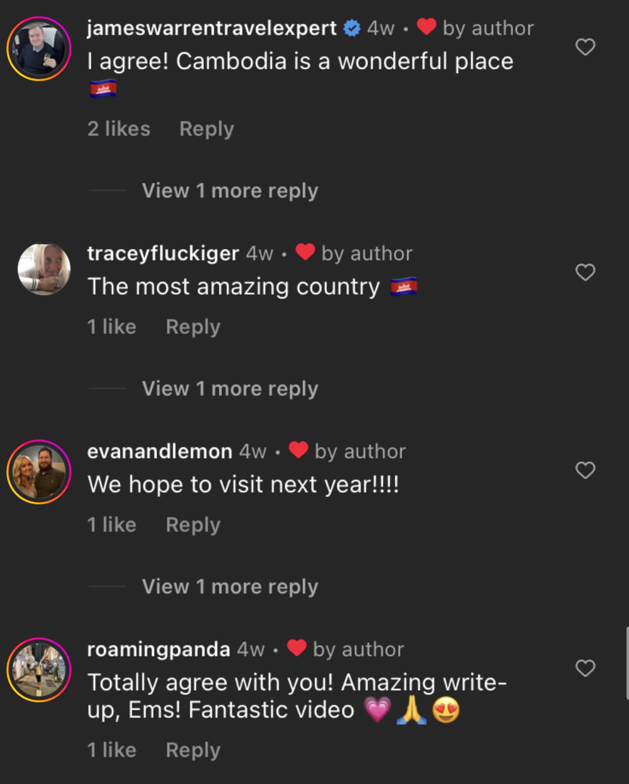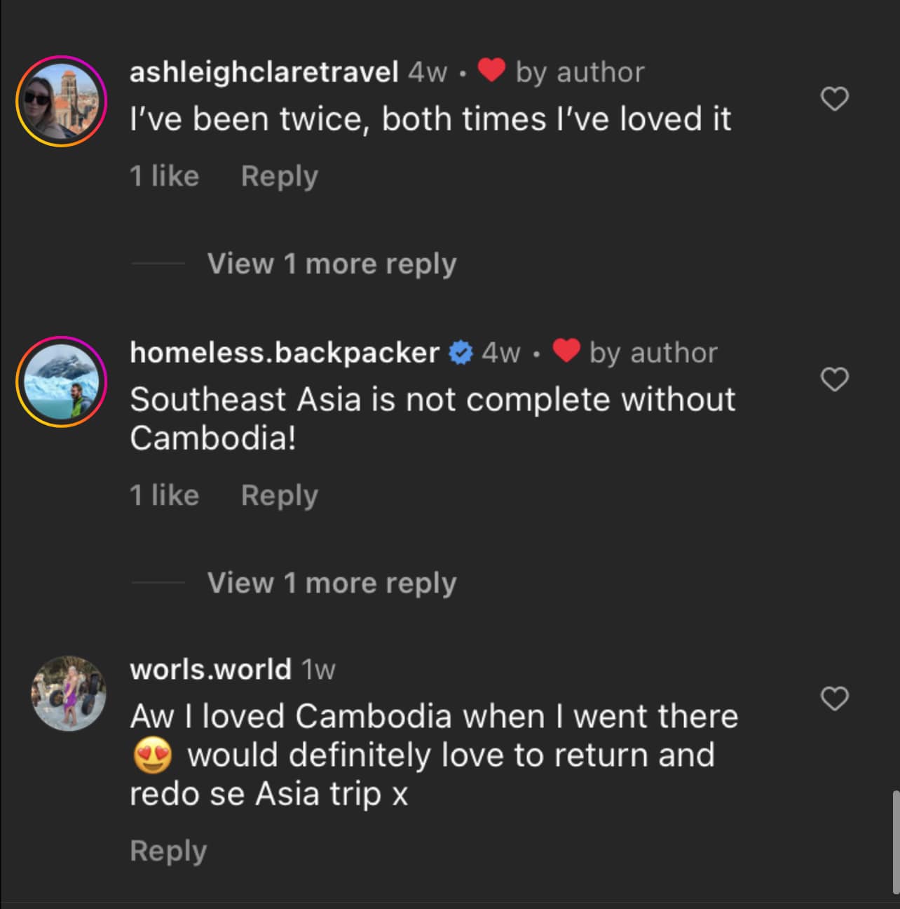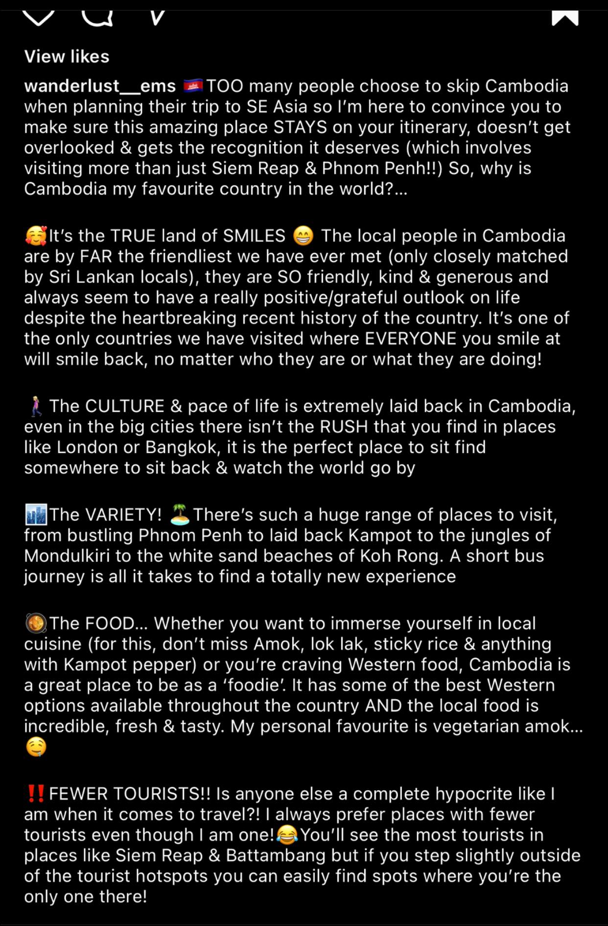 ពិតជាមានមោទកភាពក្រៃលែង ក្រោយមានទេសចរអឺរ៉ុប ជាច្រើននាក់ ពោលគឺរាប់ពាន់នាក់ បាននាំគ្នាជជែកពីប្រទេសកម្ពុជា ក្រោយទេសចរបរទេសមួយរូប បានបង្ហោះរូបនៅលើ Instagram ហើយសរសេររៀបរាប់សរសើរពីប្រទេសកម្ពុជាយ៉ាងវែងអន្លាយ ស្រាប់តែមានទេសចរអន្តរជាតិផ្សេងទៀត ដែលធ្លាប់បានមកប្រទេសកម្ពុជាដែរ បាននាំគ្នាសរសើរមិនដាច់ពីមាត់ពីប្រទេសកម្ពុជា។ មតិភាគច្រើនបាននិយាយដូចៗគ្នាថា៖ «ប្រសិនបើមកដើរលេងនៅអាស៊ីអាគ្នេយ៍ ហើយមិនបានមកប្រទេសកម្ពុជា គឺគ្មានន័យ» ។