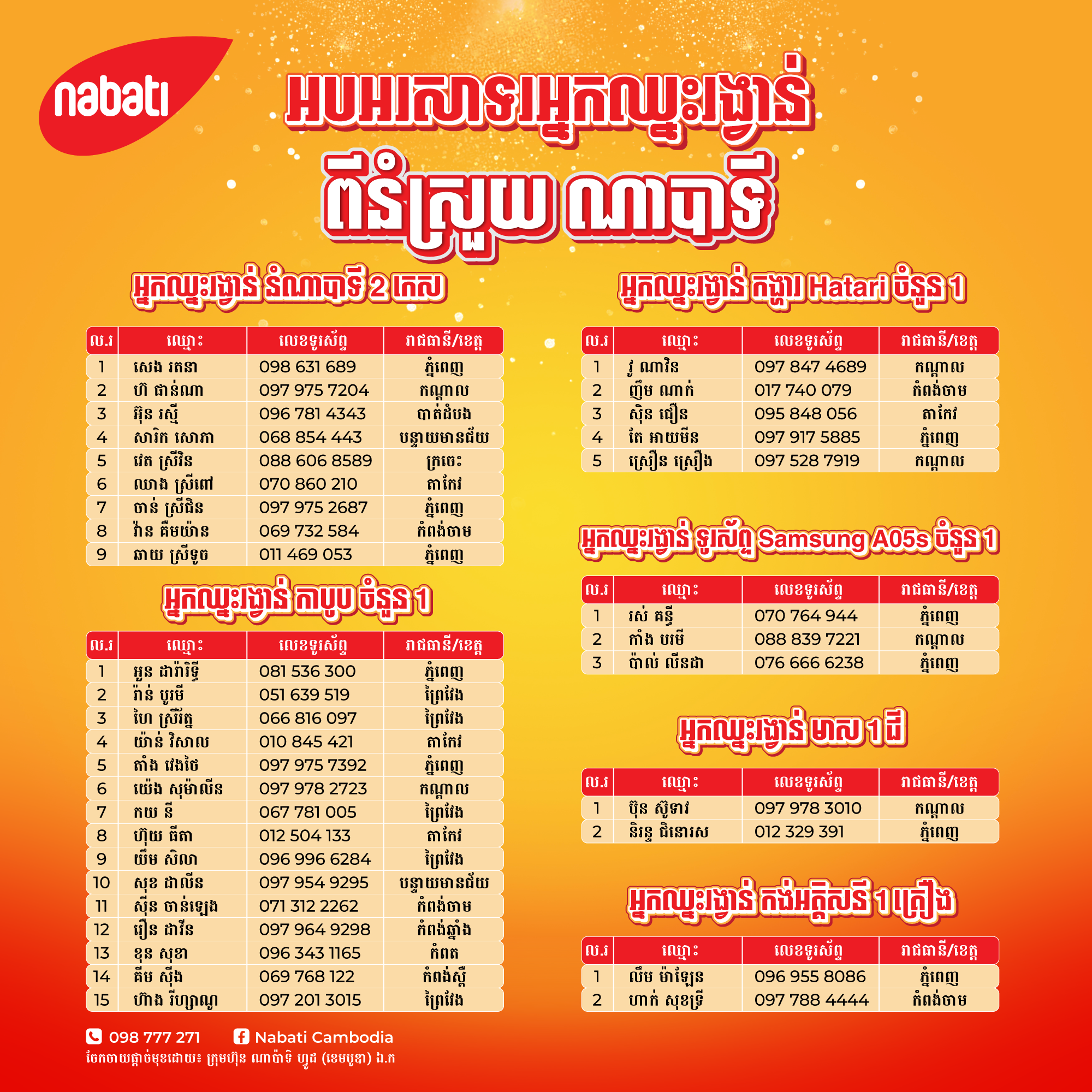 អ្នកឈ្នះរង្វាន់ នឹងប្រកាសនៅក្នុង ហ្វេសប៊ុកផេកផ្លូវការ (Nabati Cambodia) និងតាមបណ្ដា ប្រព័ន្ធផ្សព្វផ្សាយសង្គមនានា។ អ្នកឈ្នះរង្វាន់ត្រូវអញ្ជើញមកទទួលរង្វាន់នៅក្រុមហ៊ុនដោយផ្ទាល់ និងភ្ជាប់មកជាមួយនូវ លេខទូរស័ព្ទ អត្តសញ្ញាណប័ណ្ណ ឬសៀវភៅស្នាក់នៅ ឬសំបុត្រកំណើត។ ប្រសិនបើរាល់ការទាក់ទងទៅអ្នកឈ្នះរង្វាន់ពុំមានការឆ្លើយតប ចំនួន៣ថ្ងៃ ក្រុមហ៊ុននឹងធ្វើការផ្ទេររង្វាន់ទៅអ្នកឈ្នះបន្ទាប់៕