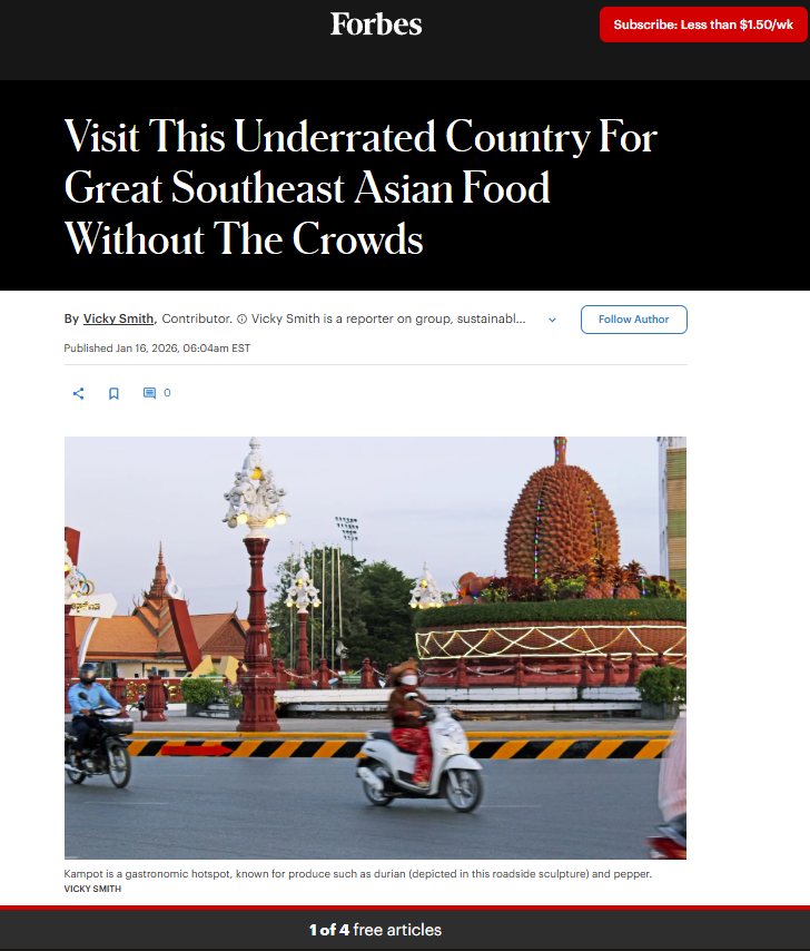ថ្មីៗនេះប្រព័ន្ធផ្សព្វផ្សាយដ៏ល្បីលំដាប់ពិភពលោក Forbes បានចុះផ្សាយពីប្រទេសកម្ពុជា ដោយដាក់ចំណងជើងថា “ទស្សនាប្រទេសដែលមិនសូវមានការចាប់អារម្មណ៍នេះ ដើម្បីទទួលទានអាហារអាស៊ីអាគ្នេយ៍ដ៏អស្ចារ្យ មិនសូវមានអ្នកស្គាល់”។