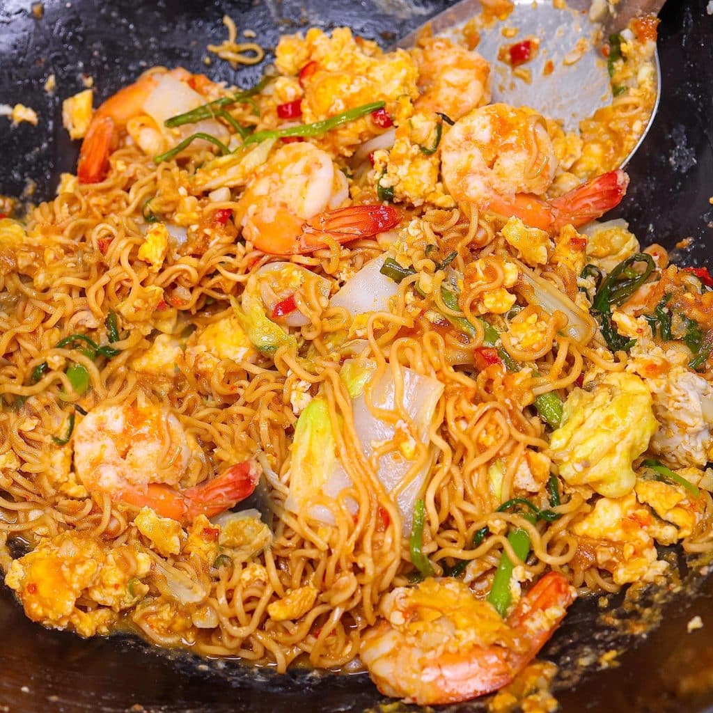 -រួចហើយដាក់មីដែលស្រុះរួច ទឹកជ្រលក់ស៊ុគី ស្ករស ទឹកស៊ីអ៊ីវ និងម្ទេសម៉ដ្ឋ ឆាឲ្យចូលជាតិគ្នា។
