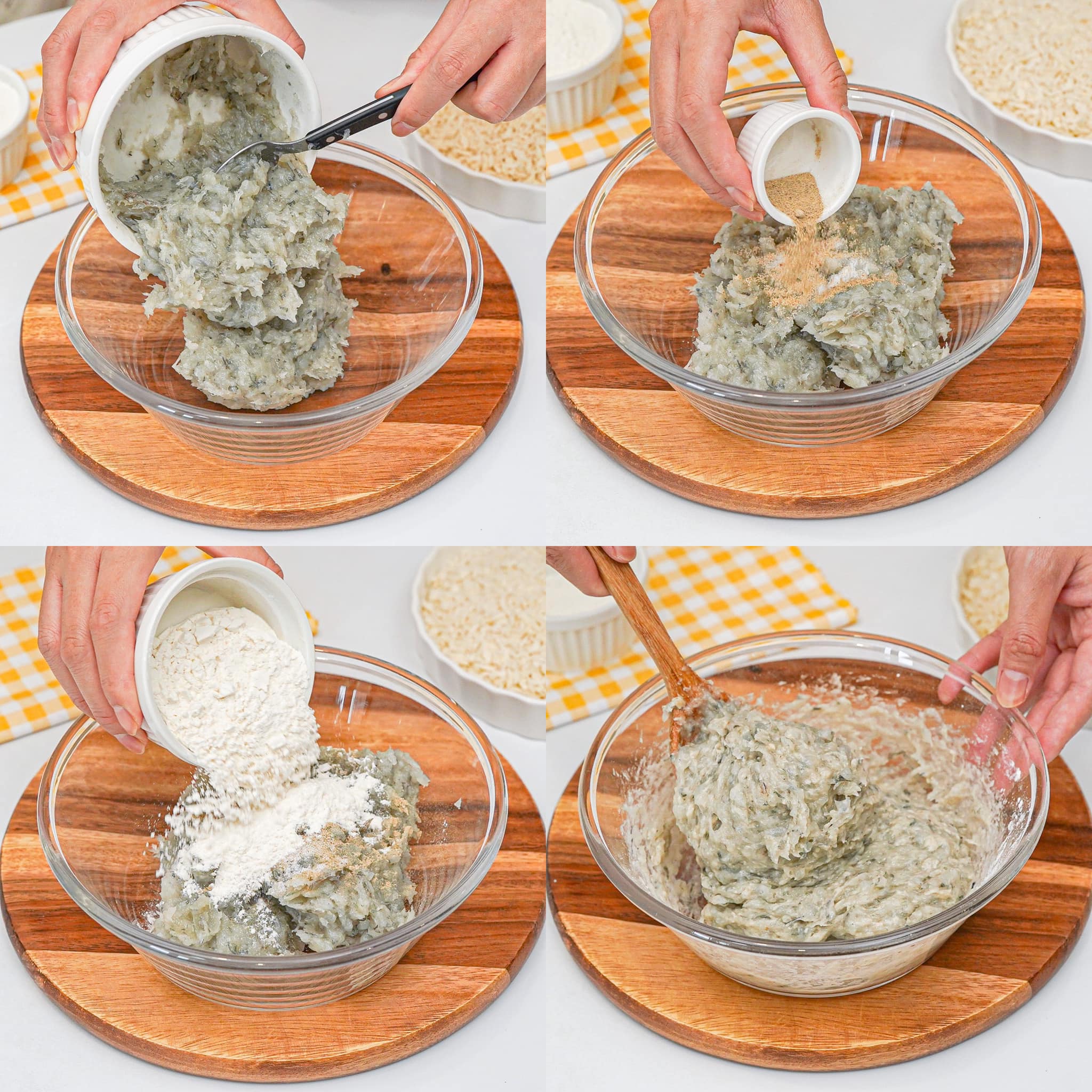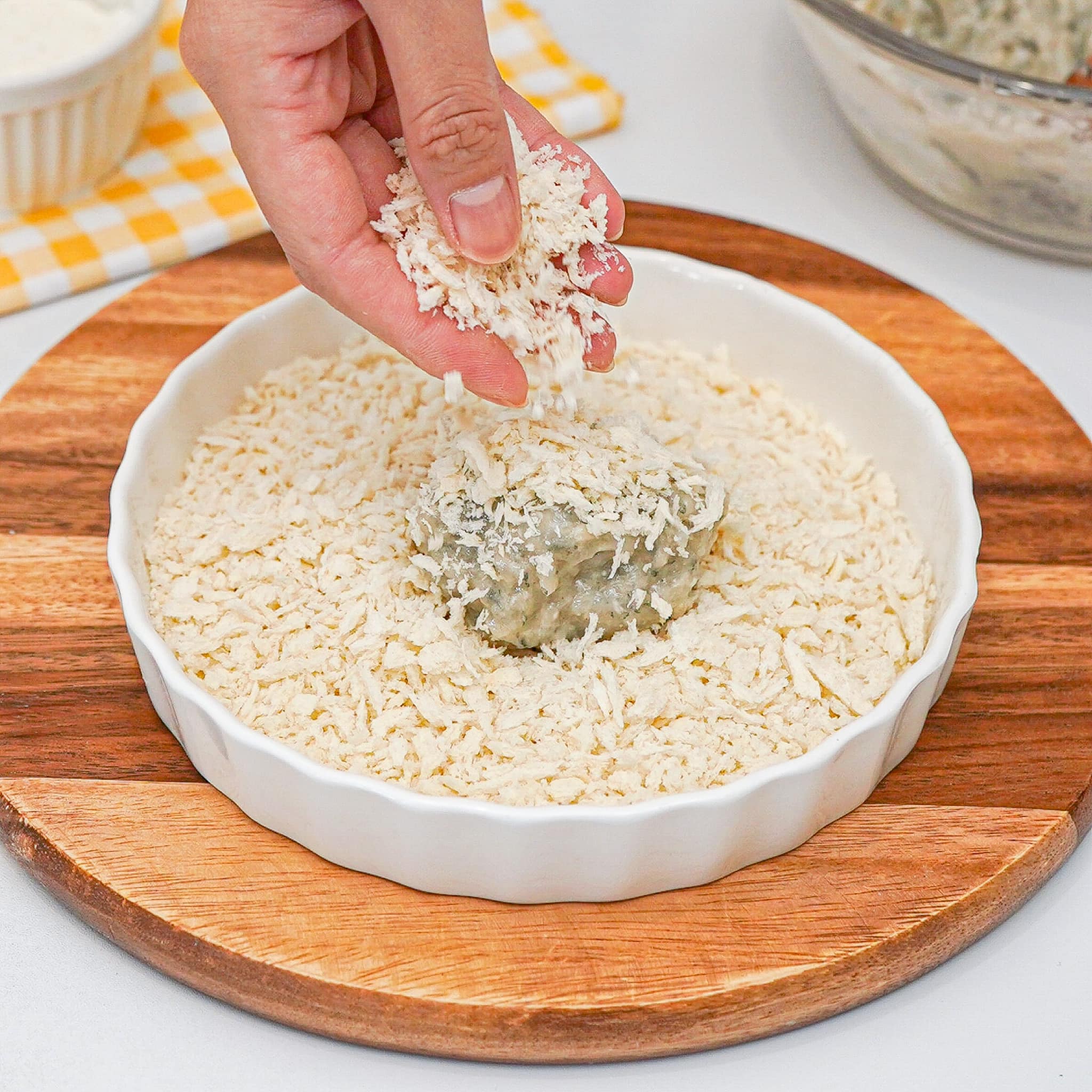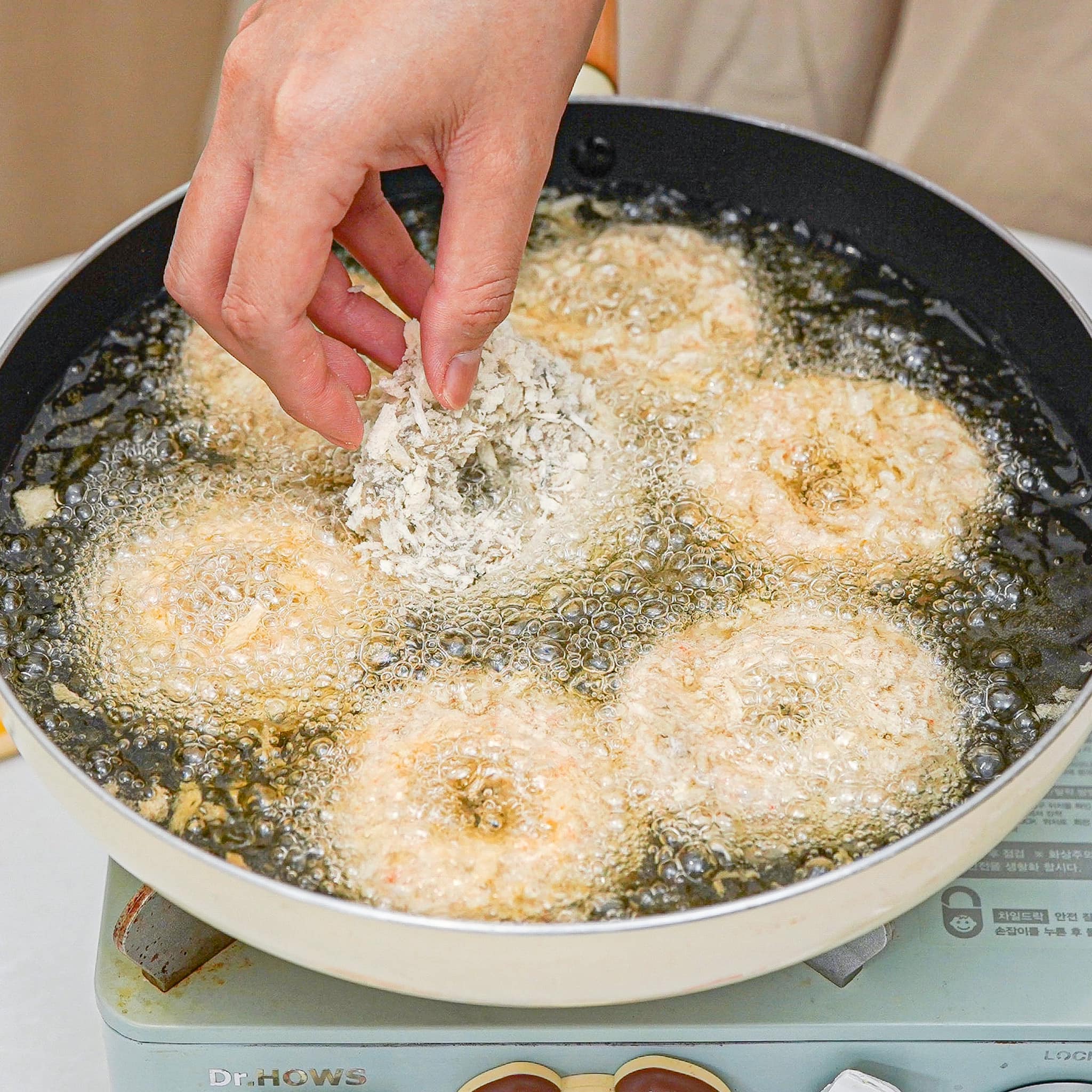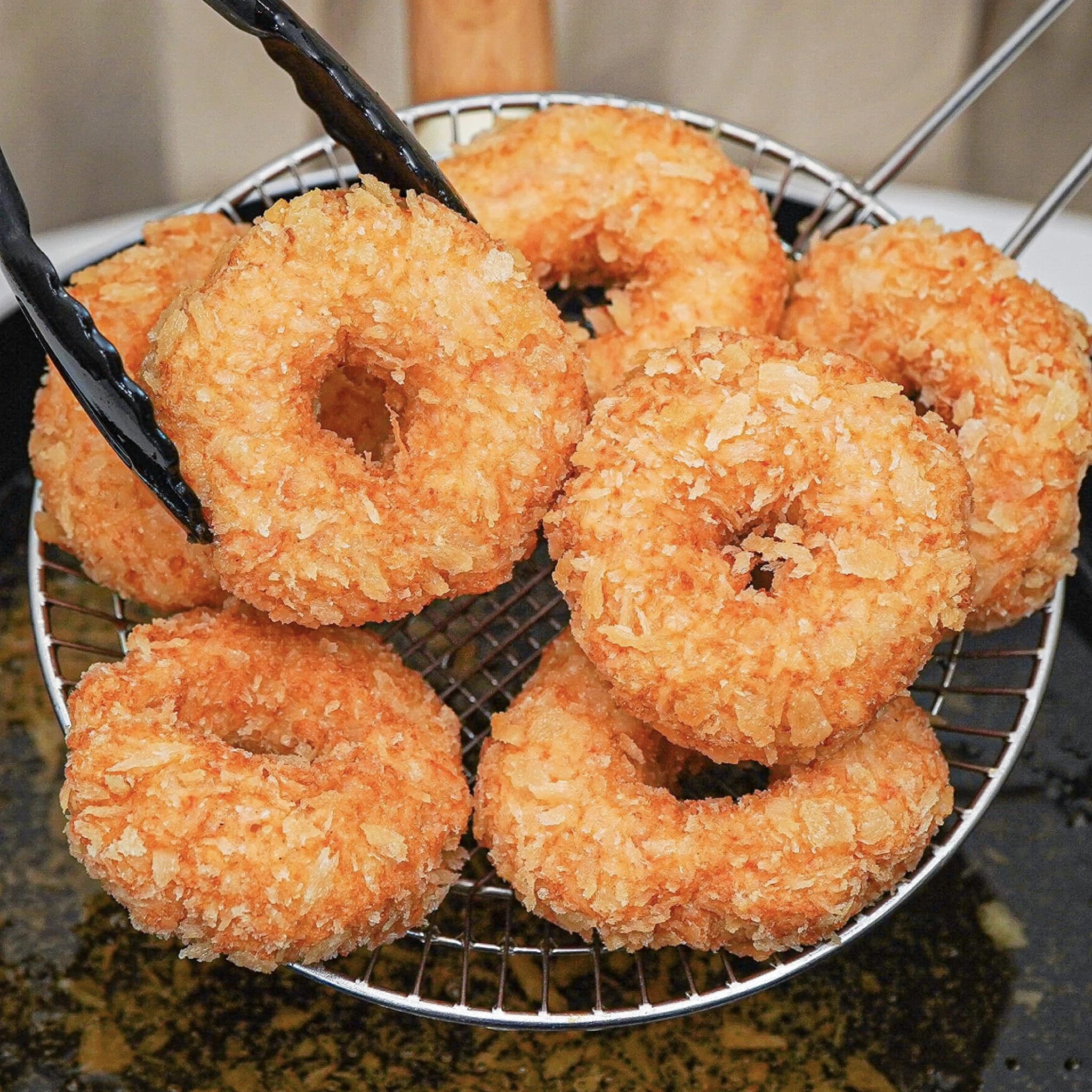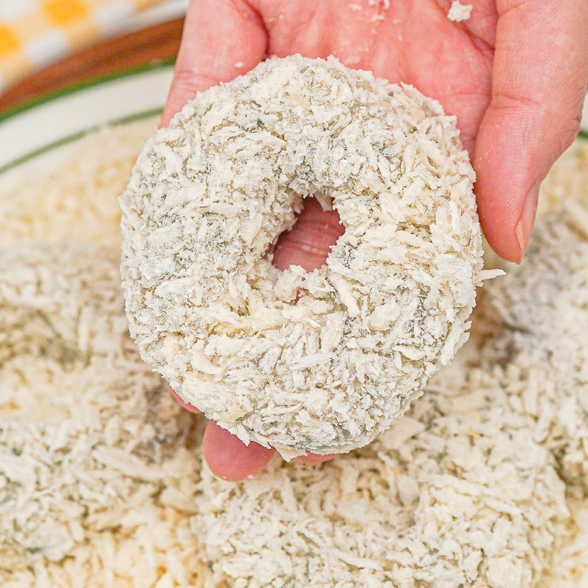 ២. ក្រោយមកដួសល្បាយបង្គាមួយស្លាបព្រាដាក់ចូលទៅប្រឡាក់ជាមួយម្សៅកម្ទេចនំប៉័ង ហើយសឹមចោះប្រហោងកណ្ដាលឱ្យមានរាងដូចនំដូណាត់។
