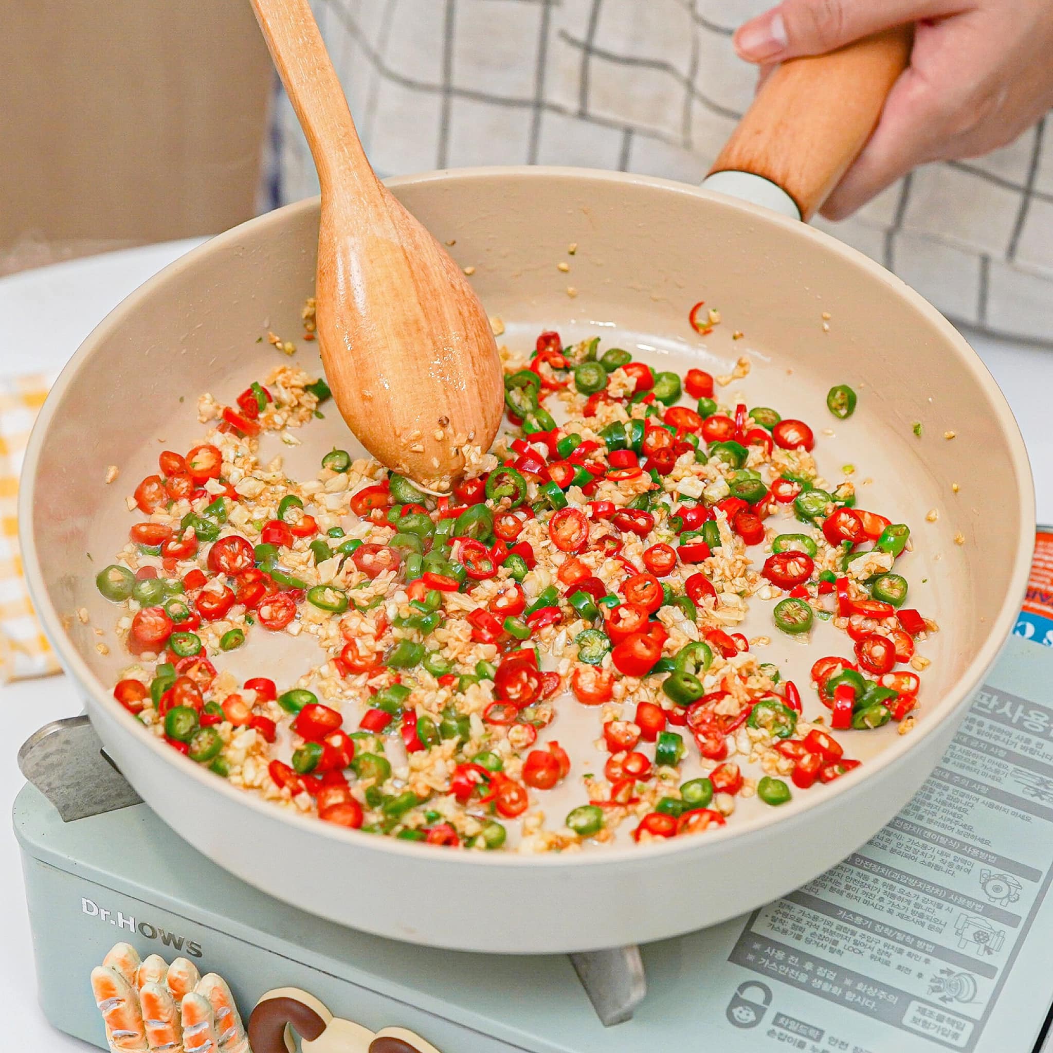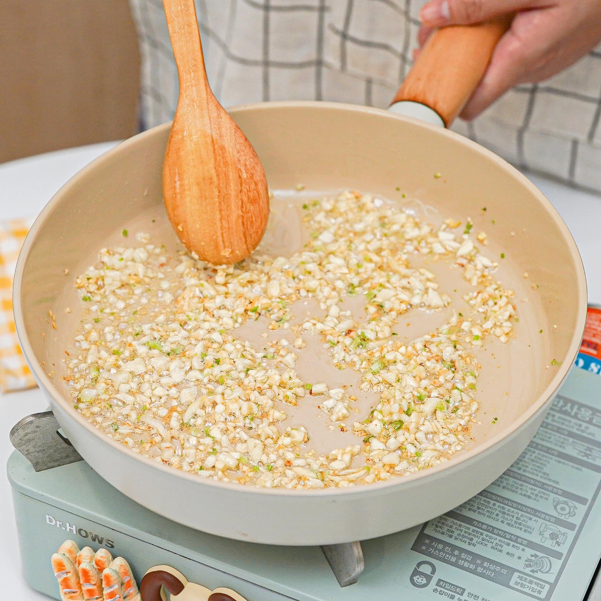 ២. បន្ទាប់ចាប់ផ្ដើមរំលីងខ្ទឹម និងគល់ជីវ៉ាន់ស៊ុយ ហើយដាក់ម្ទេសចូល។