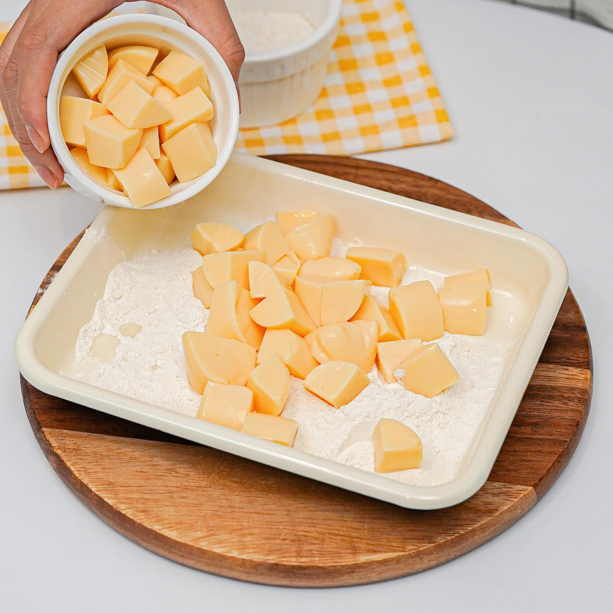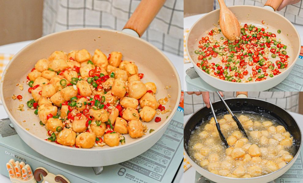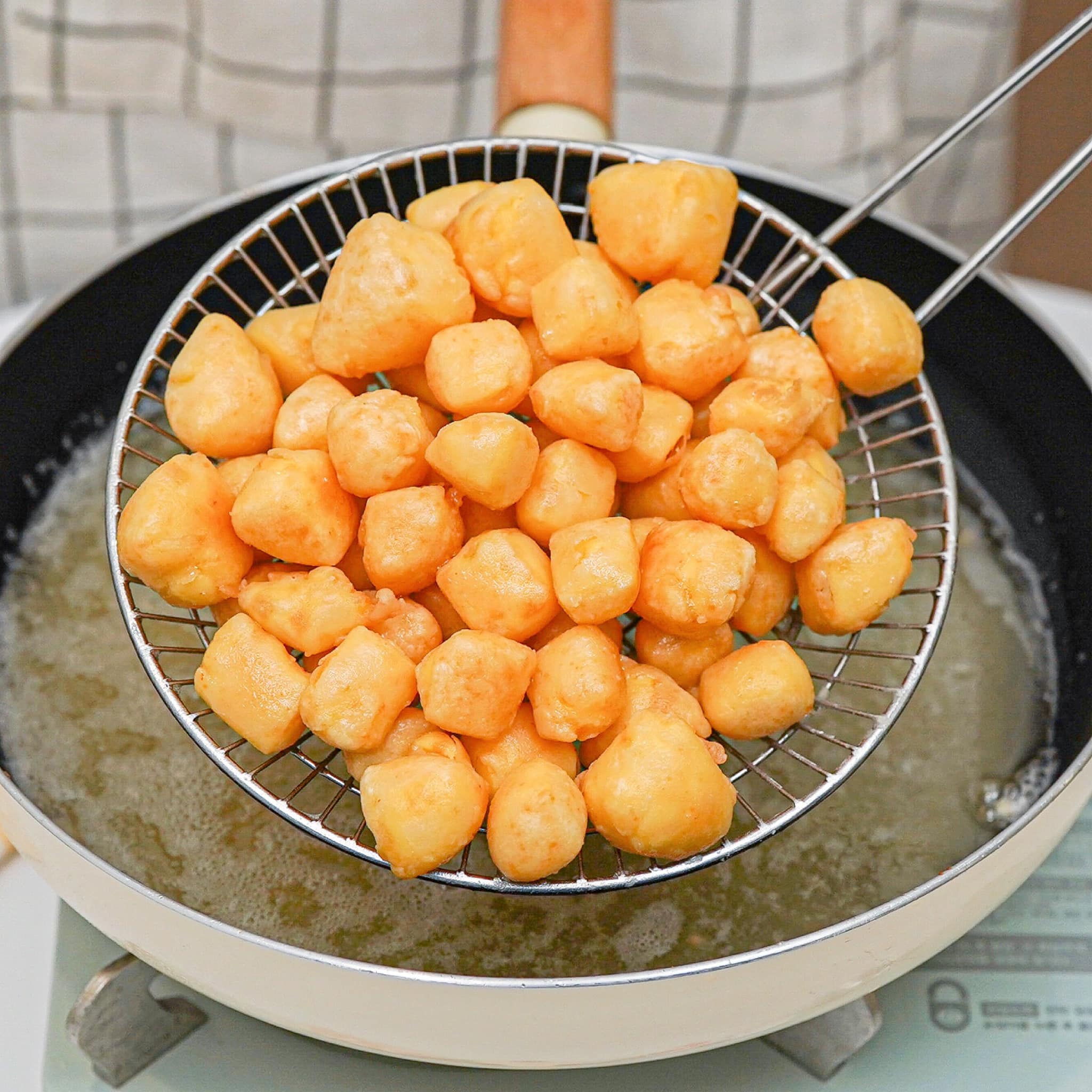 ១. ដំបូងយកតៅហ៊ូទៅប្រឡាក់ម្សៅ រួចយកទៅបំពងហើយស្រង់ទុកមួយឡែកសិន។