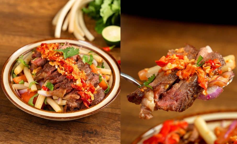 - ចុងក្រោយគ្រាន់តែយកត្រយ៉ូងចេក និងសាច់គោដែលបានអាំងហើយនោះមកច្របល់ចូលគ្នាជាការស្រេច៕