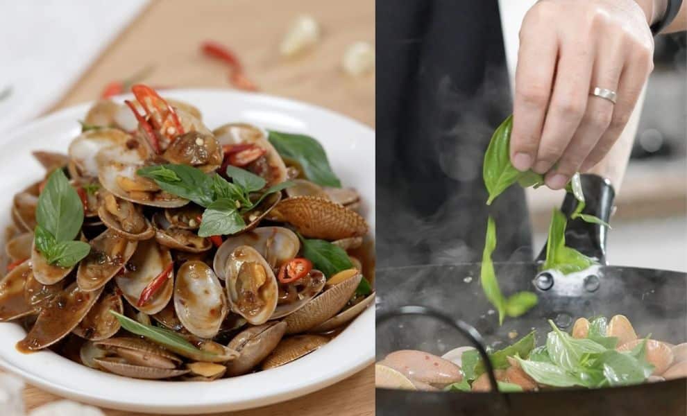 - បន្ទាប់ចិញ្ច្រាំខ្ទឹមស និងម្ទេសហើយចាប់ផ្ដើមដាក់ចូលខ្ទះឆាឱ្យឈ្ងុយរួចចាក់ខ្យងហូល និងទឹកចូល។