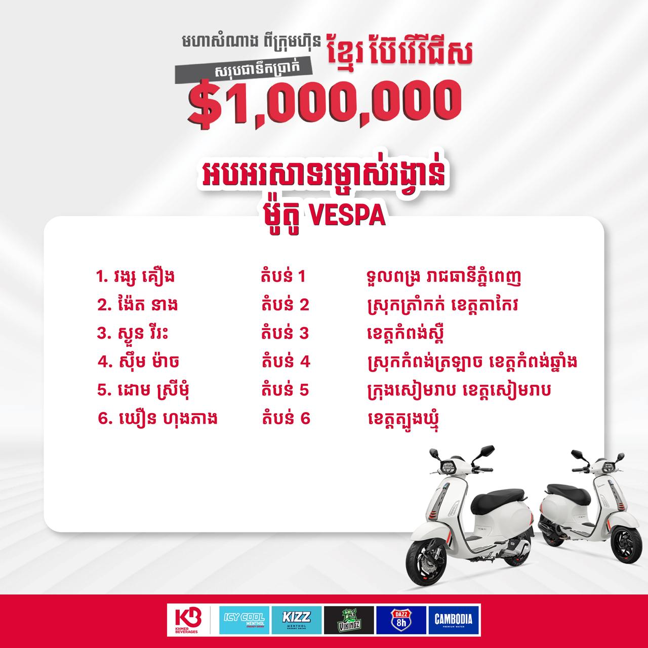រង្វាន់នៅមិនទាន់អស់ទេ! សម្រាប់បងប្អូនទាំងអស់គ្នាដែលទិញភេសជ្ជៈប៉ូវកម្លាំង VIKINGZ, DAZZ, KIZZ, ICY COOL និងទឹកពិសា កម្ពុជា របស់ក្រុមហ៊ុន ខ្មែរ ប៊ែវើរីជីស សូមកុំចោលសំបកកេសឲ្យសោះព្រោះថា មានឱកាសឈ្នះរង្វាន់ធំច្រើនដូចជា៖ ផ្ទះអាជីវកម្ម របស់ ជីប ម៉ុង លែន, ទូរស័ព្ទម៉ាក Samsung រហូតដល់ ៥,០០០ រង្វាន់ និងម៉ូតូ Vespa ១៨ រង្វាន់ ដែលកំពុងរង់ចាំបងប្អូនមកទទួលលាភជ័យពីក្រុមហ៊ុន ខ្មែរ ប៊ែវើរីជីស។សូមបញ្ជាក់ផងដែរថា៖ ការចាប់រង្វាន់ពីកម្មវិធី «មហាសំណាងពីក្រុមហ៊ុន ខ្មែរ ប៊ែវើរីជីស សរុបជាទឹកប្រាប់ $ ១,000,000» នៅសល់ ៤ លើកទៀត៖