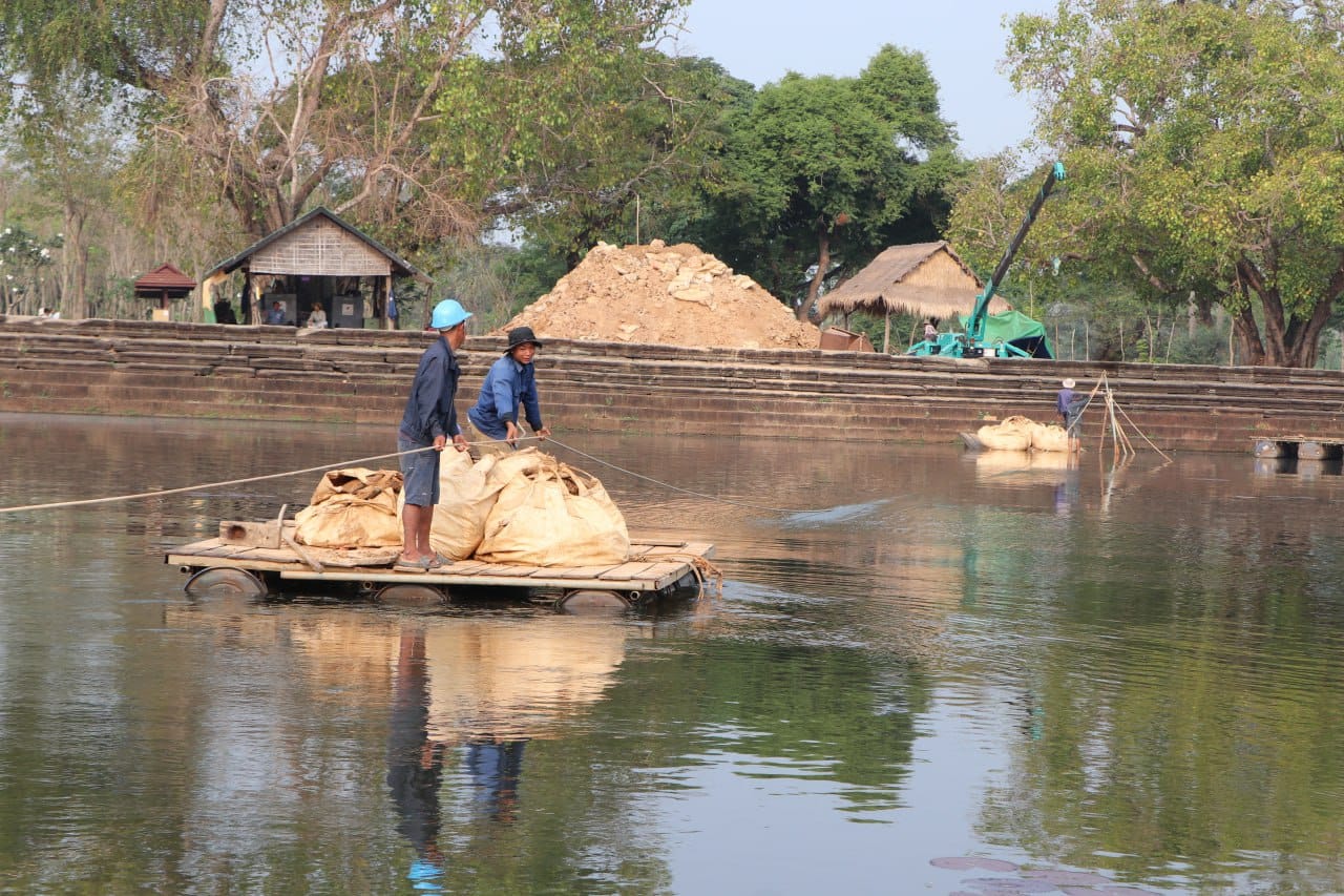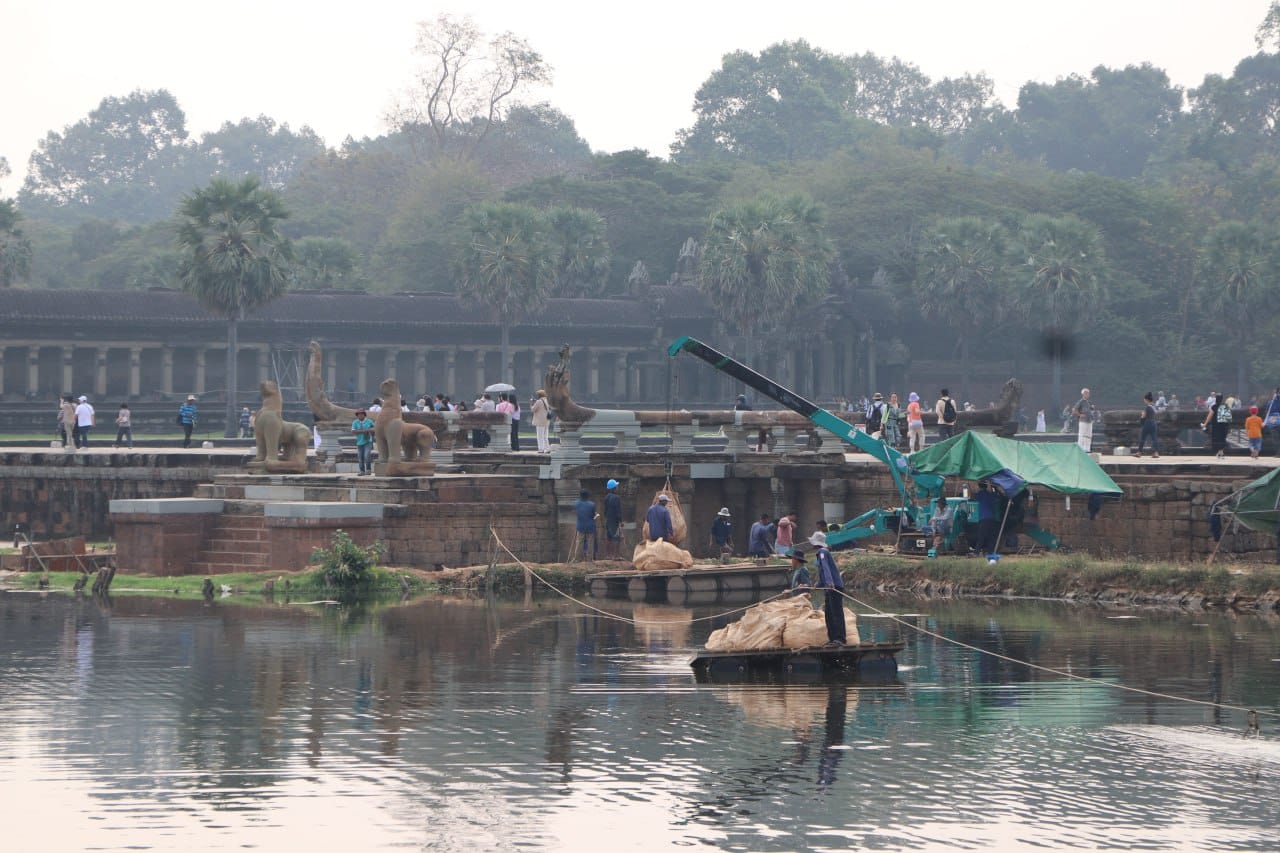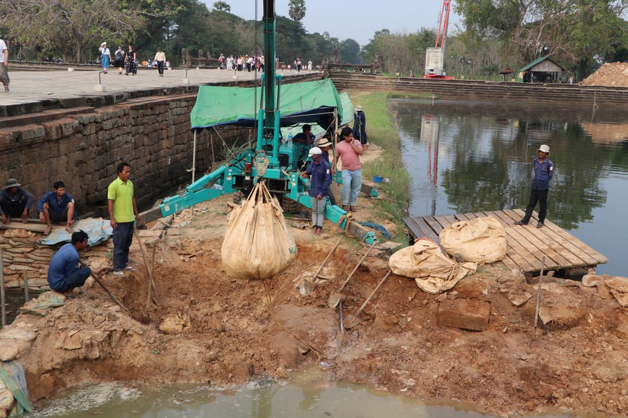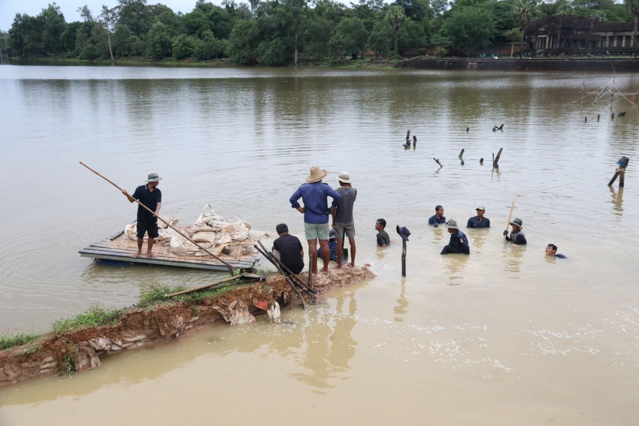 បងប្អូនប្រជាជនខ្មែរច្រើននាក់ដែលជាក្រុមជំនាញ នាំគ្នាដកទំនប់ការពារបណ្ដោះអាសន្នចេញដោយប្រើបច្ចេកទេសជ្រមុជក្នុងទឹក ដើម្បីកាយយកអាចម៍ដី និងលើកចេញពីខាងក្នុងទឹកមកច្រកការុងដាក់លើក្បូនជញ្ជូនមកខាងលើគោក ក្រោយស្ពានហាលខាងលិចប្រាសាទអង្គរវត្តបានជួសជុលរួចរាល់ជាស្ថាពរ។