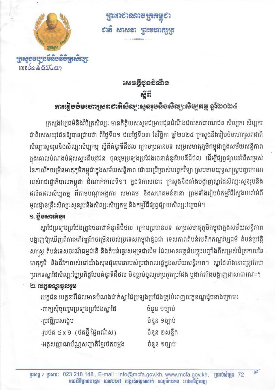 ក្រសួងវប្បធម៌ និងវិចិត្រសិល្បៈបានប្រកាសជូនដំណឹងដល់សាធារណជនឱ្យបានជ្រាបថា ក្រសួងនឹងរៀបចំមហោស្រពជាតិសិល្បៈសូន្យរូប និងសិល្បៈសិប្បកម្មស្ដីពី គំនូរឌីជីថល ក្រោមប្រធានបទ សម្រស់មាតុភូមិកម្ពុជាក្នុងសម័យសន្តិភាព ចាប់ពីថ្ងៃ១ ដល់ថ្ងៃ ៣ ខែវិច្ឆិកា ឆ្នាំ ២០២៤។