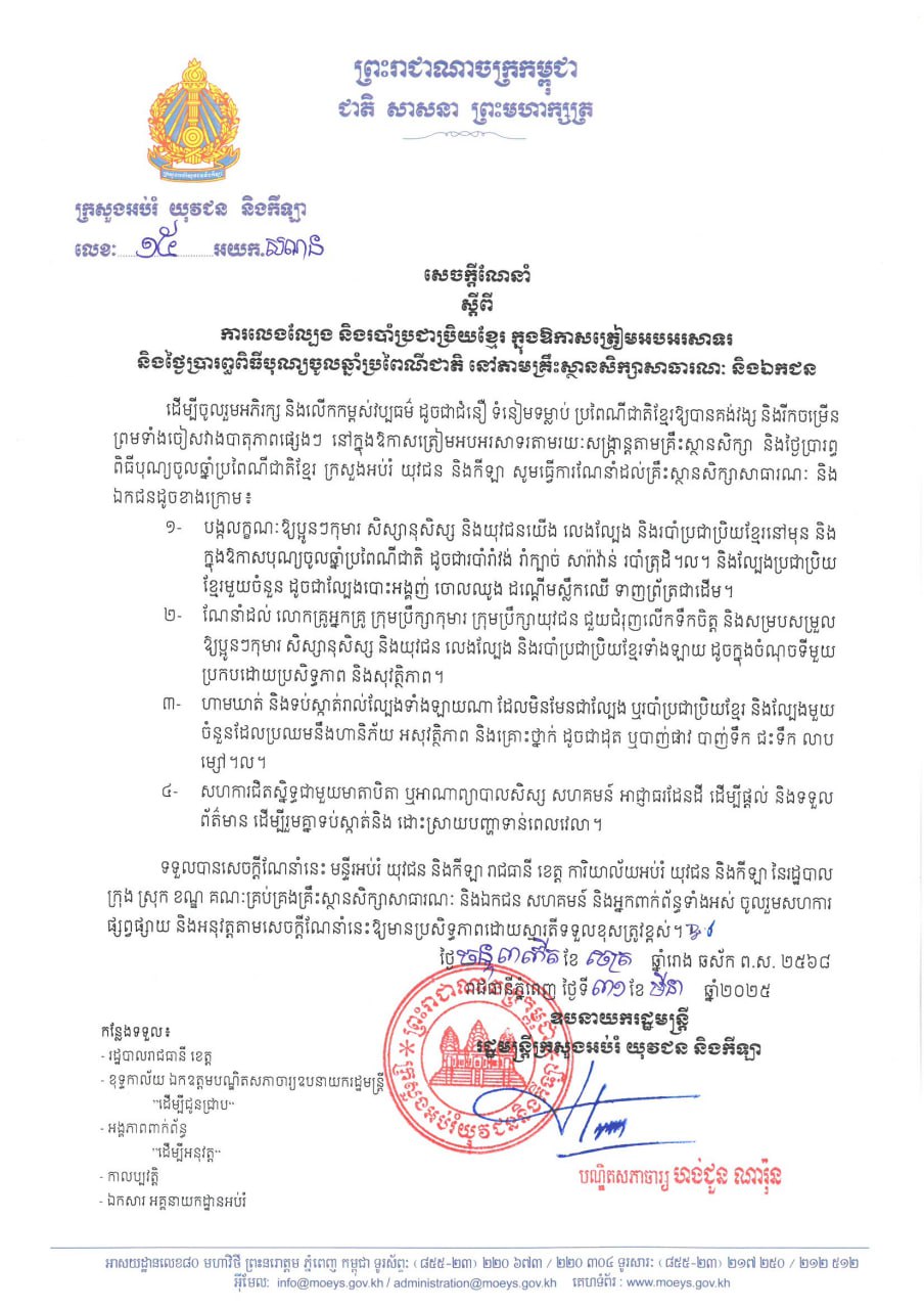 ក្រសួងអប់រំ យុវជន និងកីឡាបានចេញសេចក្ដីណែនាំដល់គ្រឹះស្ថានសិក្សាទាំងរដ្ឋ និងឯកជនក្នុងការបំផុសឱ្យសិស្សានុសិស្ស យុវជនចូលរួមលេងល្បែងប្រជាប្រិយខ្មែរឱ្យបានច្រើន ជំនួសការលេងប៉ាតម្សៅ ជះទឹក ឬបាញ់ទឹក ព្រមទាំងសកម្មភាពមិនសមរម្យជាច្រើនទៀត។