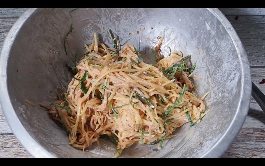 ៣. ដាក់ម្សៅបំពង ស្ករស អំបិល និងគ្រឿងកែង លាយទឹកបន្តិច លាយចូលគ្នាឲ្យសព្វបន្ទាប់មកដាក់សរសៃល្ហុងចូលច្របល់ថ្នមៗ ឲ្យសព្វ