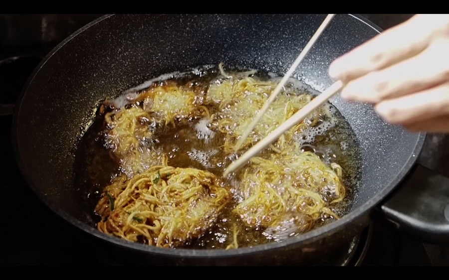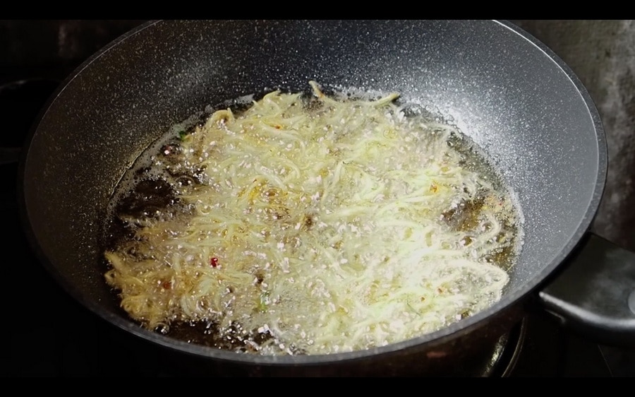៤. ដាក់ខ្ទះដាំខ្លាញ់ឲ្យពុះ រួចយកប្រើស្លាបព្រាដួសល្ហុងដាក់ចូលចៀន