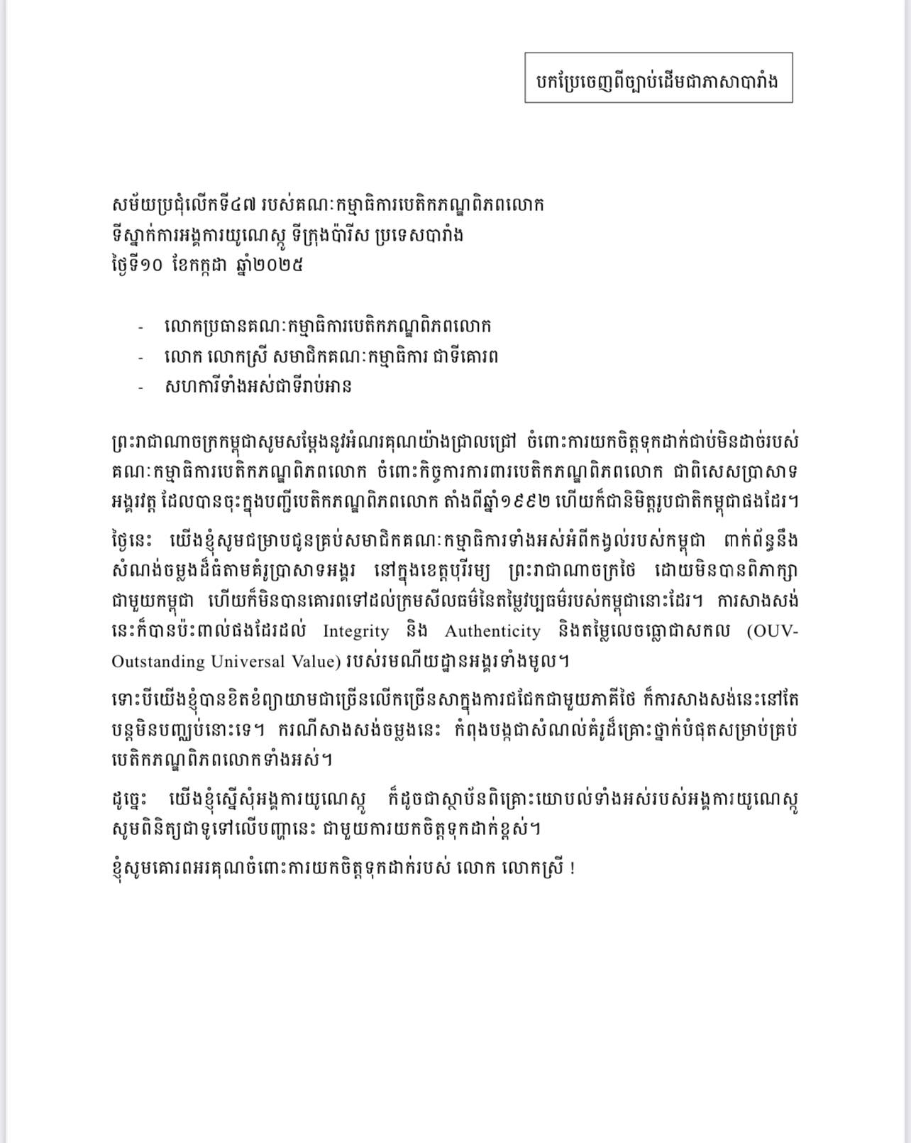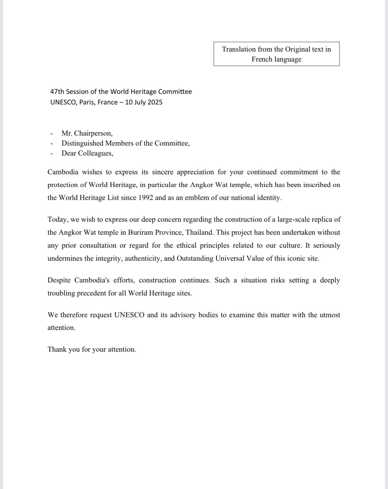 «ថ្ងៃនេះ យើងខ្ញុំសូមជម្រាបជូនគ្រប់សមាជិកគណៈធម្មាធិការទាំងអស់អំពីកង្វល់របស់កម្ពុជា ពាក់ព័ន្ធនឹងសំណង់ចម្លងធំតាមគំរូប្រាសាទអង្គរវត្ត នៅក្នុងខេត្តបុរីរម្យ ព្រះរាជាណាចក្រថៃ ដោយមិនបានពិភាក្សាជាមួយកម្ពុជា ហើយក៏មិនគោរពទៅដល់ក្រមសីលធម៌នៃតម្លៃវប្បធម៌របស់កម្ពុជានោះដែរ។ មួយវិញទៀតនោះ ការសាងសង់នេះក៏បានប៉ះពាល់ផងដែរទៅដល់ សុចរិតភាព បូរណភាព សេចក្ដីទៀងត្រង់ ភាពត្រឹមត្រូវទៅតាមច្បាប់ និងតម្លៃលេចធ្លោជាសកលរបស់រមណីយដ្ឋានអង្គរទាំងមូល។ ទោះបីយើងខ្ញុំបានខិតខំព្យាយាមជាច្រើនលើកច្រើនសាក្នុងការជជែកជាមួយភាគីថៃ ក៏ការសាងសង់នេះនៅតែបន្តមិនបញ្ឈប់នោះដែរ។ ករណីសាងសង់ចម្លងនេះ កំពុងបង្កសំណល់គំរូដ៏គ្រោះថ្នាក់បំផុតសម្រាប់គ្រប់បេតិកភណ្ឌពិភពលោកទាំងអស់។ ដូច្នេះ យើងខ្ញុំស្នើអង្គការយូណេស្កូ ក៏ដូចជាស្ថាប័នពិគ្រោះយោបល់ទាំងអស់របស់អង្គការយូណេស្កូជួយពិនិត្រជាទូទៅលើបញ្ហានេះជាមួយការយកចិត្តទុកដាក់ខ្ពស់»។