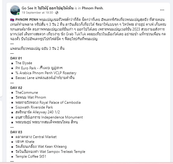 ទំព័រហ្វេសប៊ុកផេកមួយឈ្មោះ Go See It ไปให้รู้ ออกไปดูให้เห็น របស់ប្រទេសថៃ បានមកថតរូបស្អាតៗ នៅរាជធានីភ្នំពេញ ដើម្បីផ្សព្វផ្សាយពីគោលដៅទេសចរណ៍សំខាន់ៗ ប្រសិនបើភ្ញៀវទេសចរបានធ្វើដំណើរកម្សាន្ត មករាជធានីភ្នំពេញ នៃប្រទេសកម្ពុជា។ ទំព័រហ្វេសប៊ុកផេកមួយនេះ មានអ្នកចុចតាមដានប្រមាណជាង ១០ម៉ឺននាក់ និងបានសរសេររៀបរាប់យ៉ាងលម្អិតថា អ្នកគួរទៅលេងកម្សាន្តនៅកន្លែងណាខ្លះ នៅក្នុងរាជធានីភ្នំពេញ ក្នុងដំណើរកម្សាន្តរយៈពេល ២យប់ ៣ថ្ងៃ។