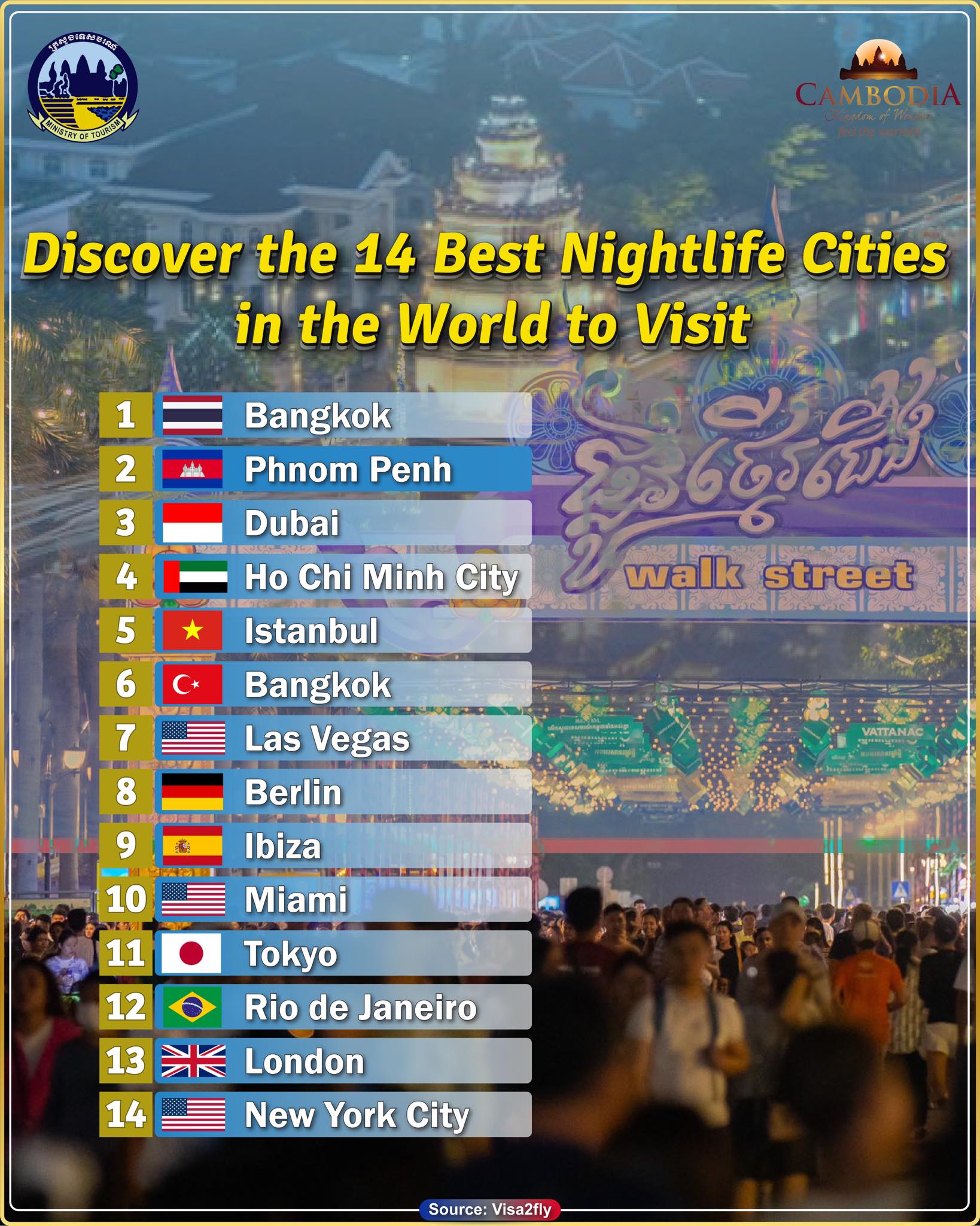 ទីក្រុងភ្នំពេញបានក្លាយជាកន្លែងលម្ហែពេលរាត្រីដ៏ទាក់ទាញដែលឈរនៅលេខរាងលំដាប់ទី២ វ៉ាដាច់ទីក្រុងធំៗនៅជុំវិញពិភពលោក។ នេះបើតាមការបង្ហោះជូនដំណឹងលើផេកផ្លូវការរបស់ក្រសួងទេសចរណ៍មុននេះបន្តិច។