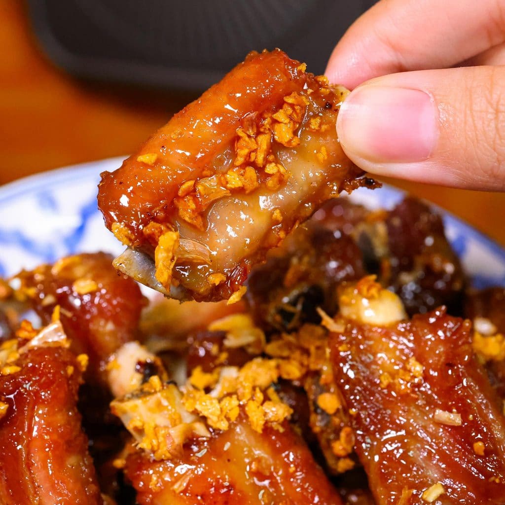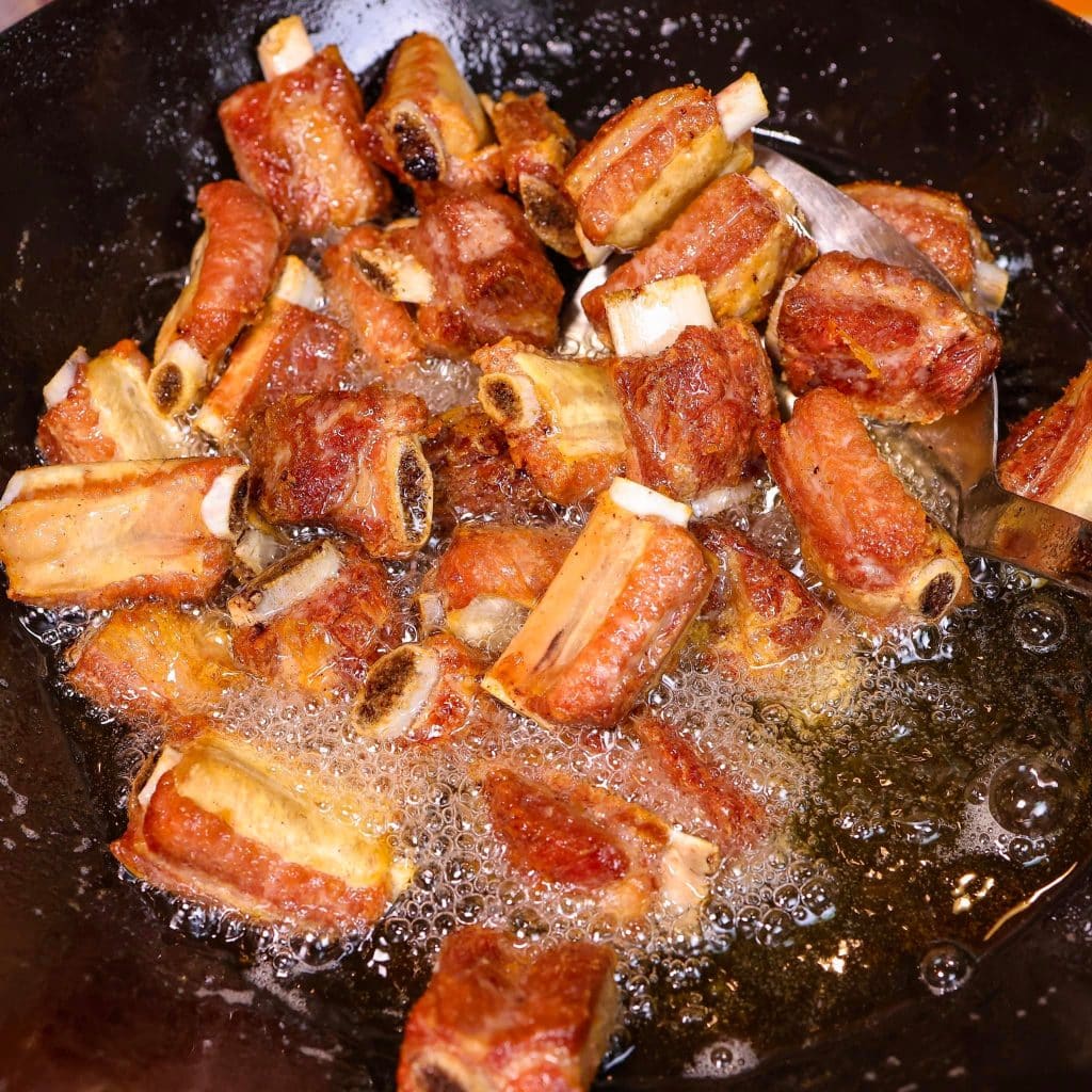 – ដួសឆ្អឹងជំនីរទុកឲ្យស្រស់ខ្លាញ់។ ដាក់ខ្ទឹមសបំពង រហូតដល់ឡើងពណ៌មាសស្រួយ ហើយដួសខ្ទឹមចេញ ហើយចាក់ប្រេងចេញពីខ្ទះ។