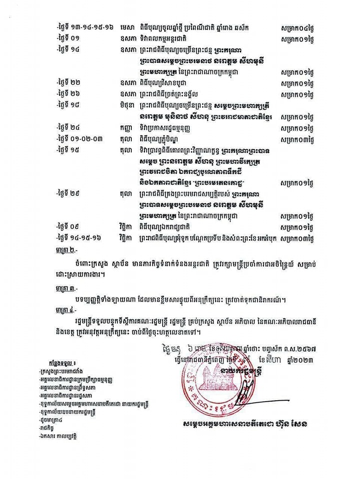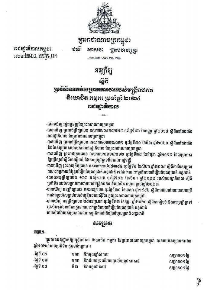ប្រមុខរាជរដ្ឋាភិបាលកម្ពុជា បានវចេញសេចក្ដីប្រកាសស្ដីពីប្រតិទិន ឈប់សម្រាកសម្រាប់ឆ្នាំ ២០២៤ ហើយ ។ នេះបើតាមអនុក្រឹត្យស្ដីពី ប្រតិទិនឈប់សម្រាក របស់មមន្ត្រីរាជការ នយោជិត កម្មករ ប្រចាំឆ្នាំ ២០២៤។ បើយោងតាមប្រតិទិនឈប់សម្រាកប្រជាជនកម្ពុជា មានថ្ងៃឈប់សម្រាកសរុប ២២ ថ្ងៃ។ ដើម្បីលម្អិតសូមមើលអនុក្រឹត្យចេញដោយរាជរដ្ឋាភិបាលកម្ពុជា ដូចខាងក្រោម៖