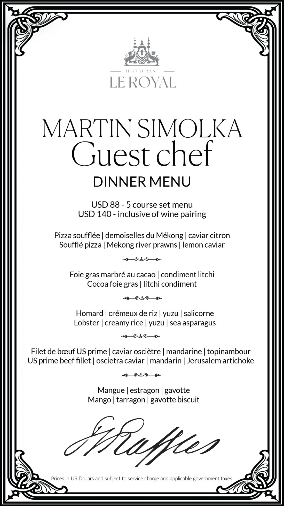 ការបង្ហាញខ្លួនរបស់មេចុងភៅ Martin នៅសណ្ឋាគារ Raffles Hotel Le Royal គឺជាមុខម្ហូបចុងក្រោយបង្អស់នៅក្នុងស៊េរីធ្វើម្ហូបដ៏គួរឱ្យកត់សម្គាល់របស់សណ្ឋាគារ។ មិនត្រឹមតែប៉ុណ្ណោះ Restaurant Le Royal នឹងអញ្ចើញមេចុងភៅល្បីផ្សេងៗទៀត ជារៀងរាល់ខែដើម្បីបង្ហាញនូវមុខម្ហូបដល់វិសេសវិសាលសម្រាប់លោកអ្នក។