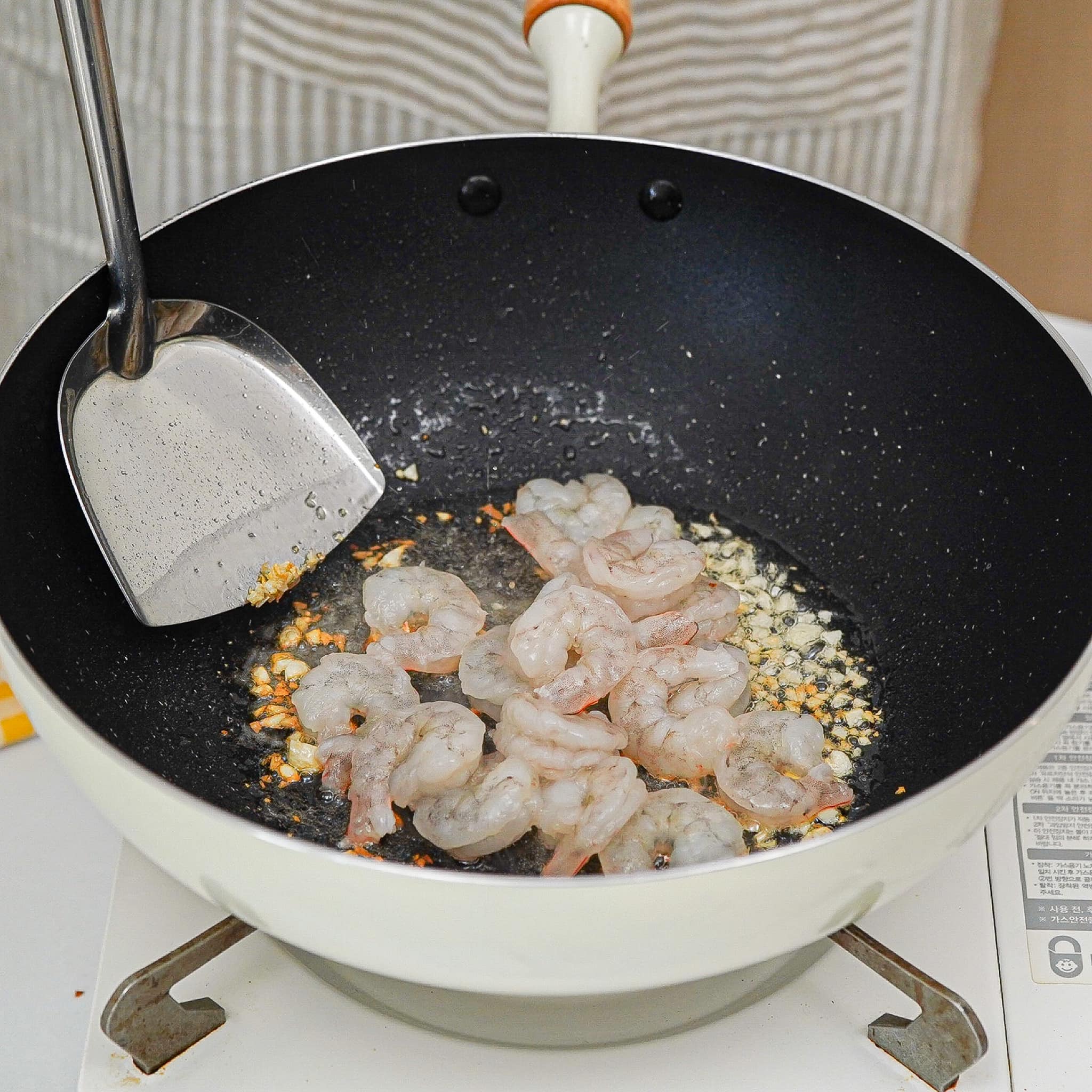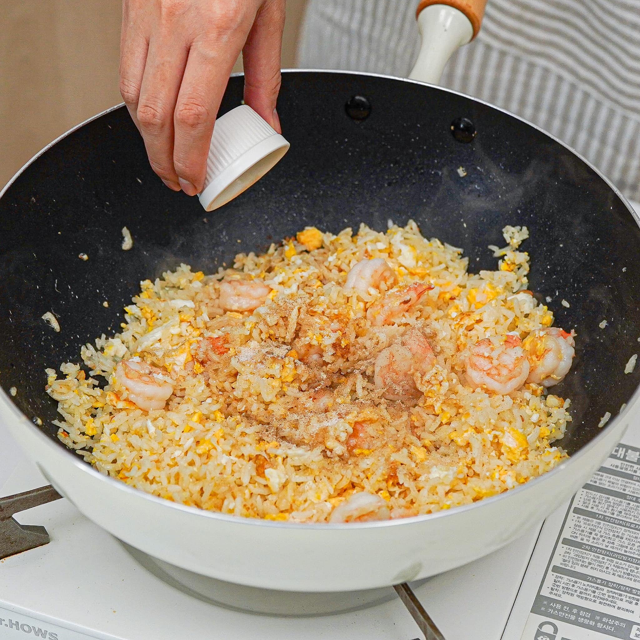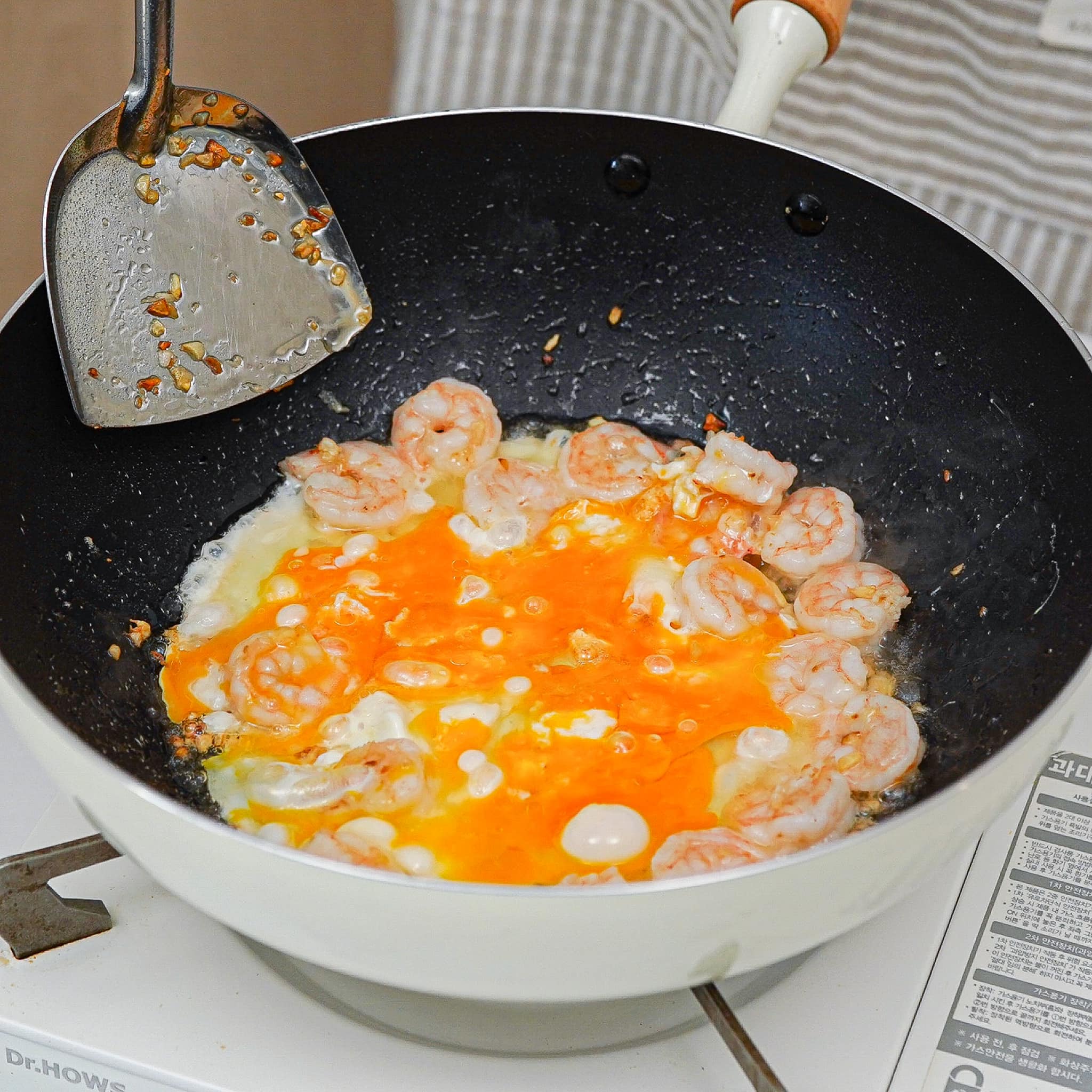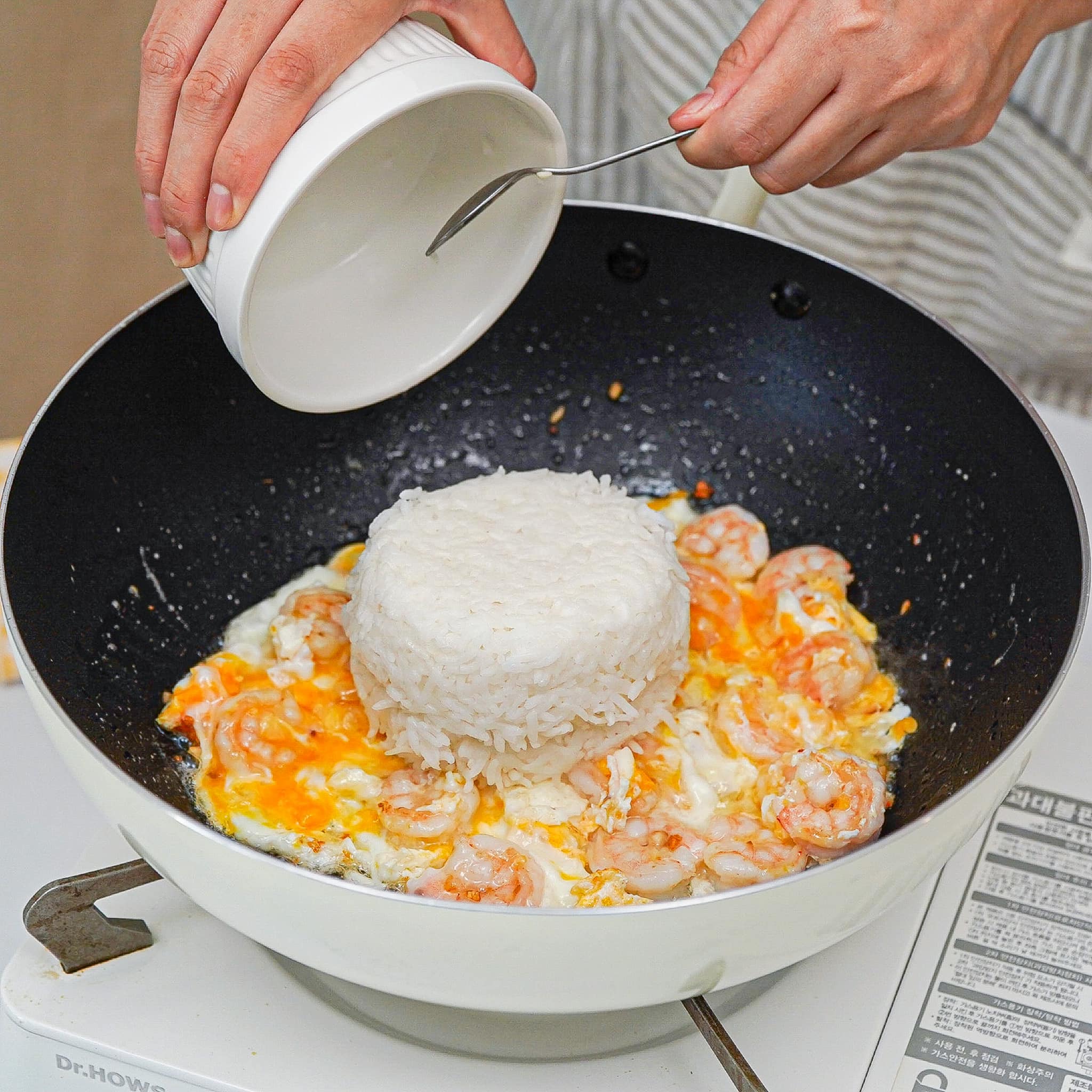 ២. បន្ទាប់គោះពងមាន់ឆាបន្តិច រួចចាក់បាយចូលហើយឆាម្ដងទៀត។