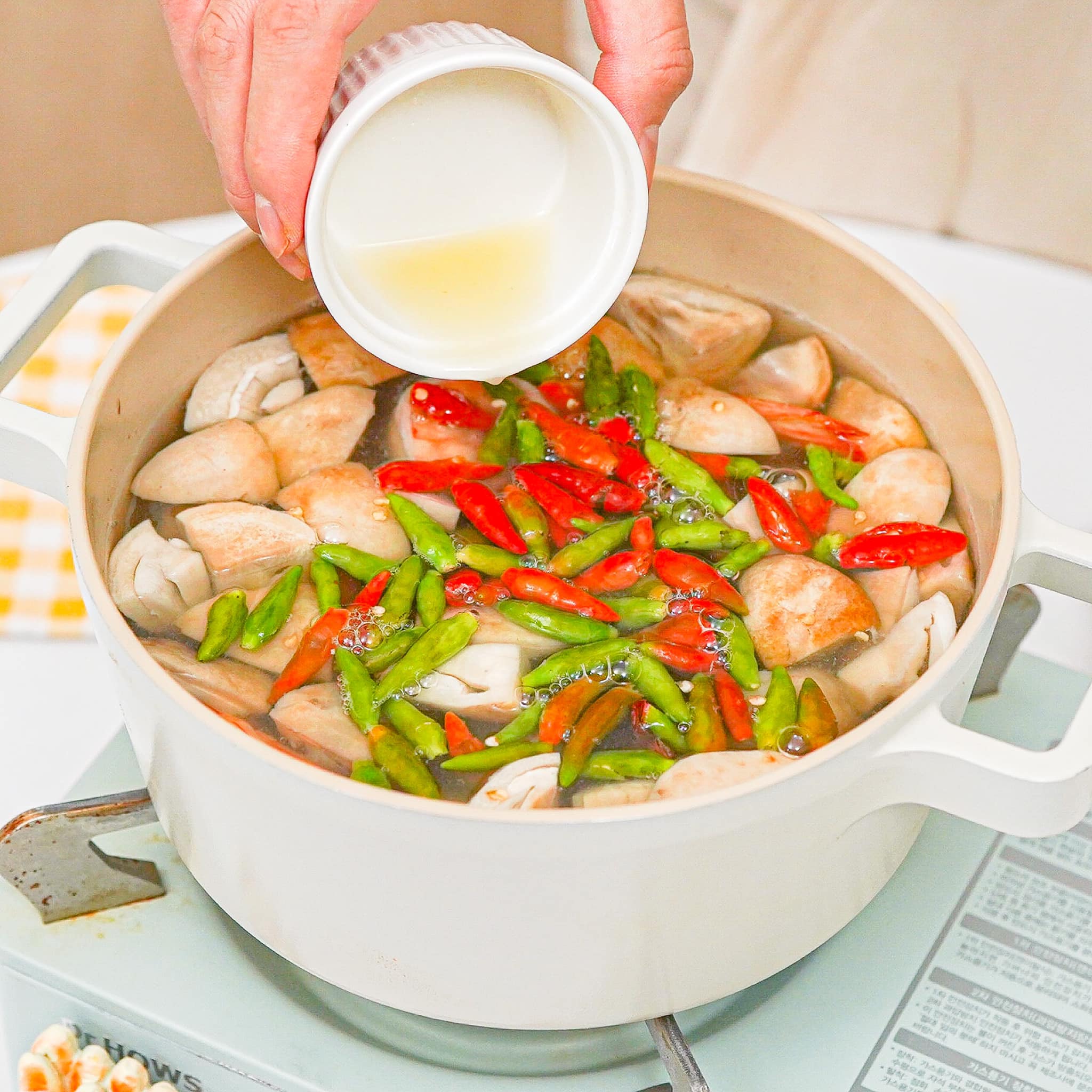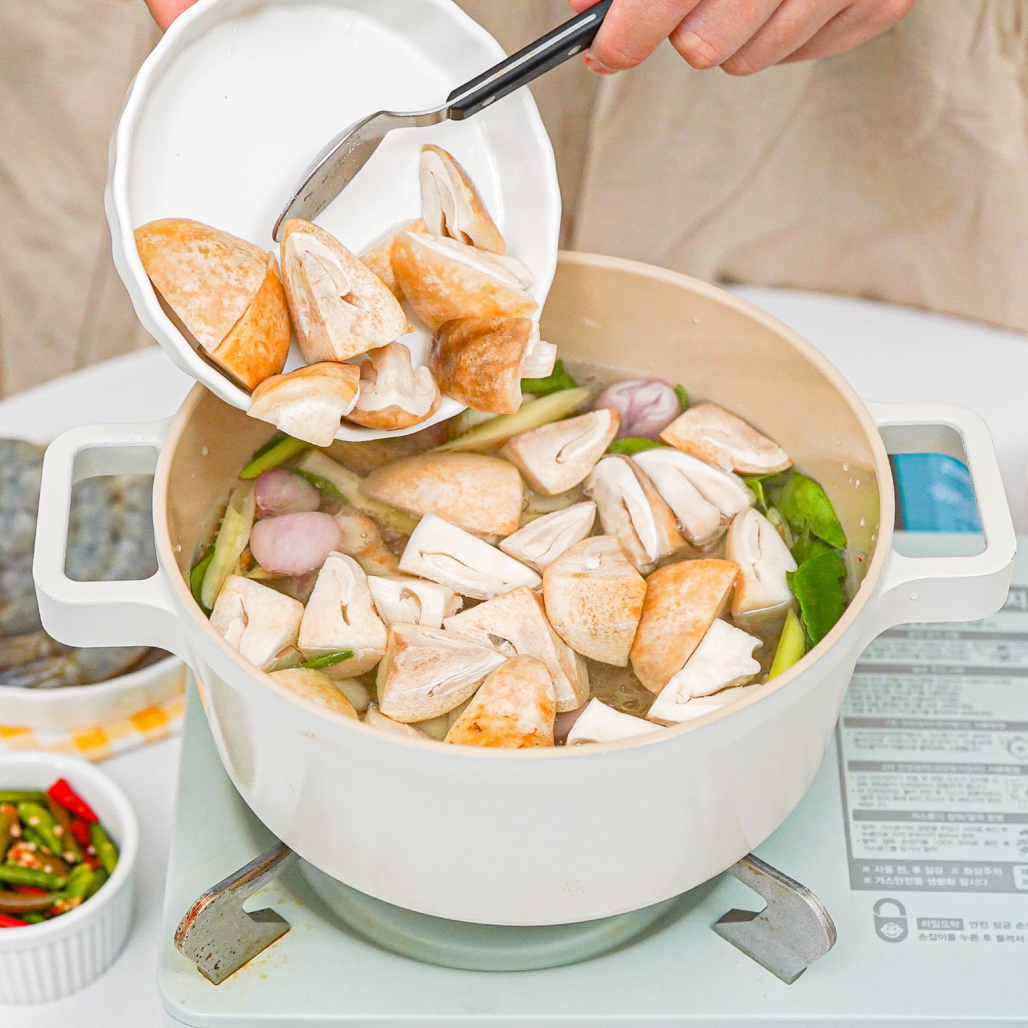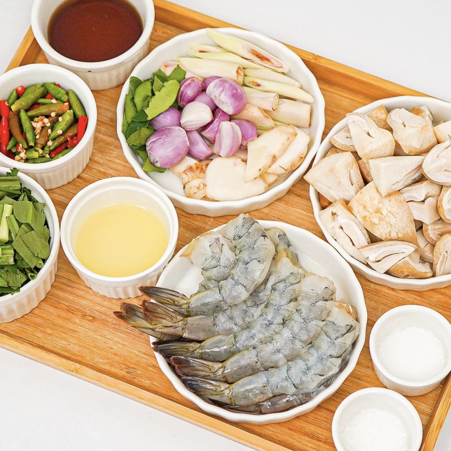 ១. ដំបូងដាក់ដាំទឹកឱ្យពុះហើយដាក់គល់ស្លឹកគ្រៃ រំដេង ខ្ទឹមក្រហម ស្លឹកក្រូចសើចចូលកូរបន្តិចសឹមបង់អំបិល ស្ករស និងទឹកត្រី។ បន្ទាប់មកភ្លក់មើលល្មមហើយត្រូវដាក់ផ្សិតចូល។