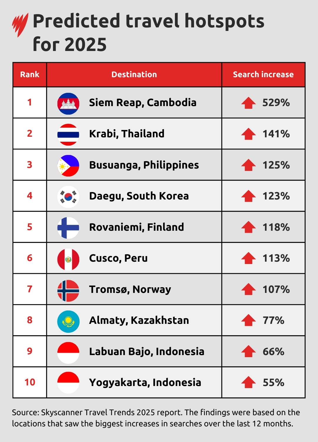 តាមរយៈសារព័ត៌មាន SBS អូស្រ្តាលី បានឱ្យ​ដឹង​ថាកន្លង​មកប្រទេស​ជប៉ុន​ត្រូវ​បាន​ស្ថិត​នៅ​លំដាប់​ថ្នាក់​ខ្ពស់​បំផុត​នៅ​ក្នុង​បញ្ជី​ទិសដៅ​ទេសចរណ៍​ដ៏​ពេញ​និយម​របស់​ប្រជាជនអូស្រ្តាលី​។​ ដោយ​ឡែក​ តាមការបង្ហាញនៅក្នុងរបាយការណ៍ Skyscanner Travel Trend 2025 ​តំបន់​ទេសចរណ៍​ខេត្ត​សៀមរាប​របស់​កម្ពុជា ​បាន​ឈរ​នៅ​លំដាប់​លេខរៀងទី១ ខ្ពស់​បំផុត​សម្រាប់​ទិសដៅ​ទេសចរណ៍​របស់​ប្រជាជន​​អូស្ត្រាលីក្នុងឆ្នាំ ២០២៥ ​ដោយ​មាន​អត្រា​អ្នក​ចុច​ស្វែង​រក​​រហូត​ដល់ ​៥២៩ ​ភាគរយ​។ ​​ស្ថិត​ក្នុង​អត្រា​កំណើន​ដ៏​ខ្ពស់​នេះ​ដែរ​បាន​ធ្វើ​ឱ្យ​តំបន់​ទេសចរណ៍​របស់​កម្ពុជា​មួយ​នេះ​​វារ​ដាច់​តំបន់​ទេសចរណ៍​ក្នុង​បណ្ដា​ប្រទេសចំនួន​ដូច​ជា​ ប្រទេស​ថៃ​ ​ហ្វីលីពីន​ កូរ៉េ​ខាង​ត្បូង ហ្វាំងឡង់​ ប៉េរូ​ ន័រវែស​ កាហ្សាក់ស្ថាន​ និង​ប្រទេស​ឥណ្ឌូណេស៊ី​។​