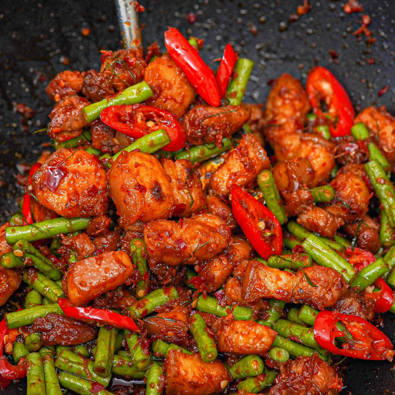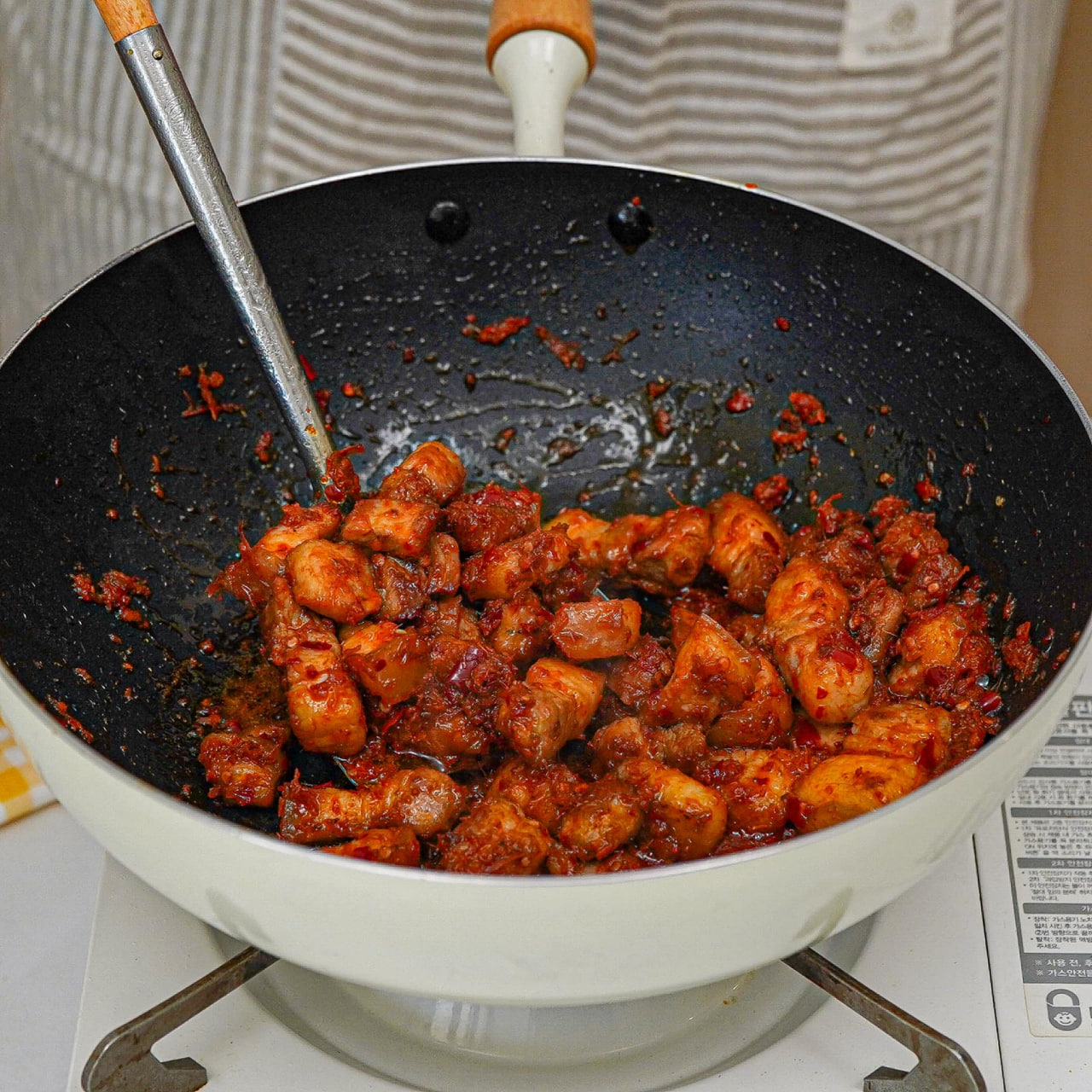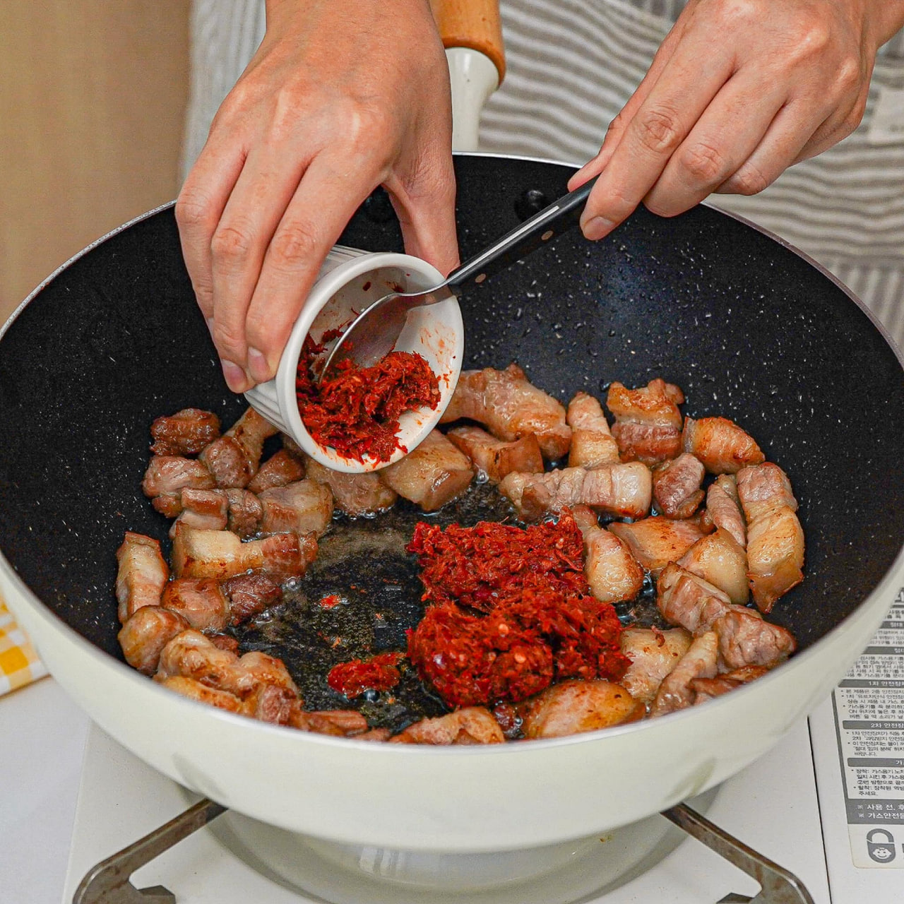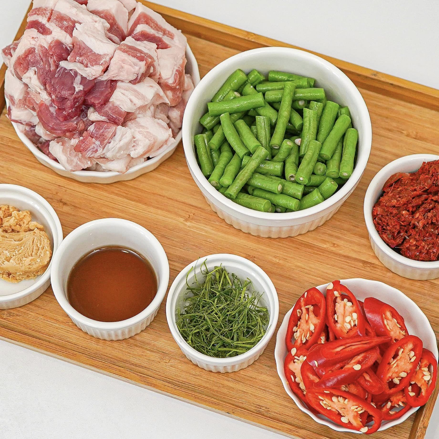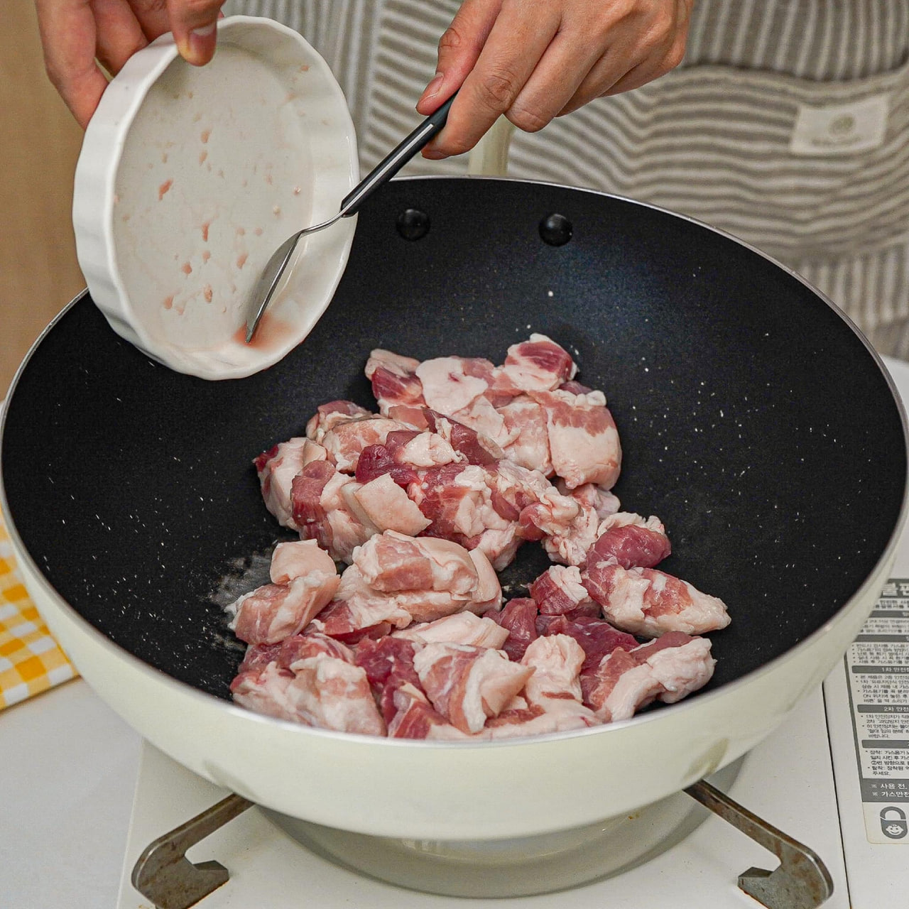 ១. ដំបូងដាក់រំលីងសាច់ជ្រូកឱ្យឆ្អិនអនហើយក្រៀមបន្តិចសិន។