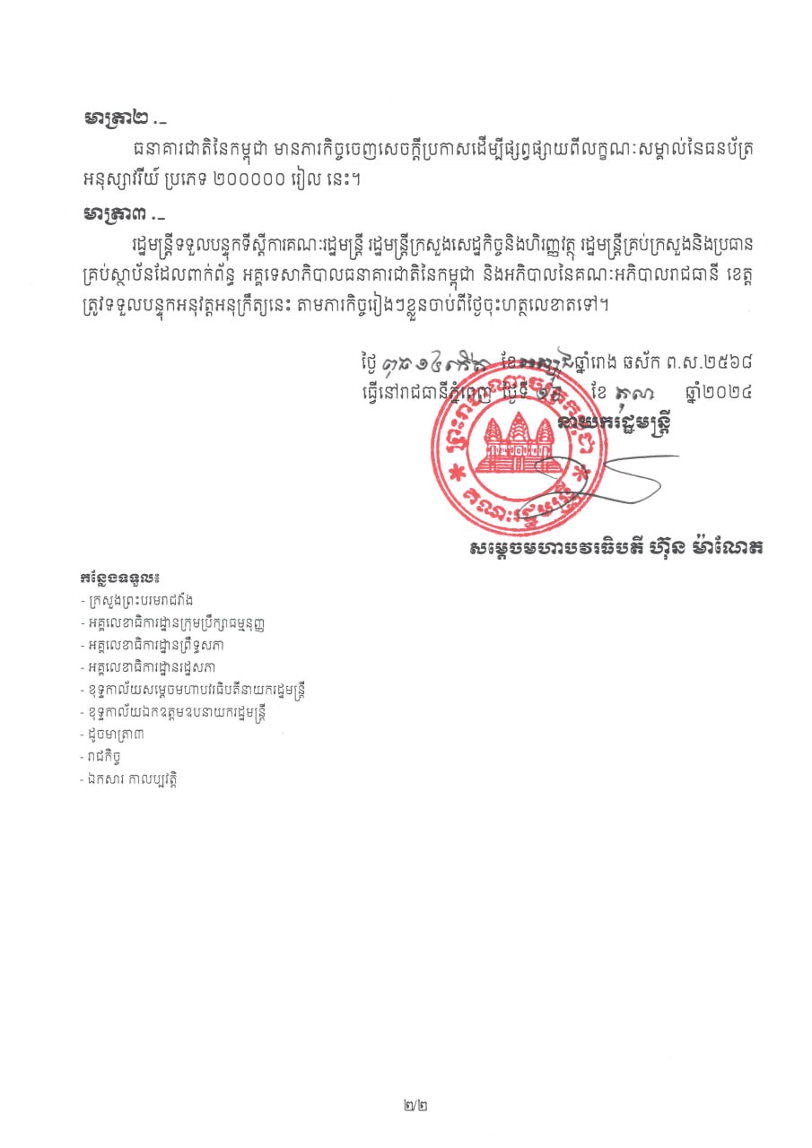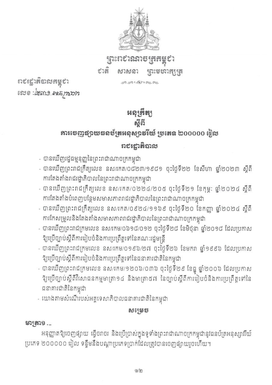 យោងតាមអនុក្រឹត្យរបស់សម្តេចបវរធិបតី ហ៊ុន ម៉ាណែត ប្រមុខរាជរដ្ឋាភិបាល ចេញផ្សាយនៅថ្ងៃទី១៦ ខែតុលា ឆ្នាំ ២០២៤ រាជរដ្ឋាភិបាលកម្ពុជា បានអនុញ្ញាតឲ្យចេញផ្សាយ ធ្វើចរាចរ និងប្រើប្រាស់ក្នុងទូទាំងព្រះរាជាណាចក្រកម្ពុជា នូវធនប័ត្រអនុស្សាវរីយ៍ប្រភេទថ្មី២០០០០០រៀល ទន្ទឹមនឹងបណ្តាប្រភេទប្រាក់ដែលត្រូវបានចេញផ្សាយរួចហើយ។