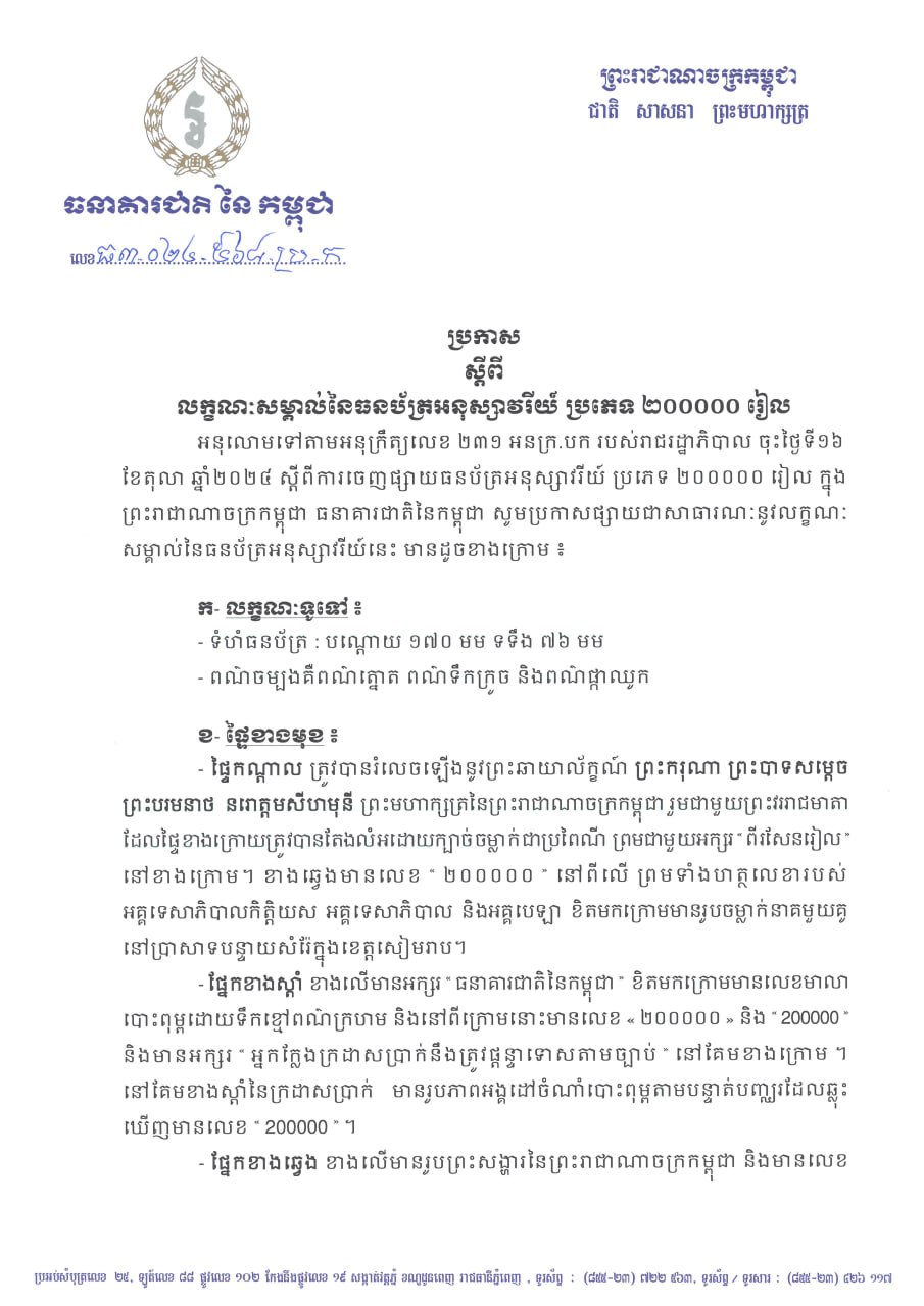 សូមអានប្រកាសខាងក្រោមបន្ថែមសម្រាប់លម្អិតនូវលក្ខណៈសម្គាល់នៃធនប័ត្រក្រដាសប្រាក់២សែនរៀល។