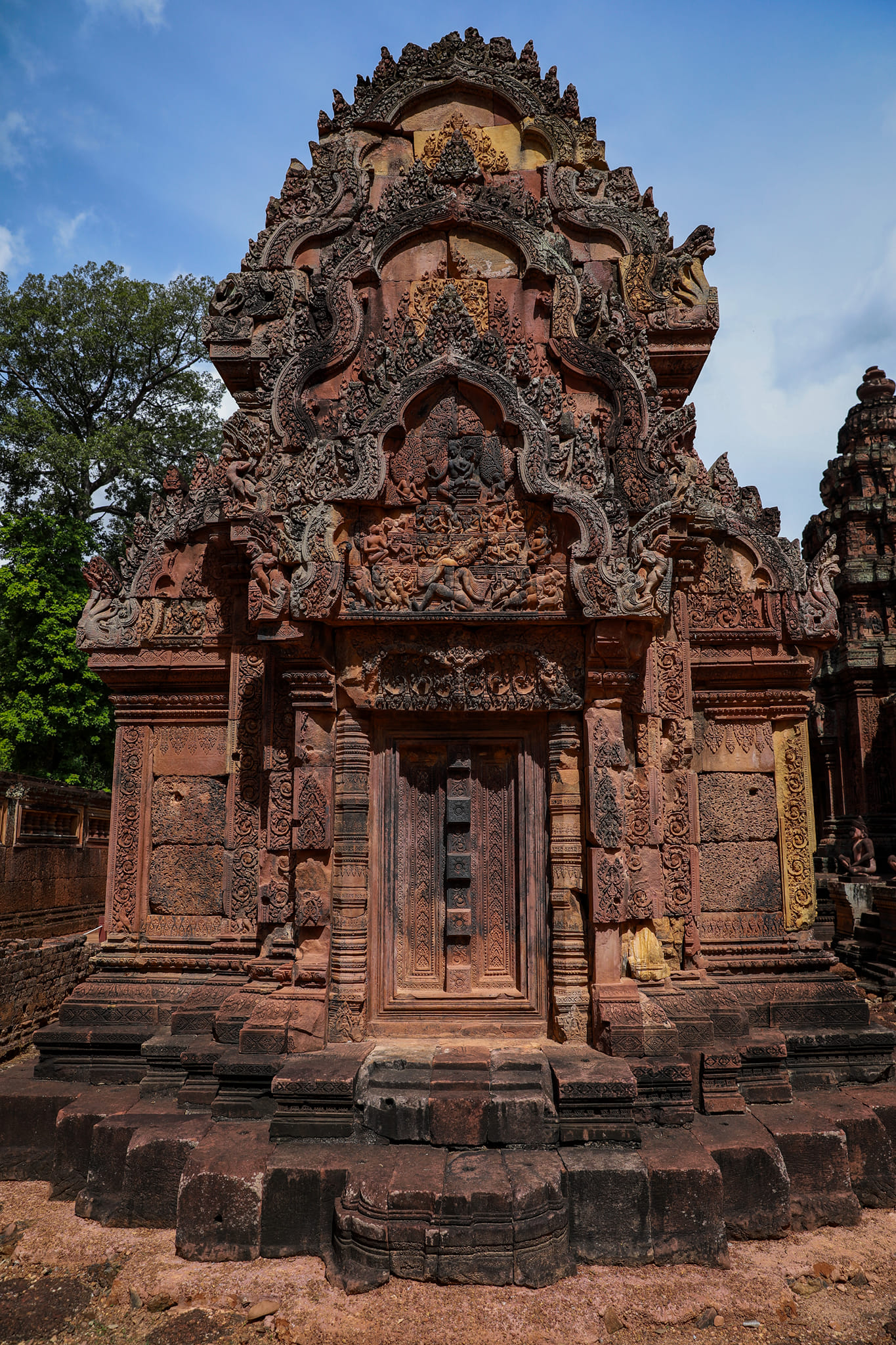 ប្រសិនក្រឡេកមួយភ្លែត អ្នកប្រាកដជាគិតថា ជាចម្លាក់ដែលឆ្លាក់លើដីឥដ្ឋ ឬលើឈើ ព្រោះថាចម្លាក់នៅលើប្រាសាទបន្ទាយស្រី មានលក្ខណៈលម្អិតជ្រៅ ដែលមើលទៅស្ទើរតែមិនជឿថាជាចម្លាក់នៅផ្ទាំងថ្ម។ នៅលើប្រាង្គប្រាសាទទាំងមូល ថ្មភក់ពណ៌ «ផ្កាឈូក» ត្រូវបានប្រើជាសសរ គ្រោងទ្វារបង្អួច ជើងទៀន ផ្ដែរ ហោជាង រីឯស្រទាប់ខាងក្រៅនៃតួប៉មទាំងបីក៏មានការប្រើប្រាស់ថ្មបាយក្រៀម ក្នុងការសាងសង់កំពែង លាន ខ្លោងទ្វារ អគាររណប និងស្រទាប់ទី២នៃតួប៉មទាំង ៣ ផងដែរ។ ប្រាសាទដែលសាងសង់ពីថ្មភក់ពណ៌ «ផ្កាឈូក» មួយនេះ ត្រូវបានអ្នកទេសចរបរទេសកោតសរសើរមិនដាច់ពីមាត់នូវសម្រស់ដ៏ស្រស់ស្អាត បើទោះបីជាប្រាសាទមួយនេះមានបរិវេណរាងតូចបន្តិច តែទ្រង់ទ្រាយប្រាសាទលម្អទៅដោយចម្លាក់ផ្កាភ្ញី នៃរឿងរ៉ាវទាក់ទងទៅនិងលទ្ធិទេវរាជ «រឿងរាមកេរ្តិ៍ខ្មែរ» មិនត្រឹមតែប៉ុណ្ណោះចម្លាក់នីមួយៗសុទ្ធតែមានលក្ខណៈរស់រវើកយ៉ាងល្អឯក។