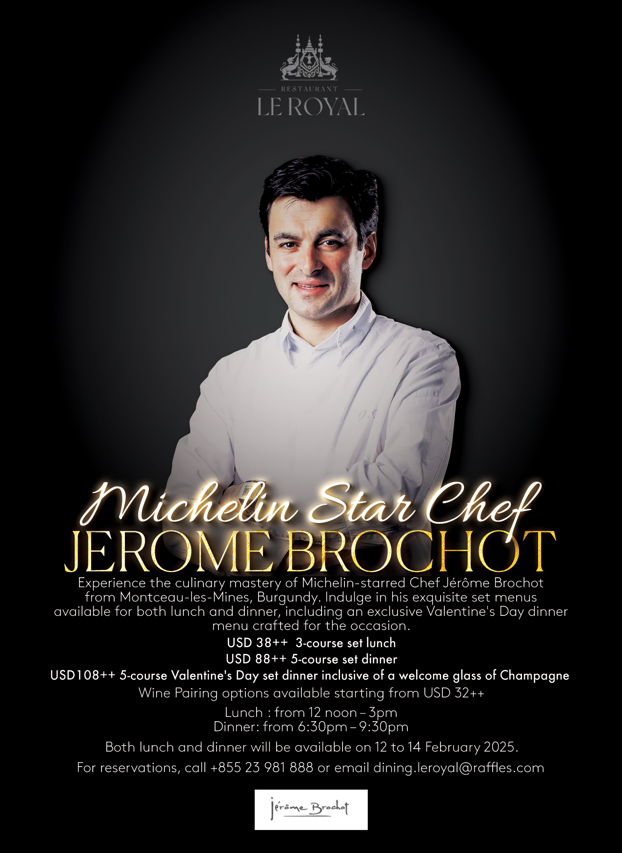 នេះជាឱកាសដ៏ពិសេសមួយ សម្រាប់អ្នកទាំងអស់គ្នា អាចនាំក្រុមគ្រួសារ មនុស្សជាទីស្រឡាញ់ទៅសាករសជាតិម្ហូបអាហារ ដែលចម្អិនដោយចុងភៅជនជាតិបារាំងលំដាប់ Michelin គឺលោក Jerome Brochot។ ក្នុងនោះដែរ នឹងរៀបចំអាហារពេលល្ងាច និងអាហារថ្ងៃត្រង់ដ៏ពិសេសជាច្រើនមុខ នៅសណ្ឋាគារ Raffles Hotel Le Royal ចាប់ពីថ្ងៃទី ១២ ដល់ ១៤ ខែកុម្ភៈ ជាពិសេសនោះអាហារពេលល្ងាចដ៏រ៉ូមែនទិកក្នុងថ្ងៃបុណ្យនៃក្តីស្រលាញ់។