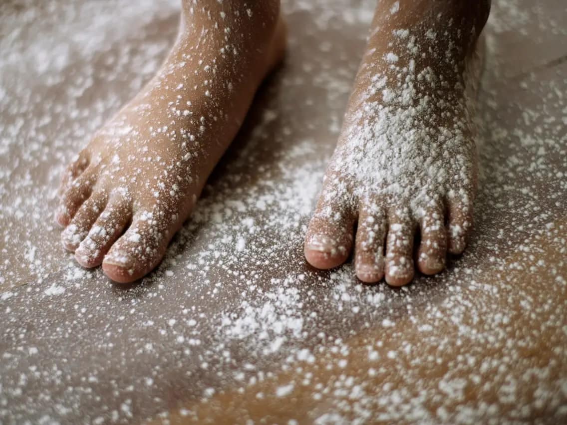 ក្រោយពេលសម្អាតជើងស្ងួតហើយ យើងយកម្សៅលាបខ្លួនមកលាបលើជើងដើម្បីស្រូបនូវជាតិសំណើម។ ប្រសិនបើយើងផ្អាប់ជាតិសំណើមនេះច្រើនអាចធ្វើឱ្យជើងយើងបែកញើសហើយបណ្ដាលឱ្យមានក្លិនមិនល្អតែម្ដង។ ក្រៅពីម្សៅលាបខ្លួន យើងក៏ប្រើម្ដៅ baking soda ម្សៅពោត ឬអំបិលស្រ្កាប់ក៏បានដែរ។