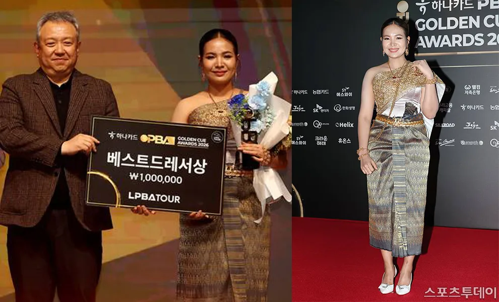 កីឡាការិនី ស្រួង ភាវី ស្លៀកឈុតប្រពៃណីខ្មែរ «ស្បៃ» យ៉ាងស្រស់ស្អាត ចូលរួមកម្មវិធីប្រគល់ពានរង្វាន់នៅកូរ៉េ