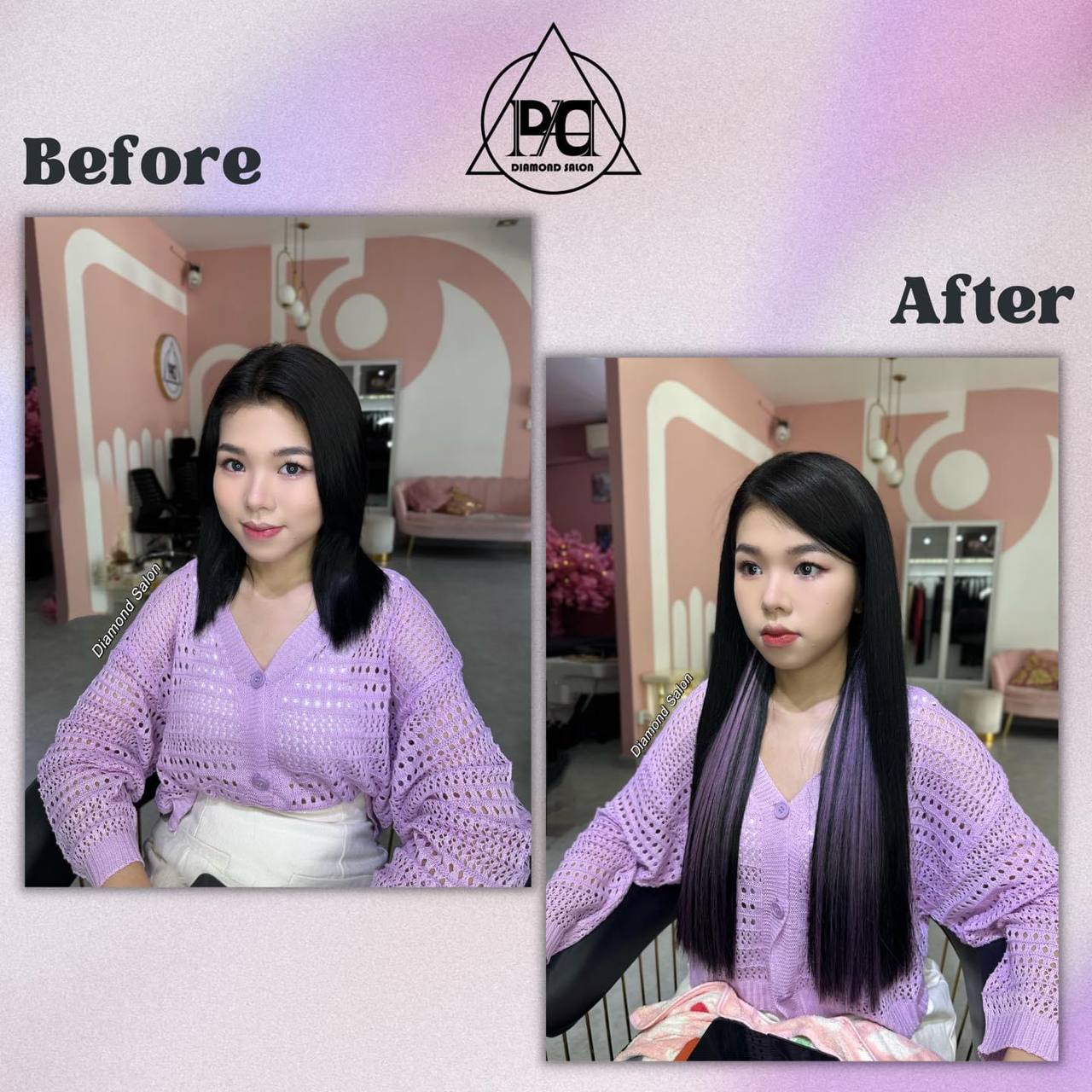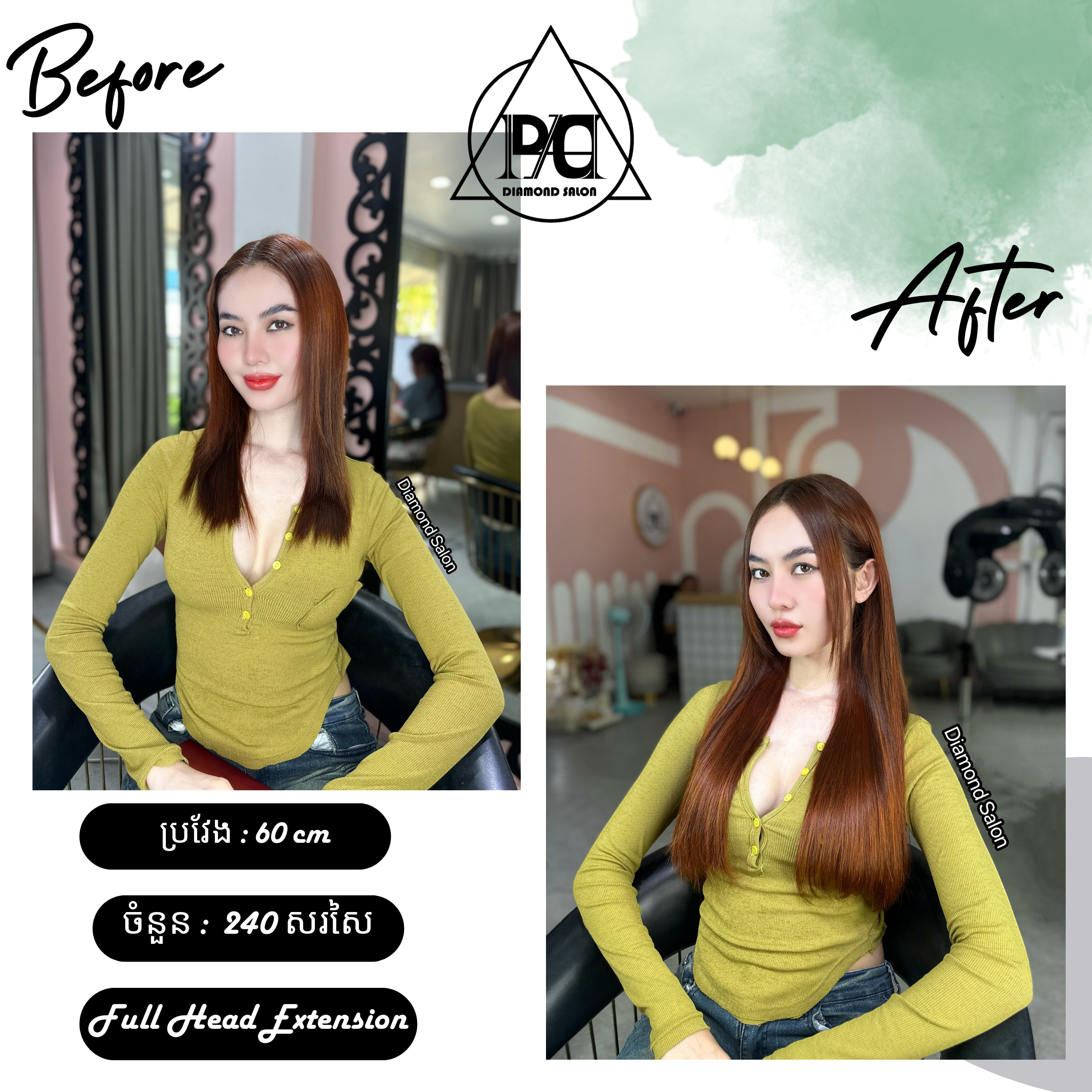 មួយវិញទៀតអ្នកស្រីដឹងថាយុគសម័យថ្មីនេះ ការនិយមផ្លាស់ប្តូរស្ទាយ និងម៉ូតសក់មិនមែនជារឿង ថ្មីដែលត្រូវភ្ញាក់ផ្អើលនោះទេ។ លំហូរទៅមកនៅលើឆាកអន្តរជាតិ នាំឲ្យយើងអាចមើលឃើញ ការអភិវឌ្ឍន៍គំនិតឆ្នៃប្រឌិដ្ឋម៉ូដ និងស្ទាយសក់ បែប Fashion របស់ Diamond Salon ជូនចំពោះសុភាព នារីគ្រប់រូបទៅតាម ចំណង់ចំណូលចិត្ត ឬទៅតាមនិមិត្តរូប (Idol) ដើម្បីបន្ថែមភាព ស្រស់ស្អាត ទាន់សម័យកាល និងភាពជឿជាក់ជាងមុនទ្វេដងផងដែរ។ គ្រឹះក្នុងការផ្លាស់ប្តូរស្ទាយសក់របស់ Diamond Salon គឺផ្តល់ជូនភ្ញៀវនូវបទពិសោធន៍ នៃការថែរក្សាសសៃសក់ថ្មីល្អឯកប្រកបដោយ ទំនួលខុសត្រូវជាមួយសេវាកម្មដ៏សម្បូរបែបដូចជា ការកាត់ម៉ូដ ការប្តូរពណ៌សក់ ព្យាបាលសក់ ជាដើម និងជាពិសេសគឺសេវាកម្មតបន្ថែមសសៃសក់ឲ្យមើលវែង ក្រាស់ ភ្លឺរលាស់រលោងជាងមុន។
