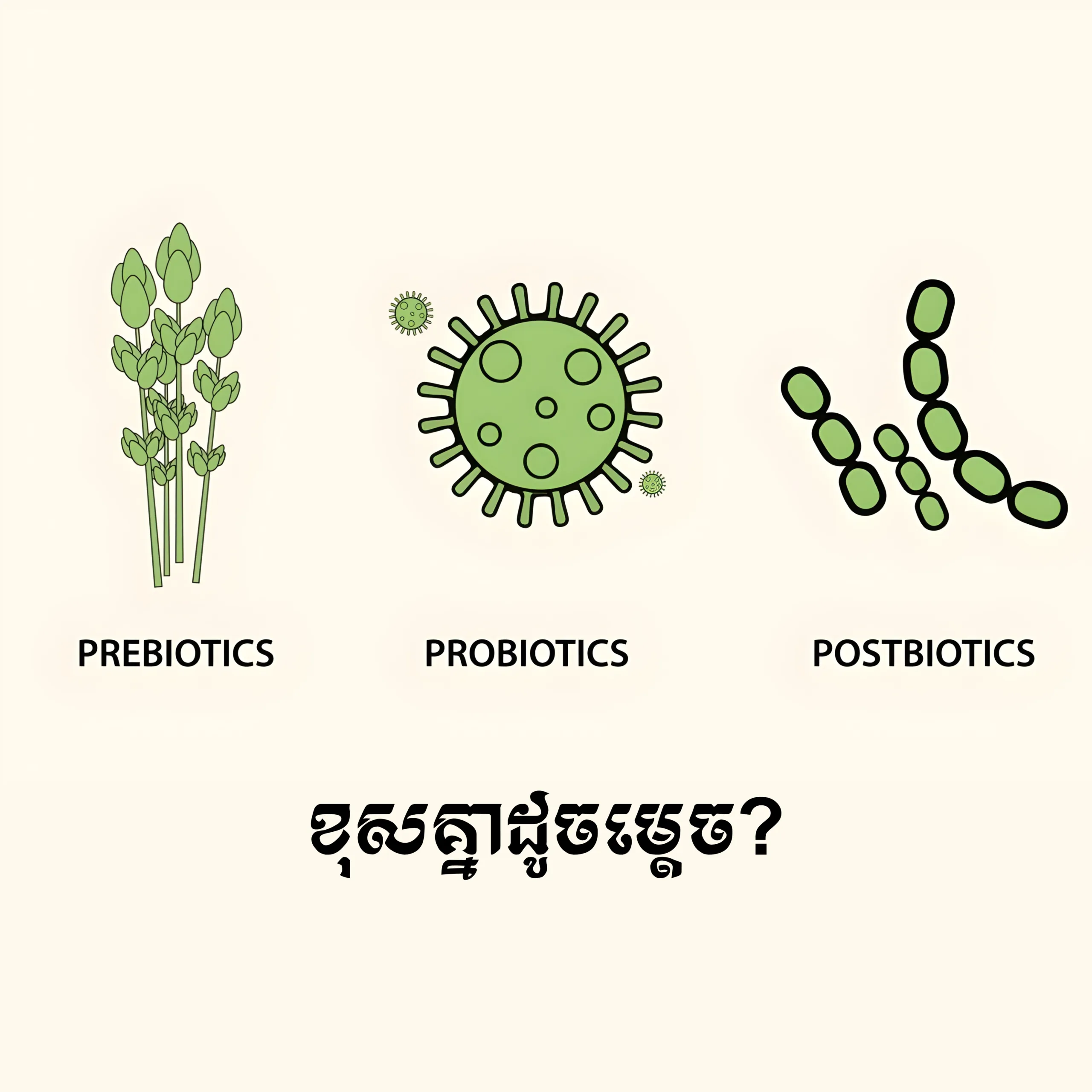 នៅពេលនិយាយអំពីការថែទាំពោះវៀន យើងតែងតែឮពាក្យទាំង ៣ នេះគឺ Prebiotics, Probiotics និង Postbiotics។ ទោះបីជាមានឈ្មោះស្រដៀងគ្នាក៏ពិតមែន ប៉ុន្តែពួកវាមានតួនាទីខុសៗគ្នា តែត្រូវអាស្រ័យគ្នាទៅវិញទៅមកនៅក្នុងរាងកាយរបស់មនុស្ស។