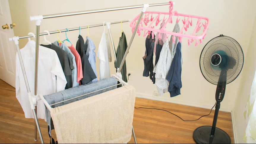 អ្នកគួរជ្រើសរើសហាលសម្លៀកបំពាក់ ​នៅក្នុងបន្ទប់ដែលមានលំហូរខ្យល់ និងមានឱកាសអាចឱ្យពន្លឺថ្ងៃជះចូលដល់។ បន្ថែមពីនេះ អ្នកក៏អាចបើកកង្ហារ ដើម្បីប្រើប្រាស់ខ្យល់ជាជំនួយ ​ឱ្យខោអាវកាន់តែឆាប់ស្ងួតជាងមុន។